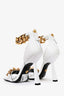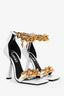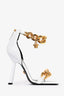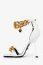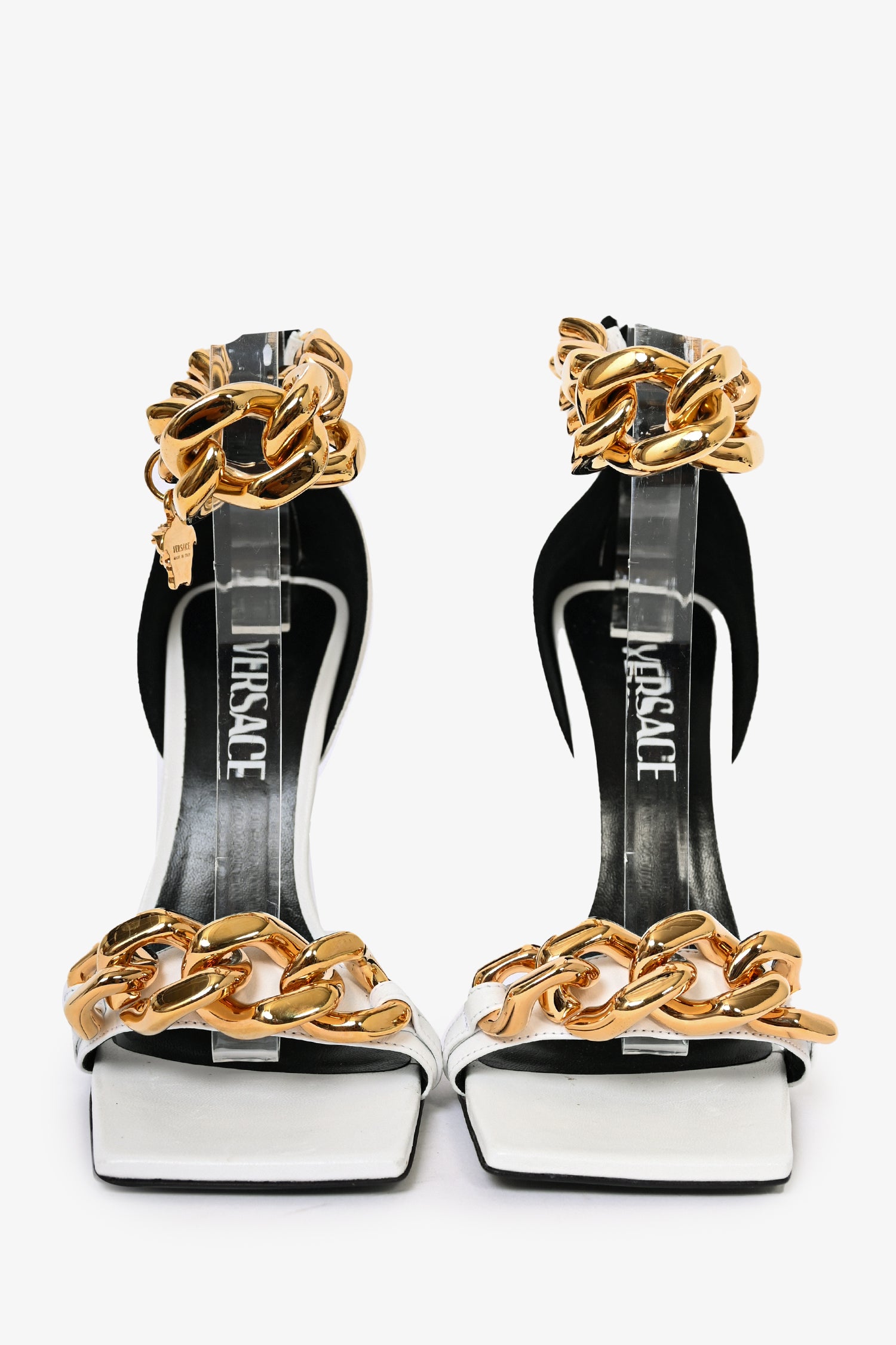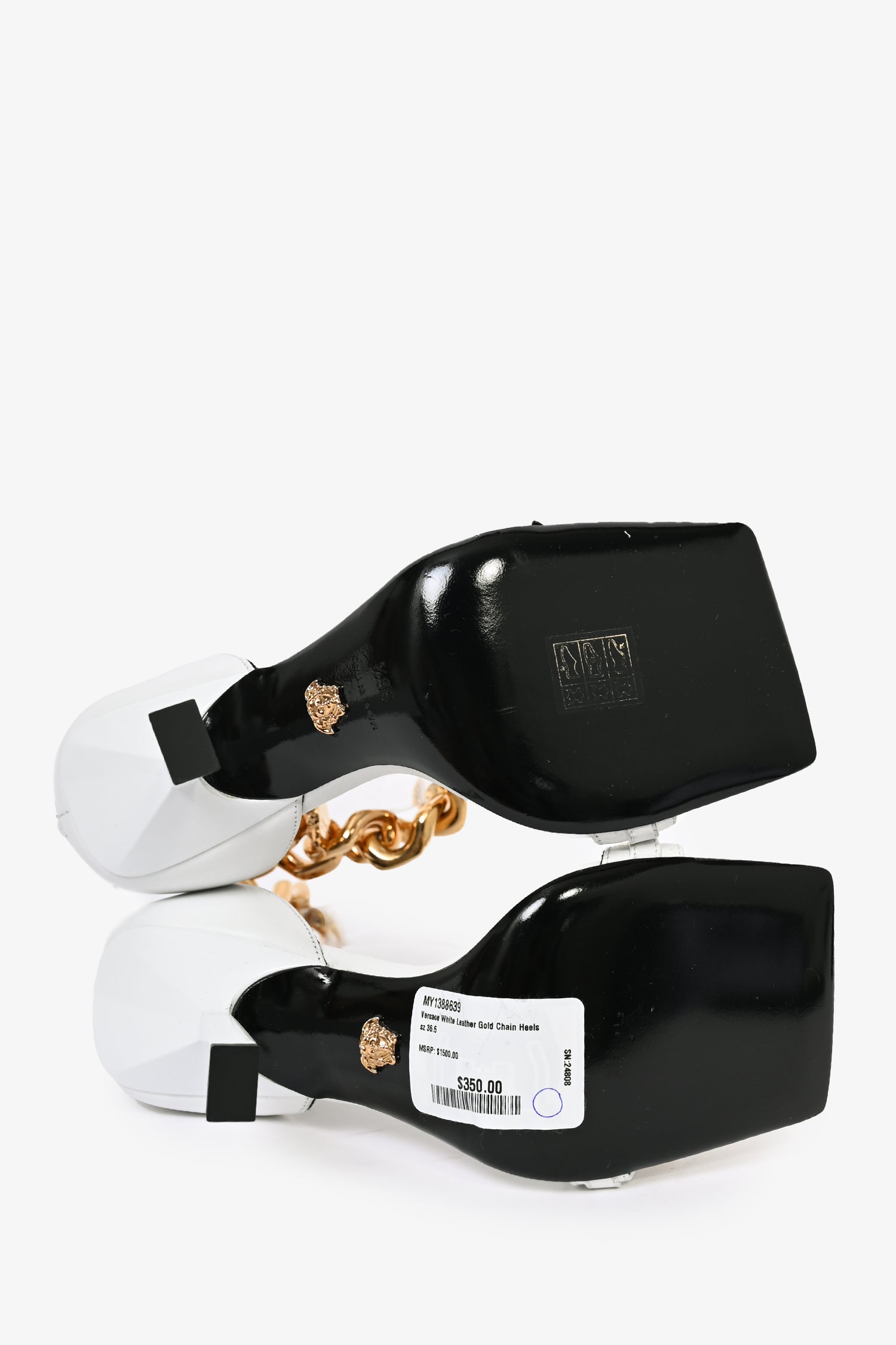 Refresh availabilityVersace White Leather Gold Chain Heels. Square toe front. Leather lined interior. Chain-link gold-tone ankle strap. Tonal stitching.