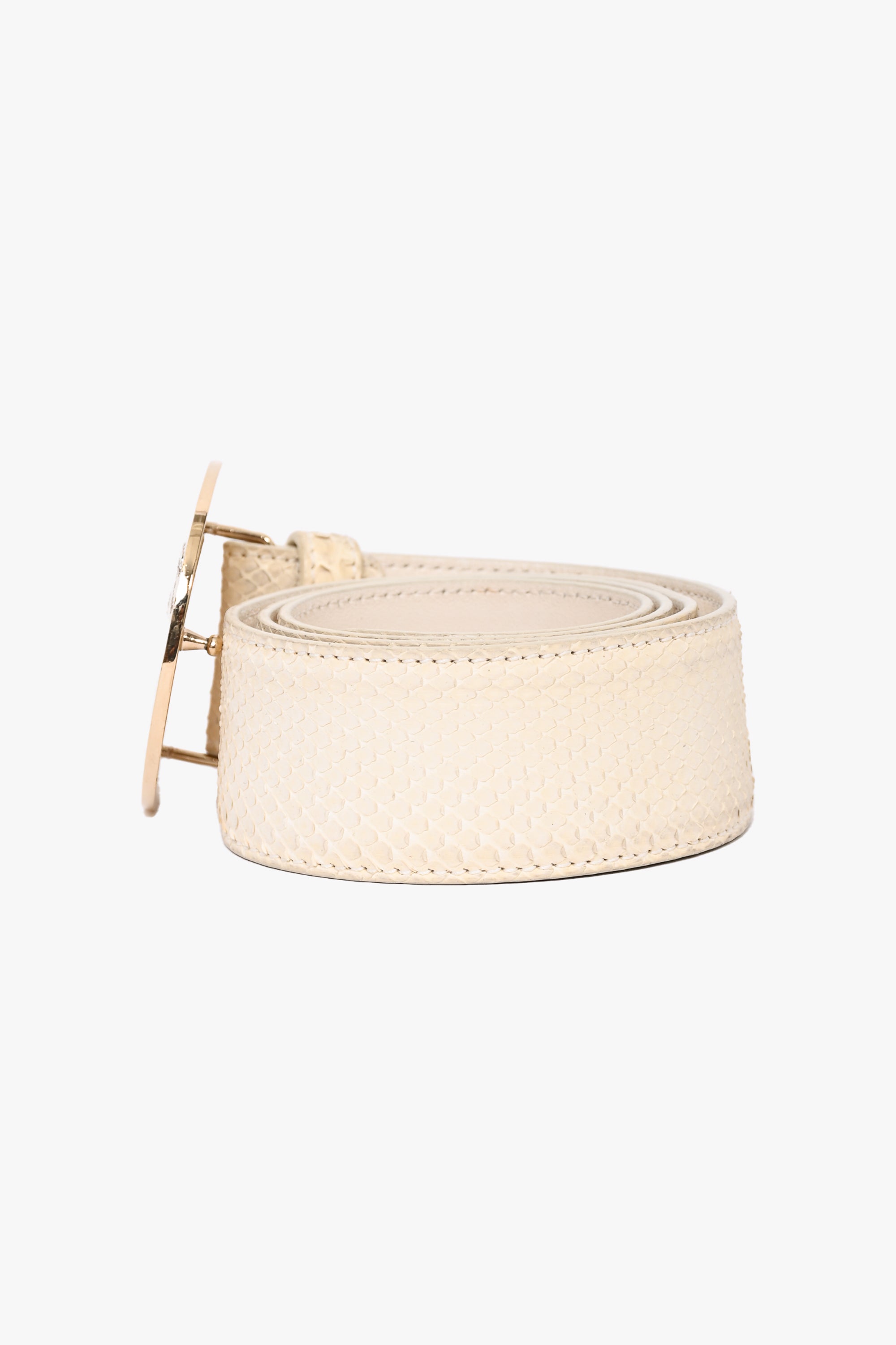 Versace White Python Belt with Medusa Embellished Buckle. Front buckle closure. Tonal stitching.