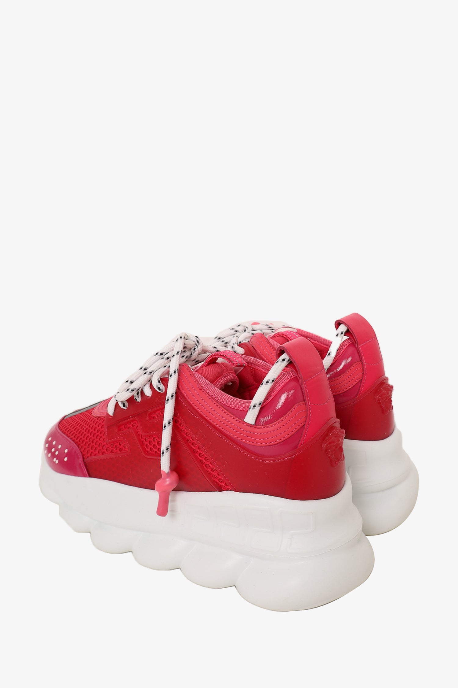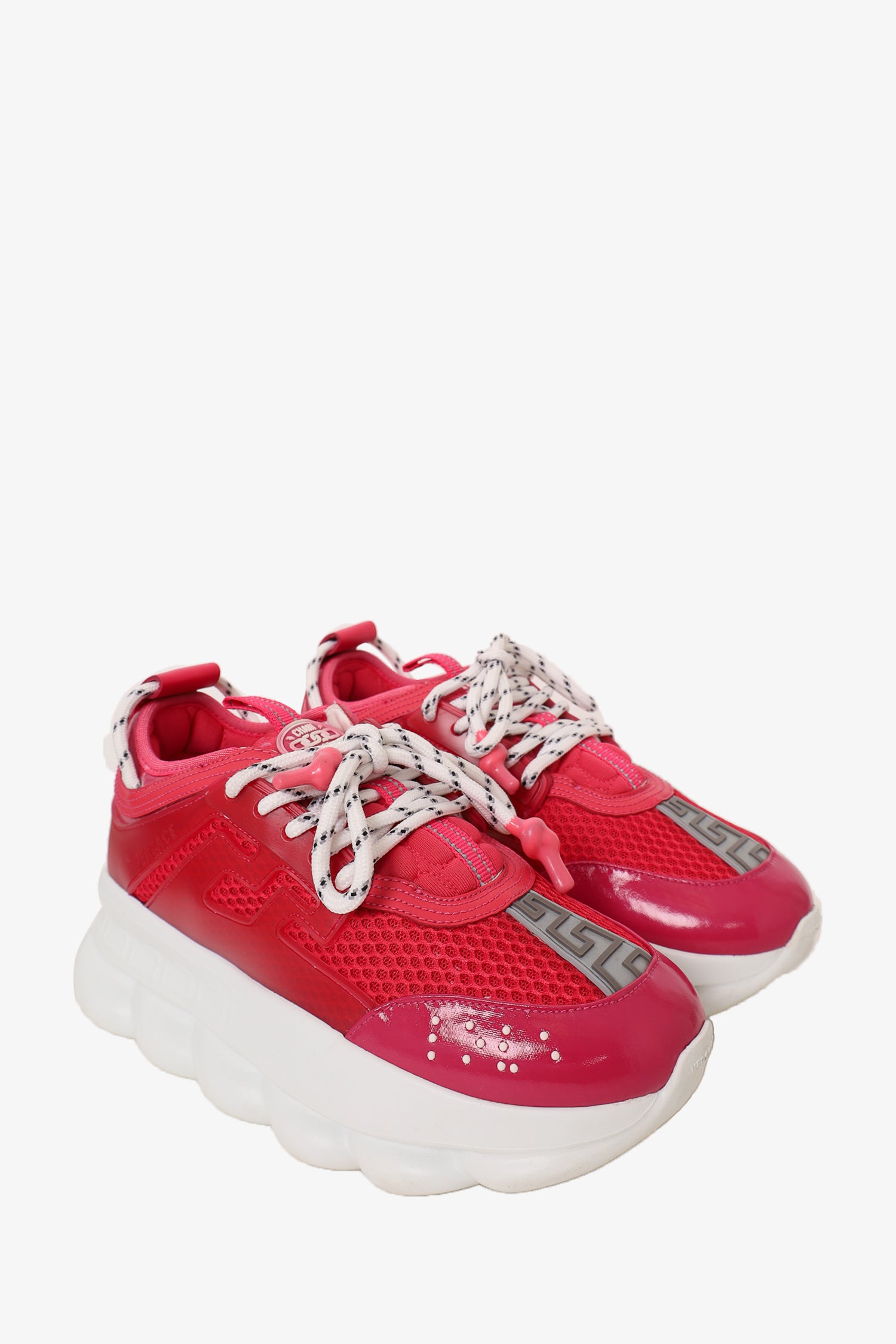 Refresh availabilityVersace x Chain Reaction Pink Sneakers. Front lace closure. Breathable upper. Heel tab. Tonal stitching.