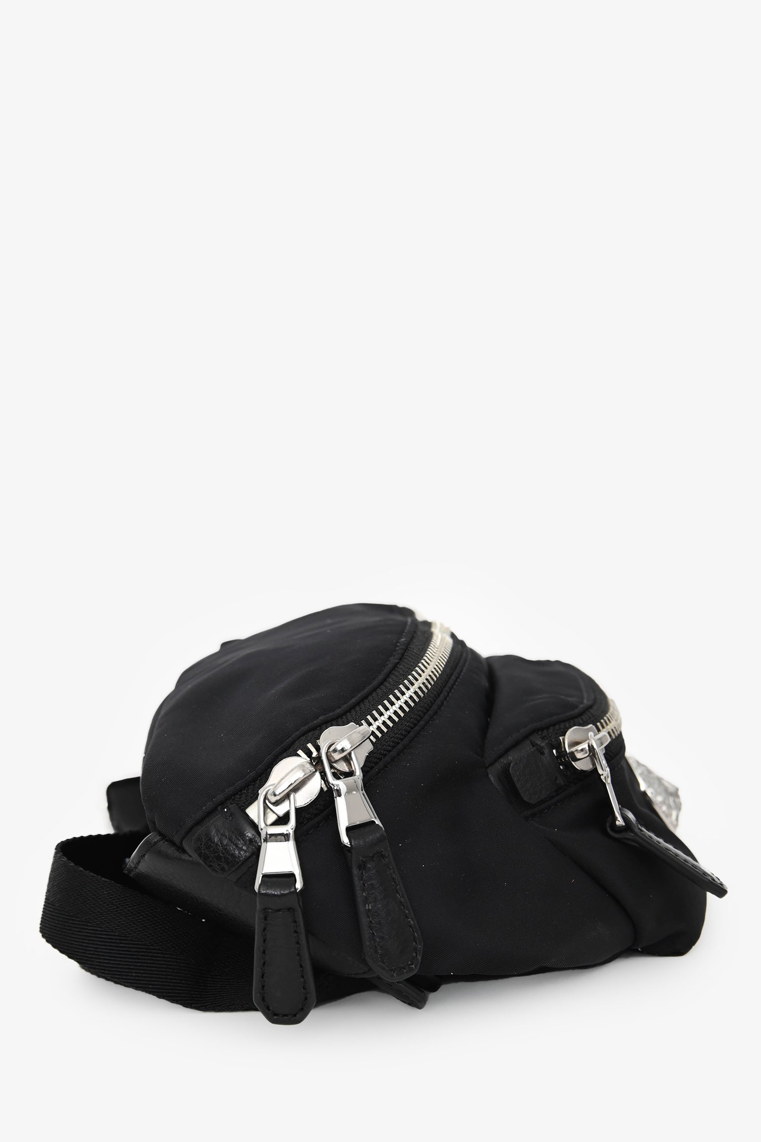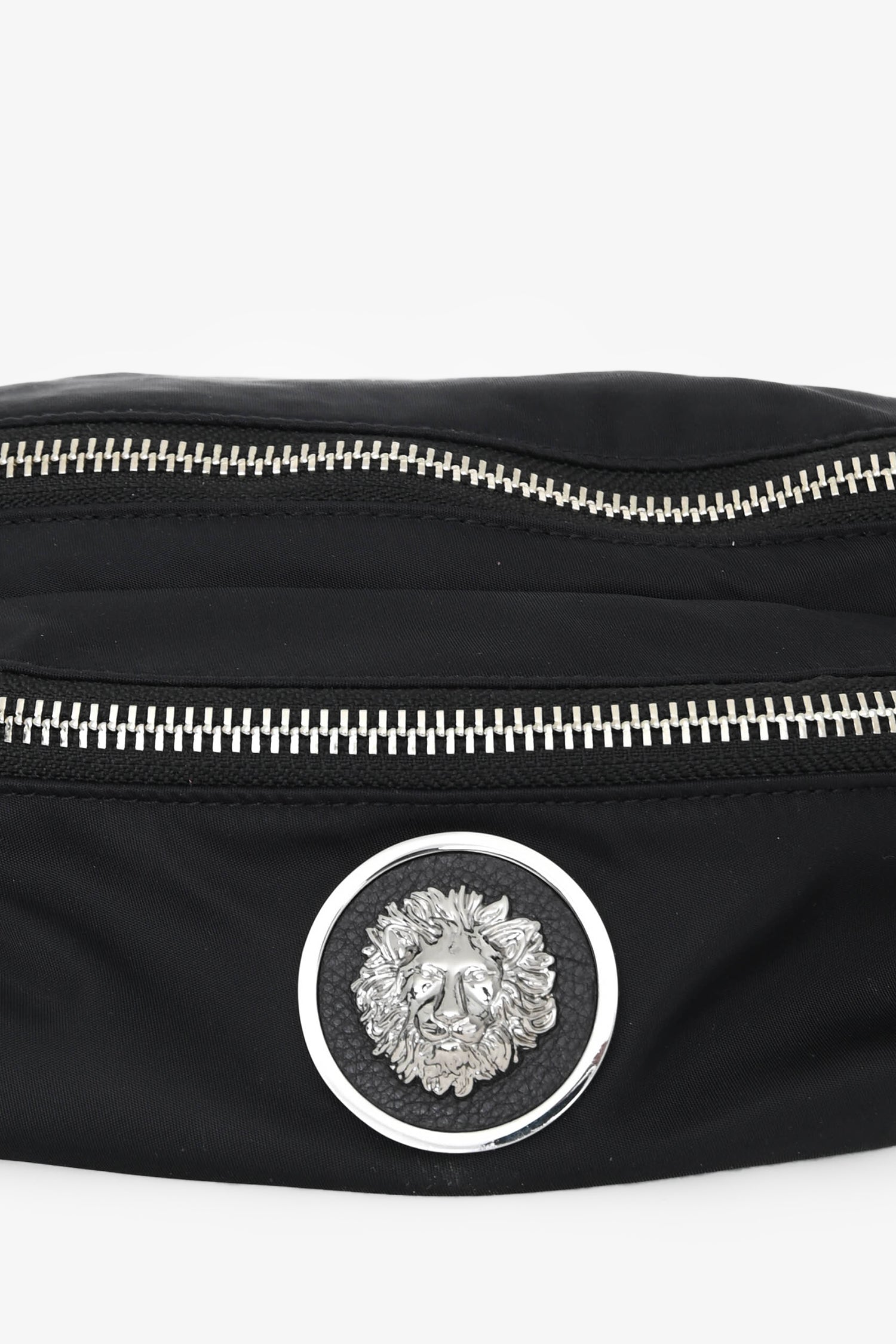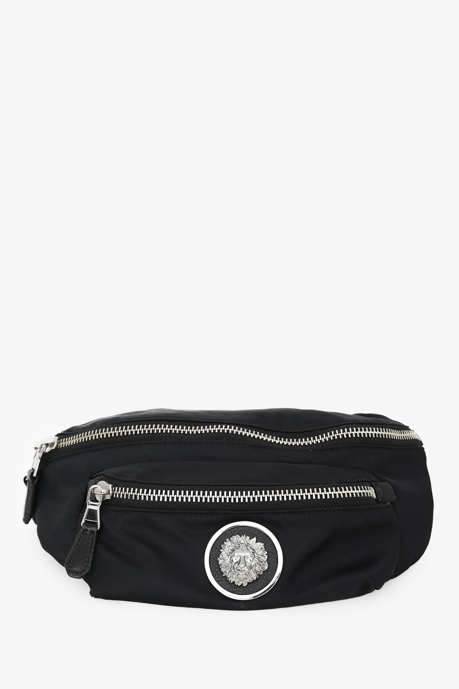 Refresh availabilityVersus Versace Black Nylon Belt Bag. Front 2-way zip closure. Adjustable strap. 2 exterior zip pockets; 1 front, 1 rear. Lined interior. Silver-tone hardware. Tonal stitching.