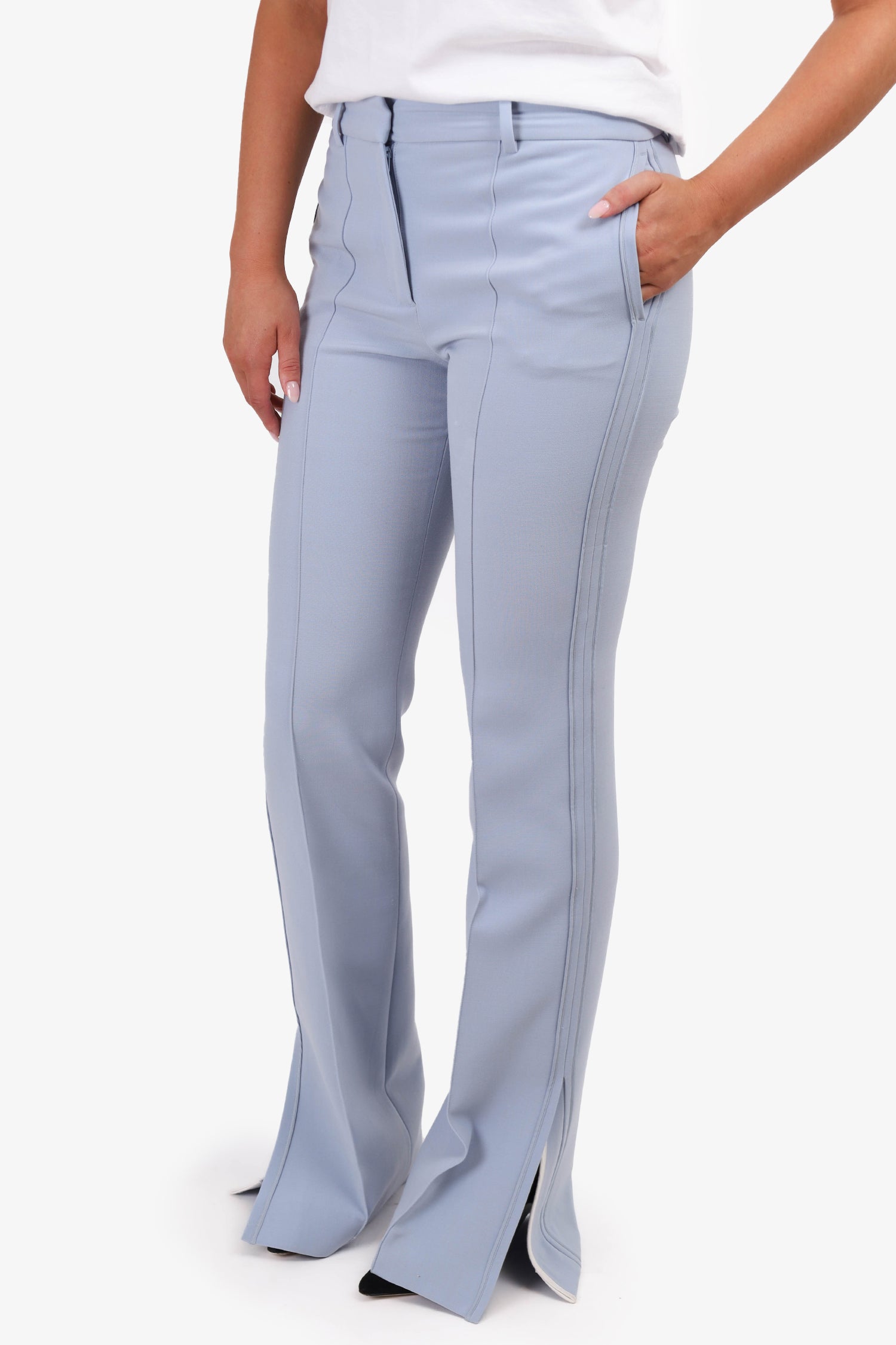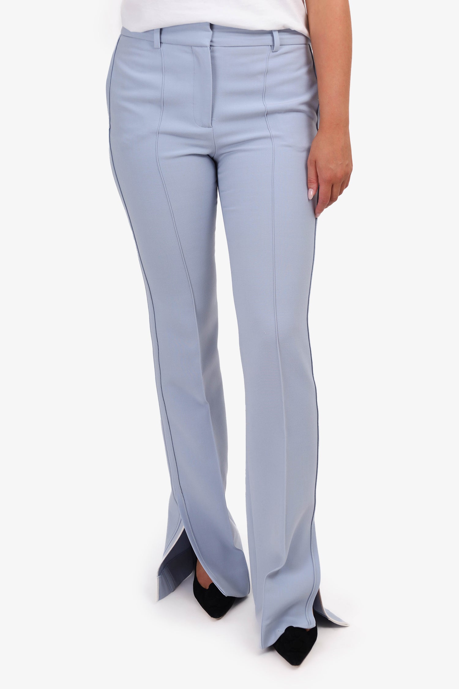 Refresh availabilityVictoria Beckham Baby Blue Wide Leg Trousers. Front zip and hook closure. Front and rear slip pockets. Waist belt loops. Tonal stitching.