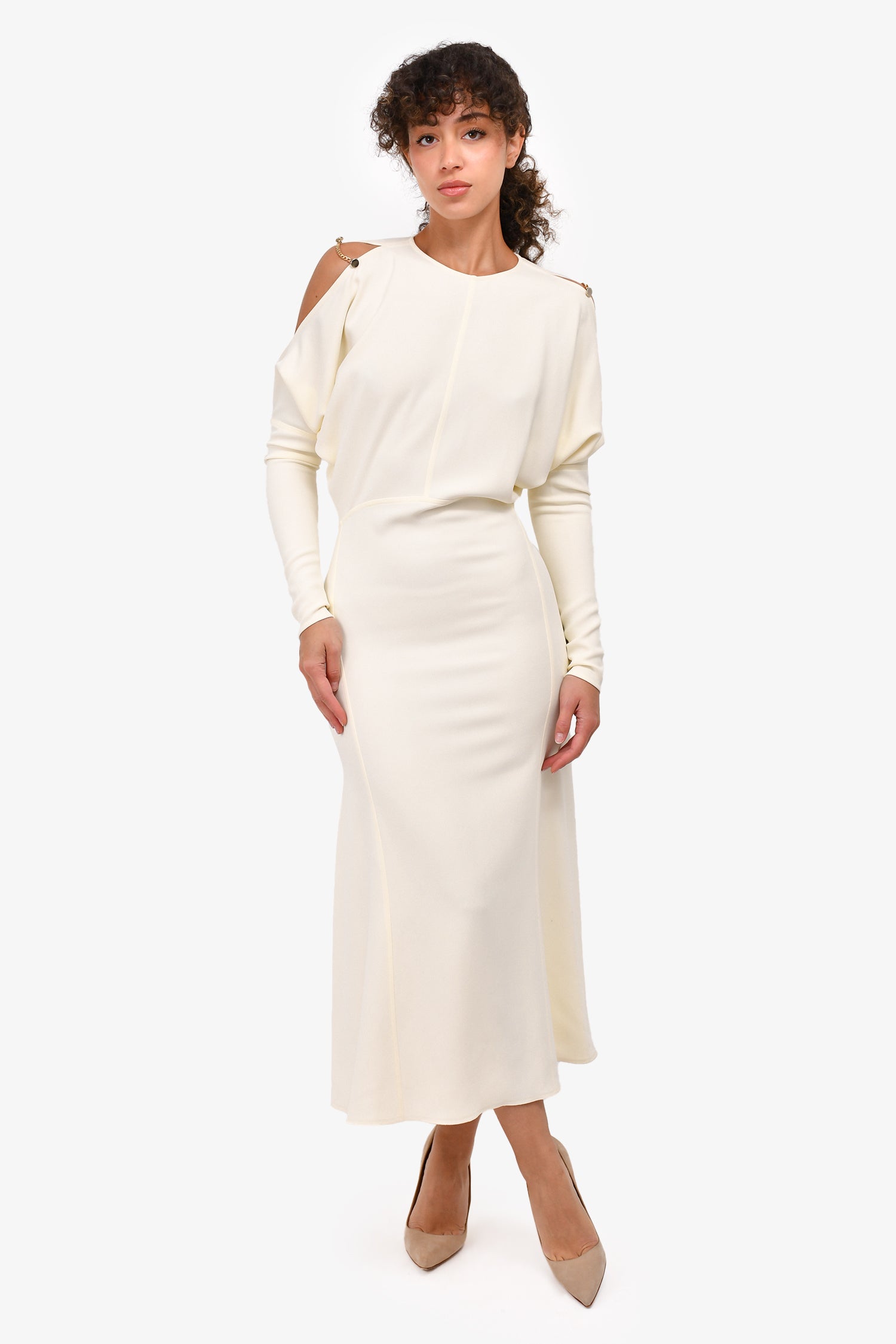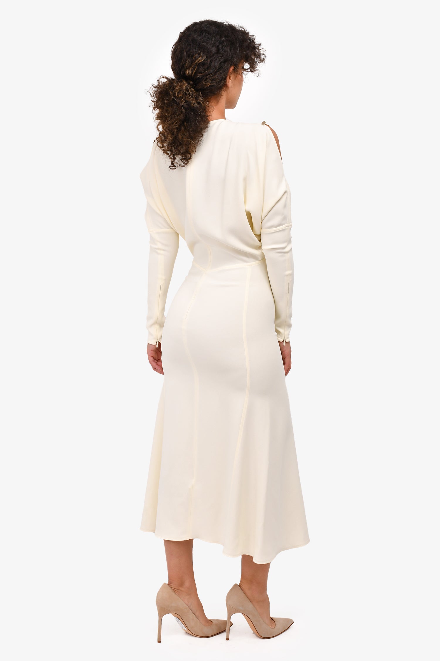 Refresh availabilityVictoria Beckham Cream Chain Detail Maxi Dress. Rear zip and hook closure. Gold-tone hardware. Zip up sleeves. Unlined. Tonal stitching.