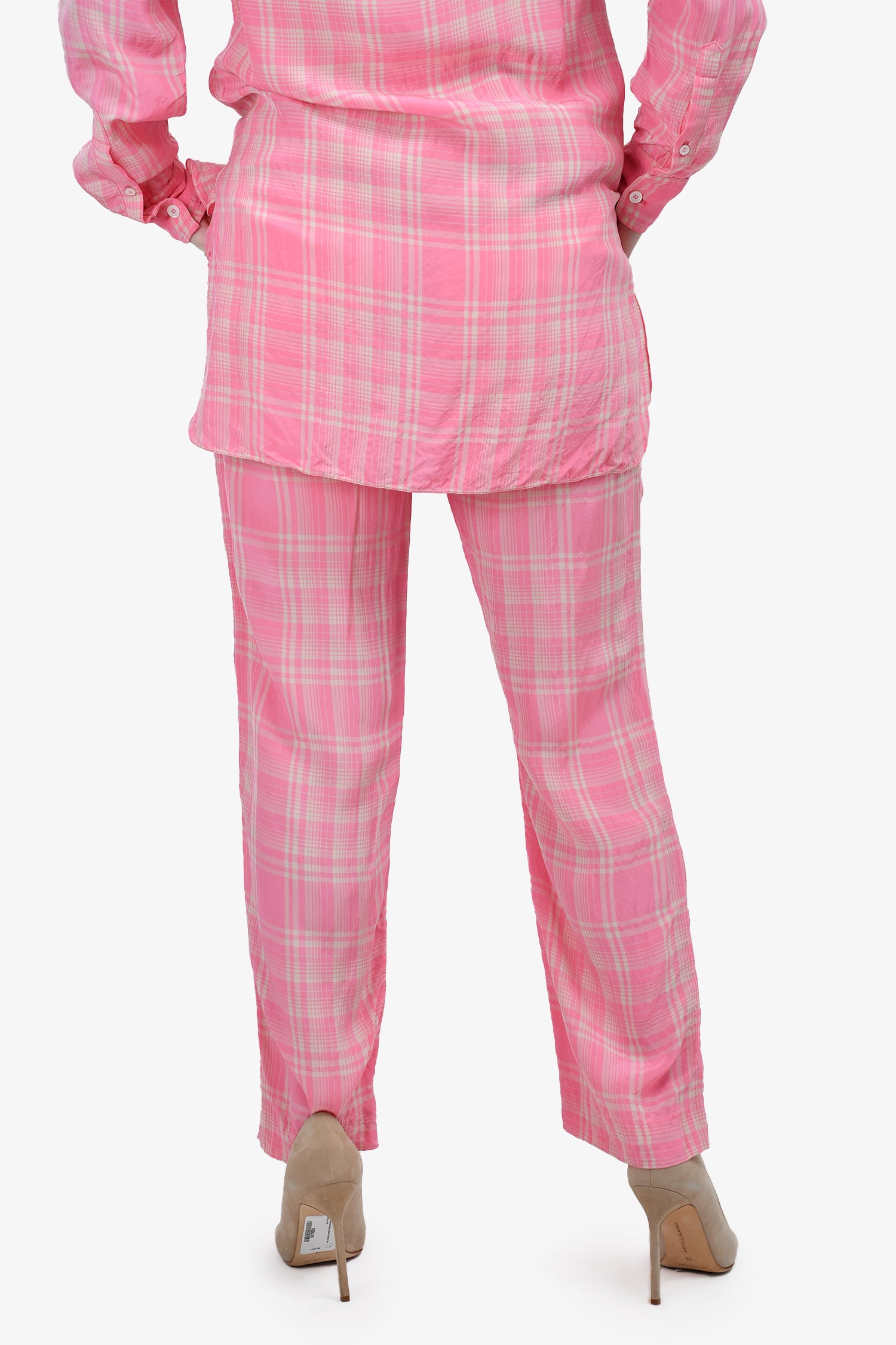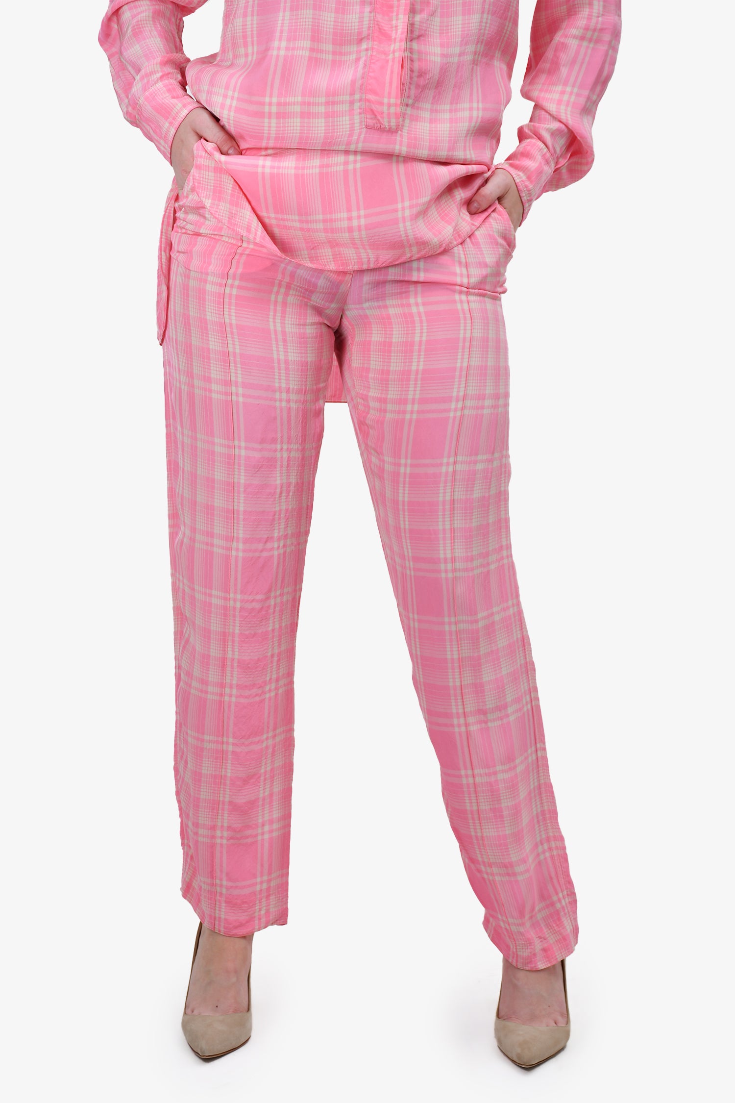 Refresh availabilityVictoria Beckham Pink/Cream Checked Pants. Zipper and hook closure. Two side pockets. Straight leg. Mid-rise. Lightweight material. Tonal stitching.