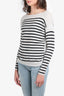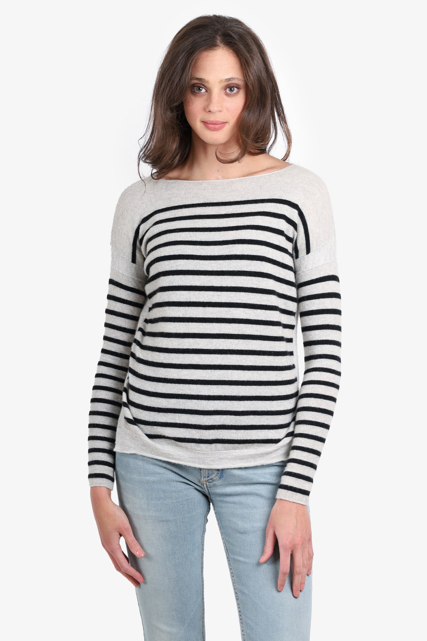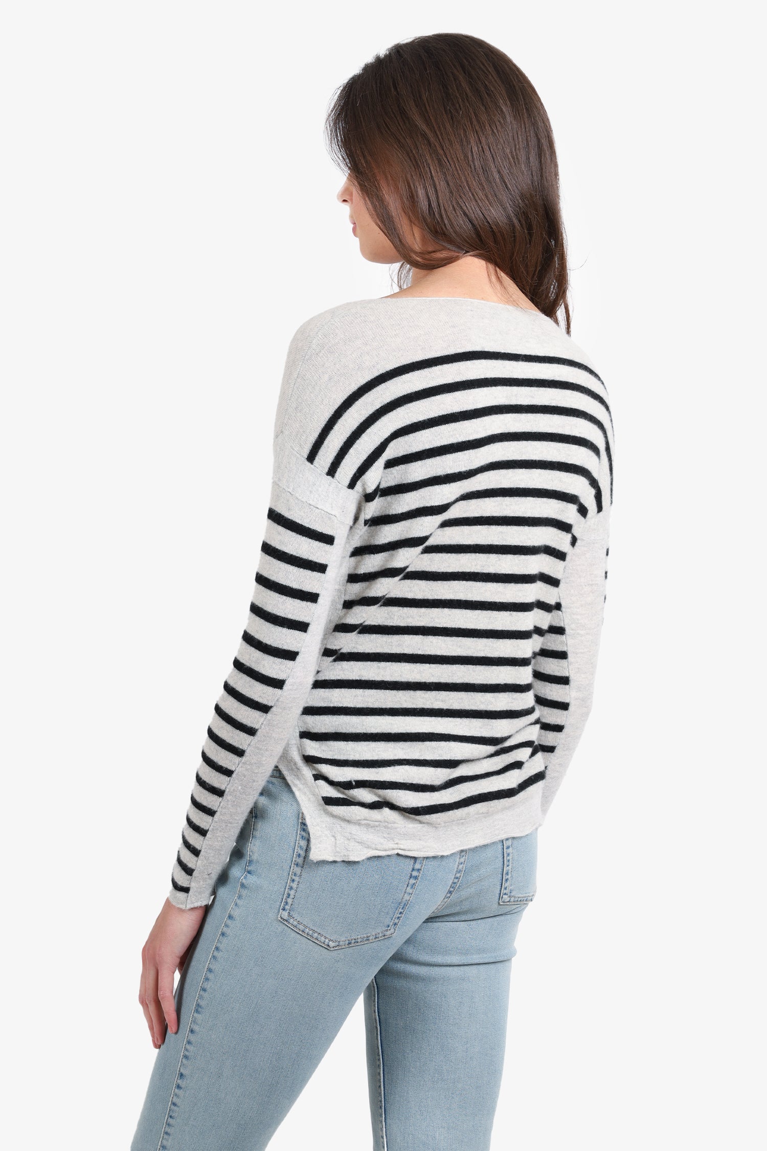 Refresh availabilityVince Grey/Black Striped Sweater. Boatneck. Side split hem detailing. Unlined. Tonal stitching.