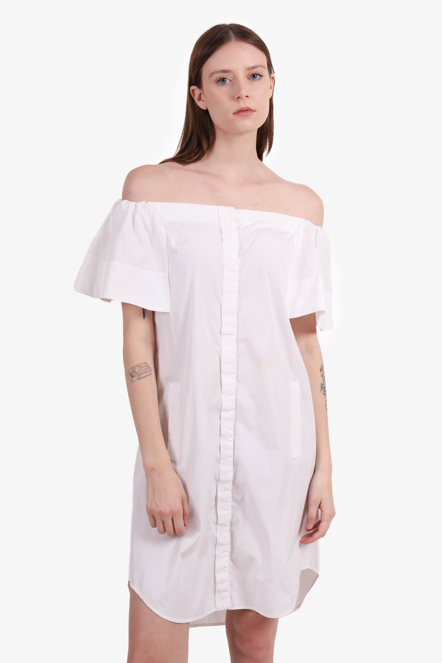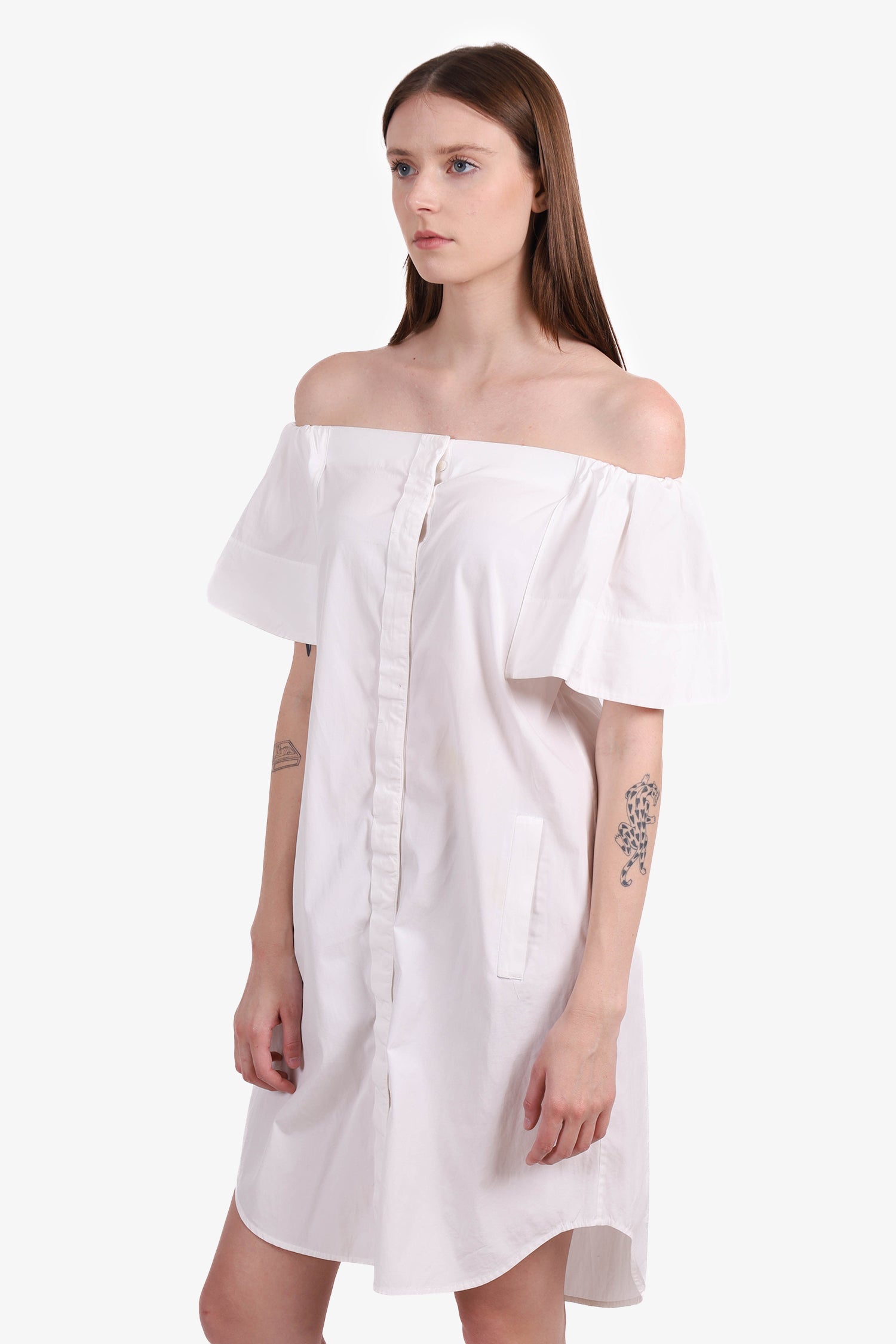 Refresh availabilityVince White Off-the-Shoulder Dress. Front button-up closure. Side slip pockets. Unlined. Tonal stitching.