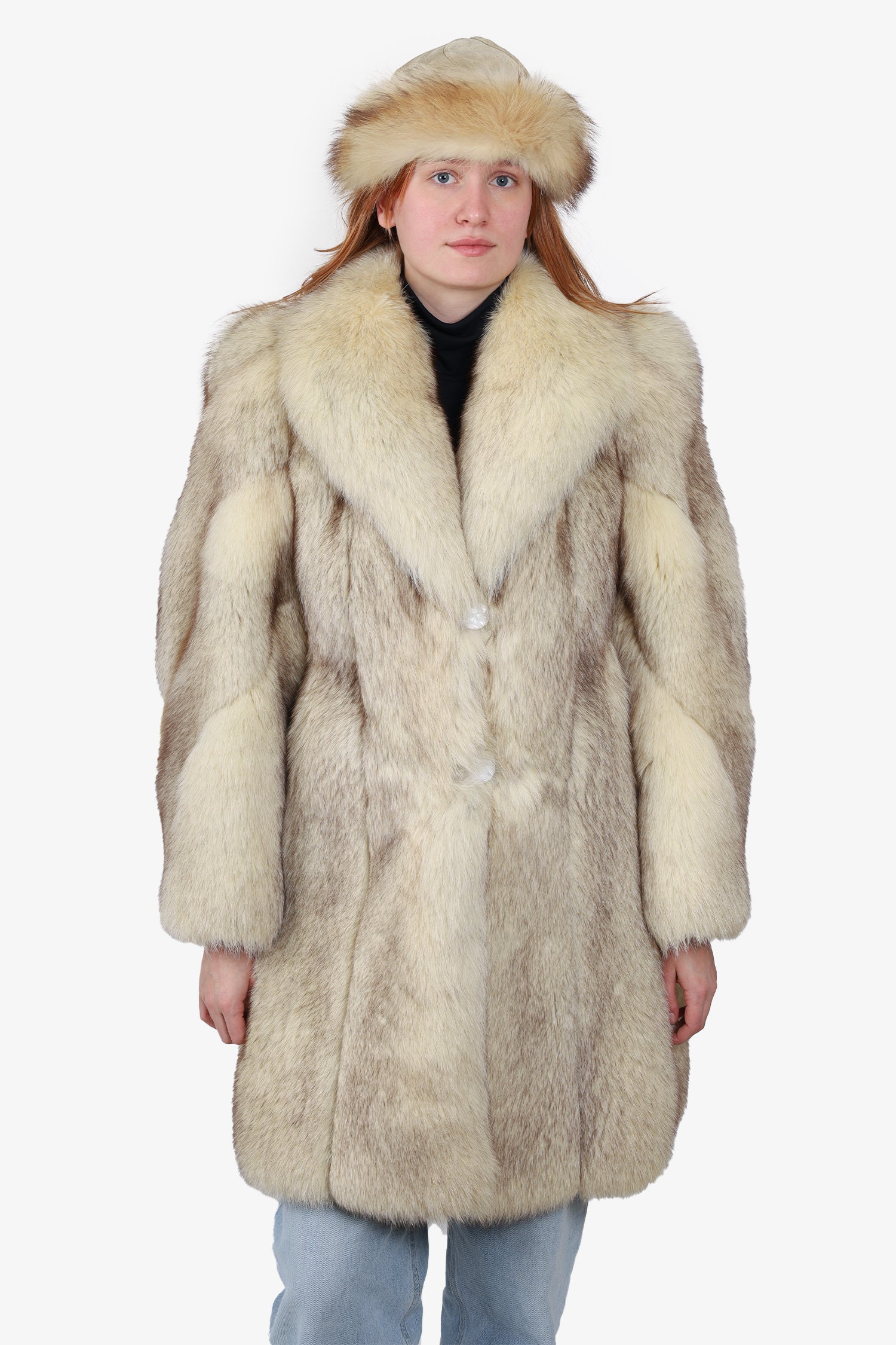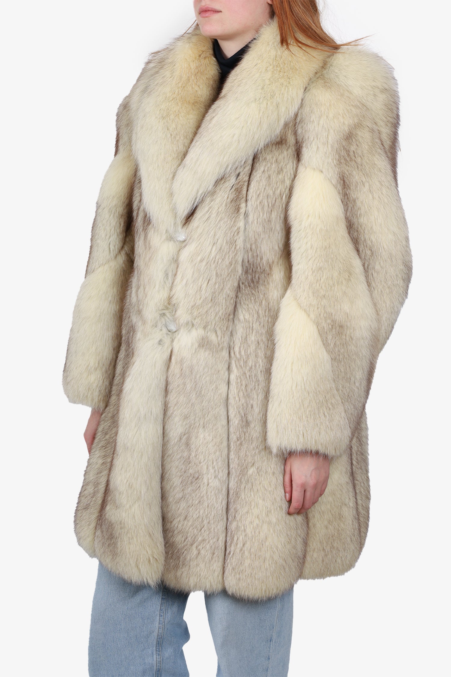 Vintage Beige Fox Fur Coat. Collared neckline. Front button closure. Silk interior lining. Tonal stitching.