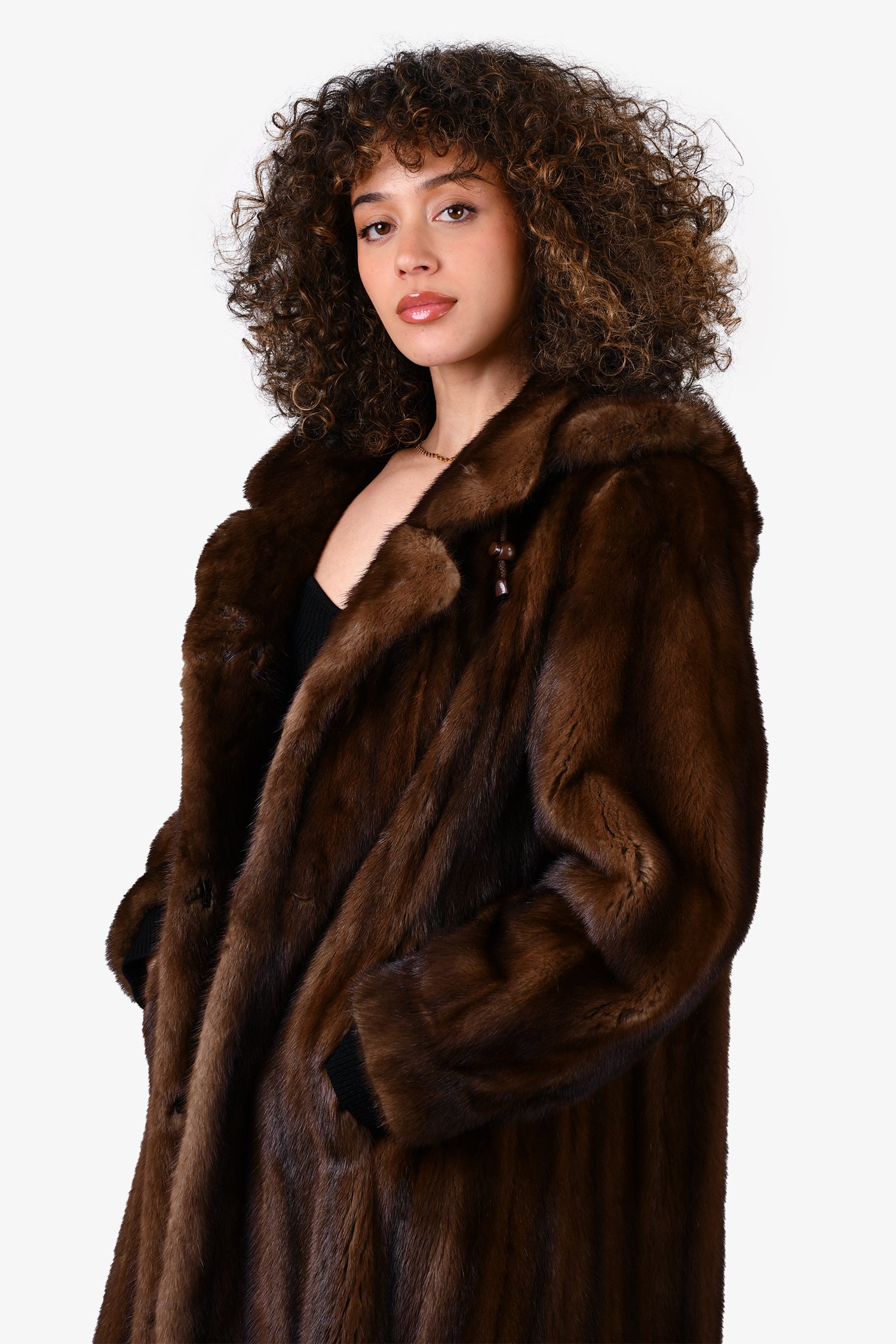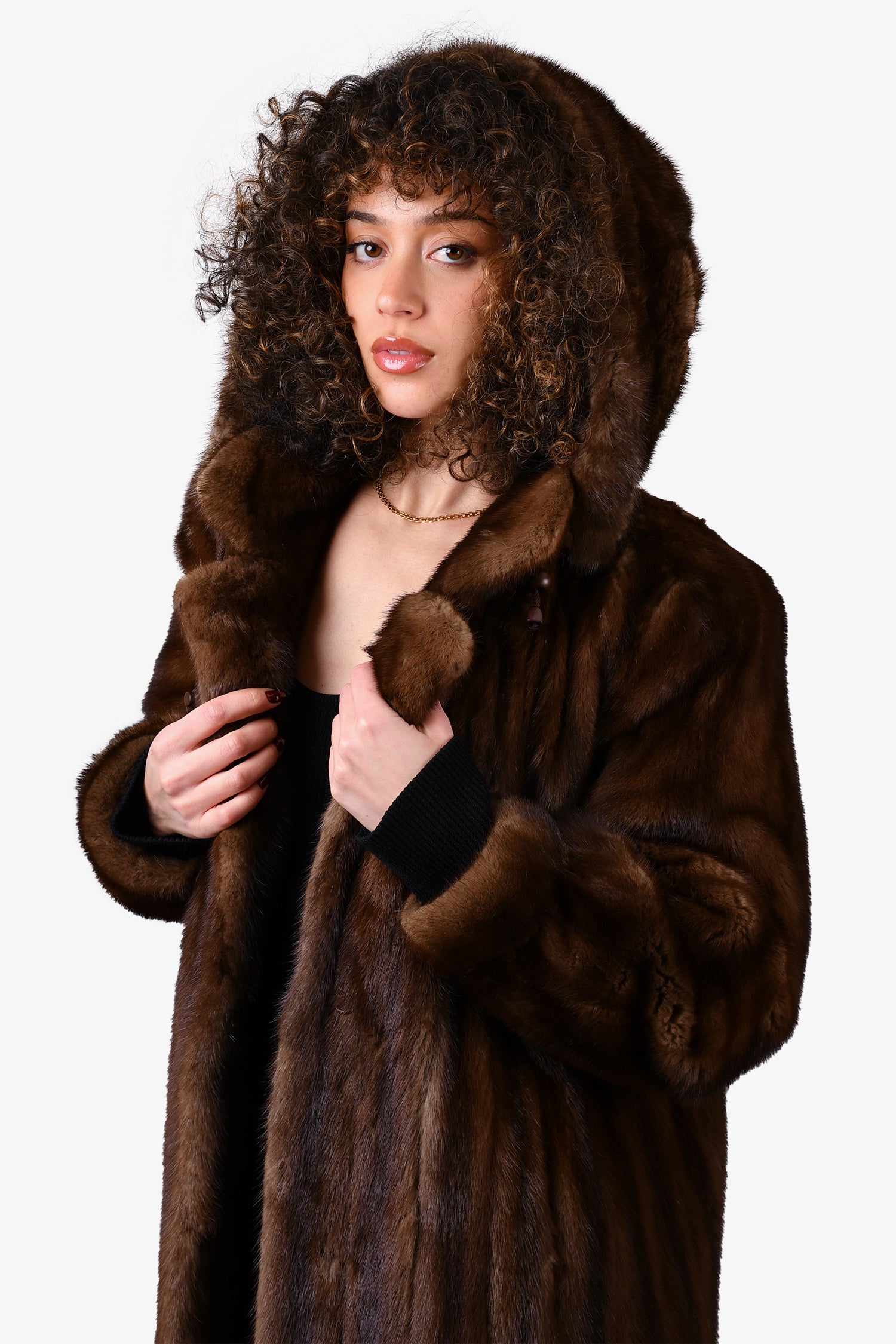 Vintage Black/Brown Canadian Demi Buff Mink Fur Coat with Hood. Lined. Drawstring on hood. 2 exterior pockets.