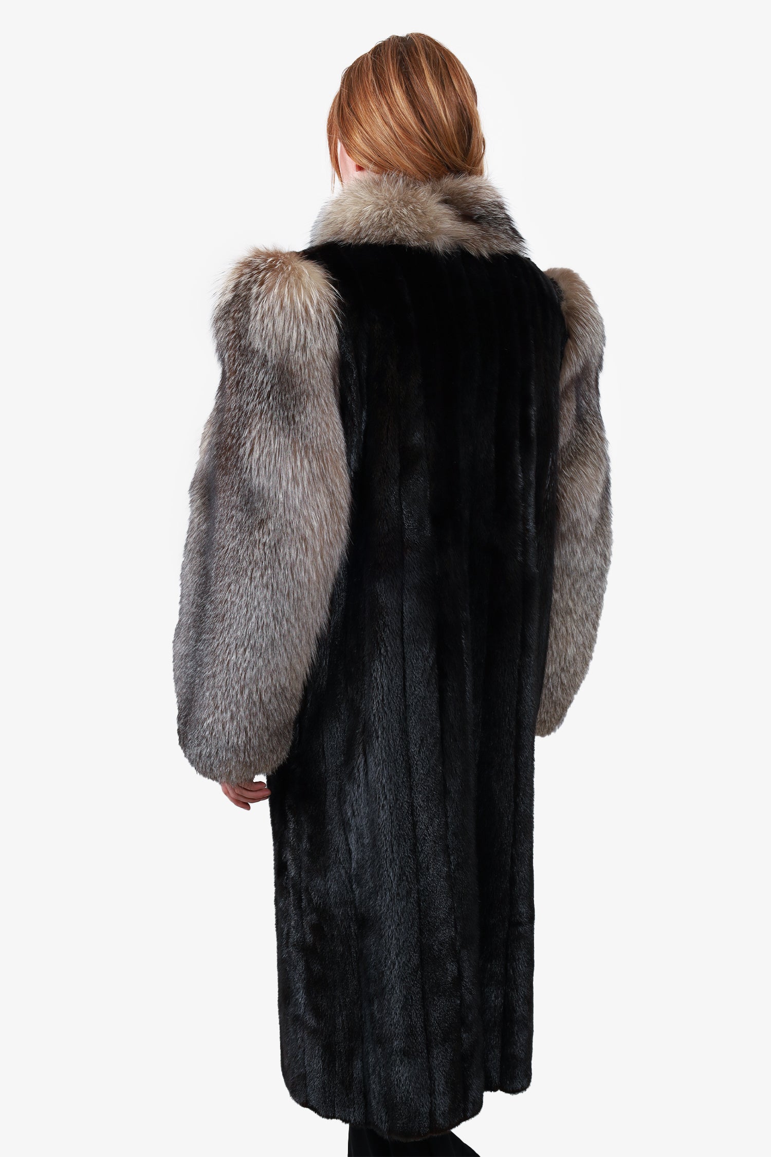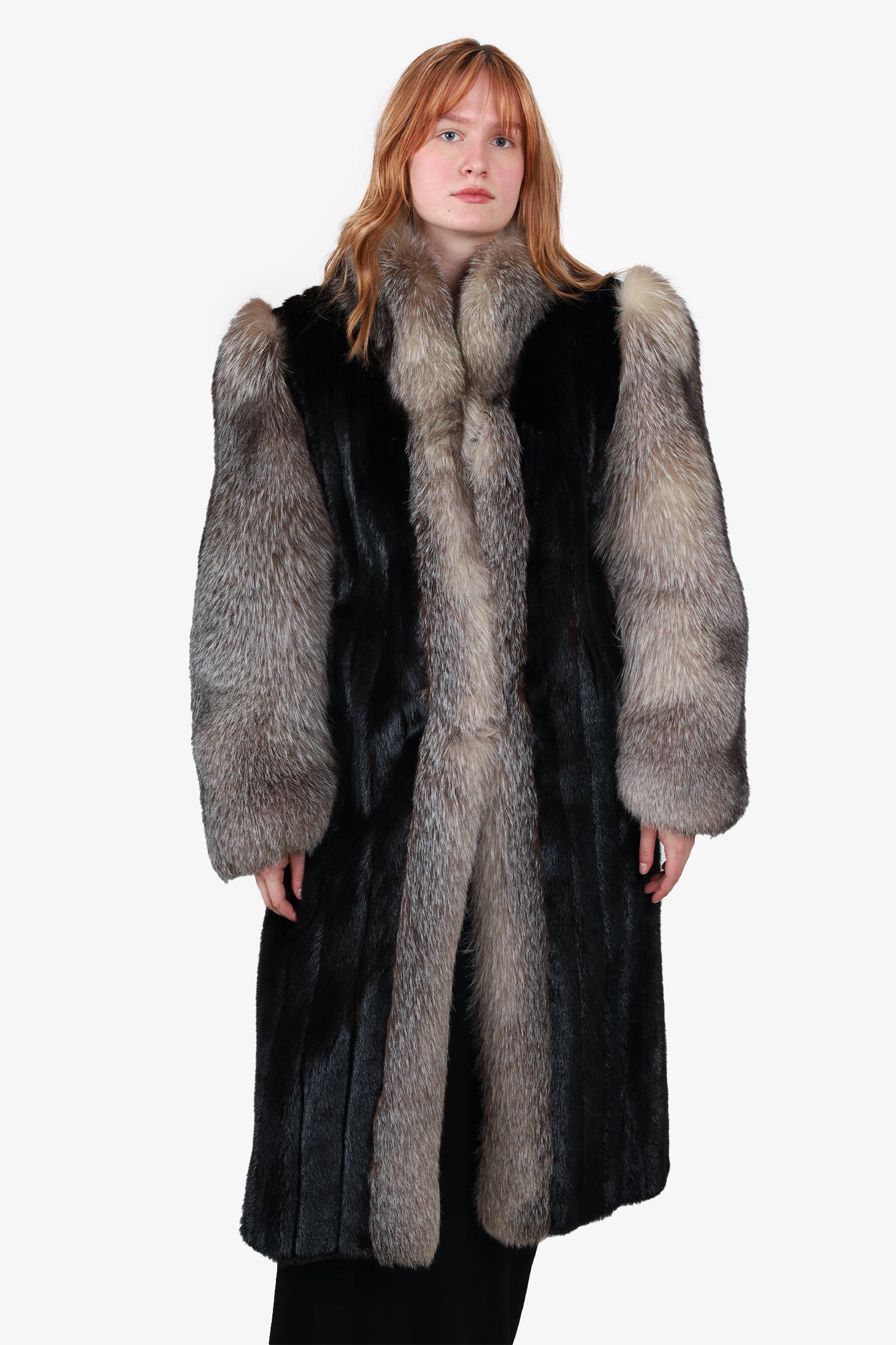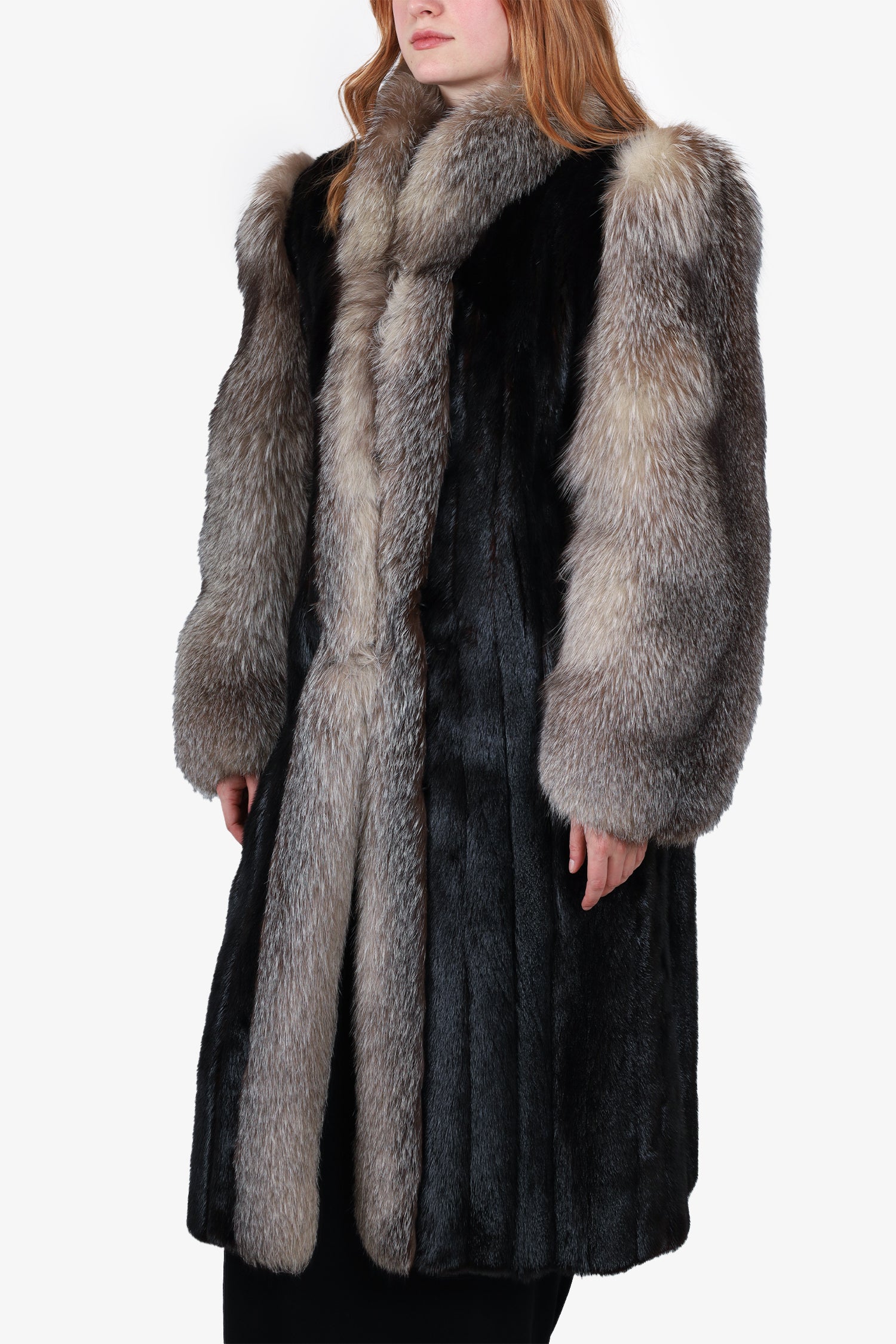Vintage Black Canadian Dark Ranch Mink & Fox Fur Coat. High neckline. Front clasp closure. 2 front open pockets. Interior silk lining. Tonal stitching.