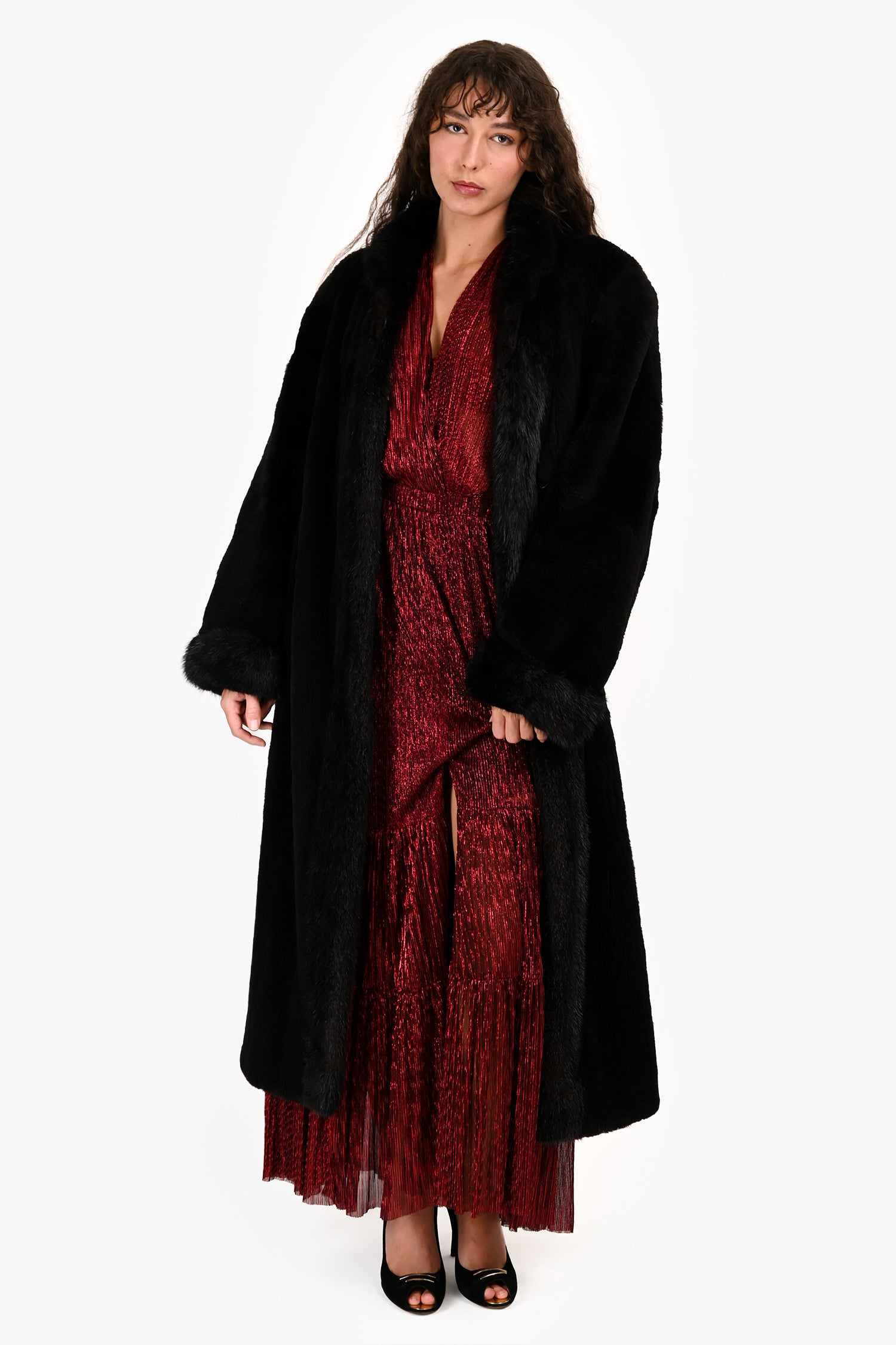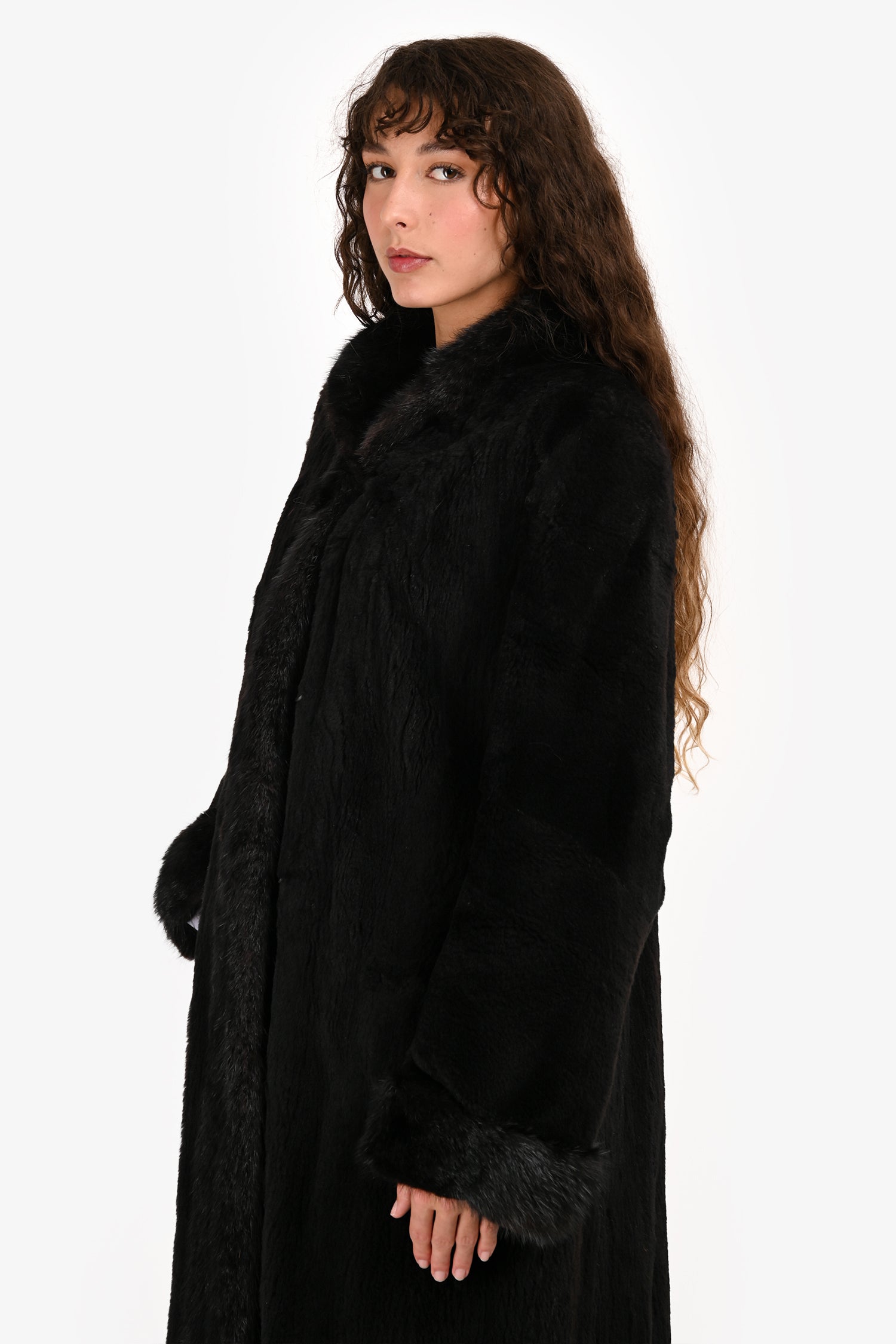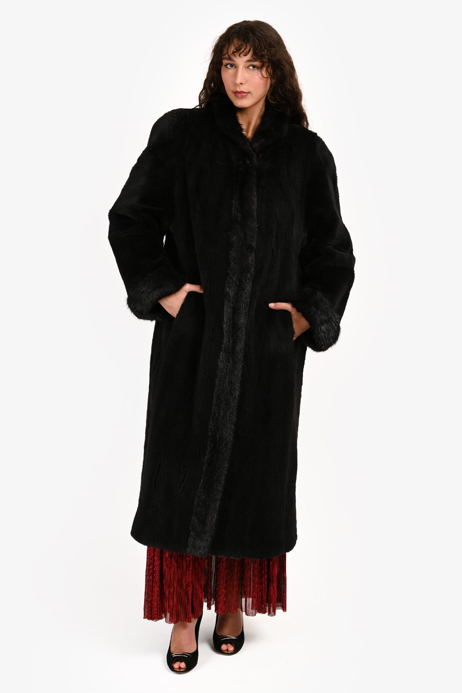 Refresh availabilityVintage Black Sheared Raccoon/Muskrat Fur Long Coat. Pull-on. Round neckline. Hidden hook closure in the front. 2 slip pockets. Lined. Tonal stitching.