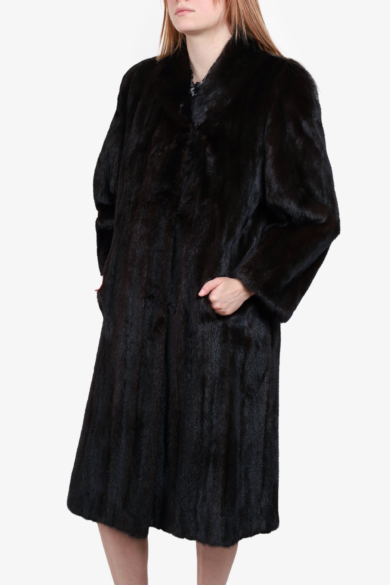 Vintage Brown Canadian Dark Ranch Mink Fur Coat Jacket. Front hook closure. 2 front open pockets. Interior lining. Tonal stitching.