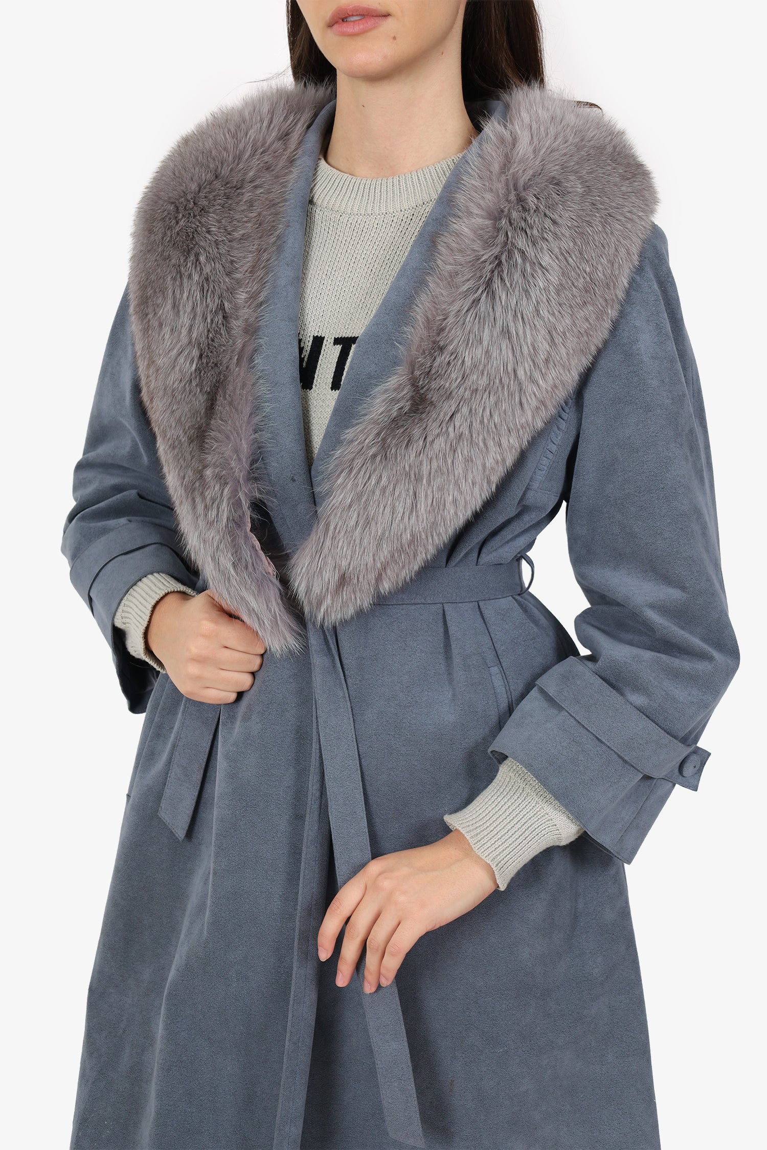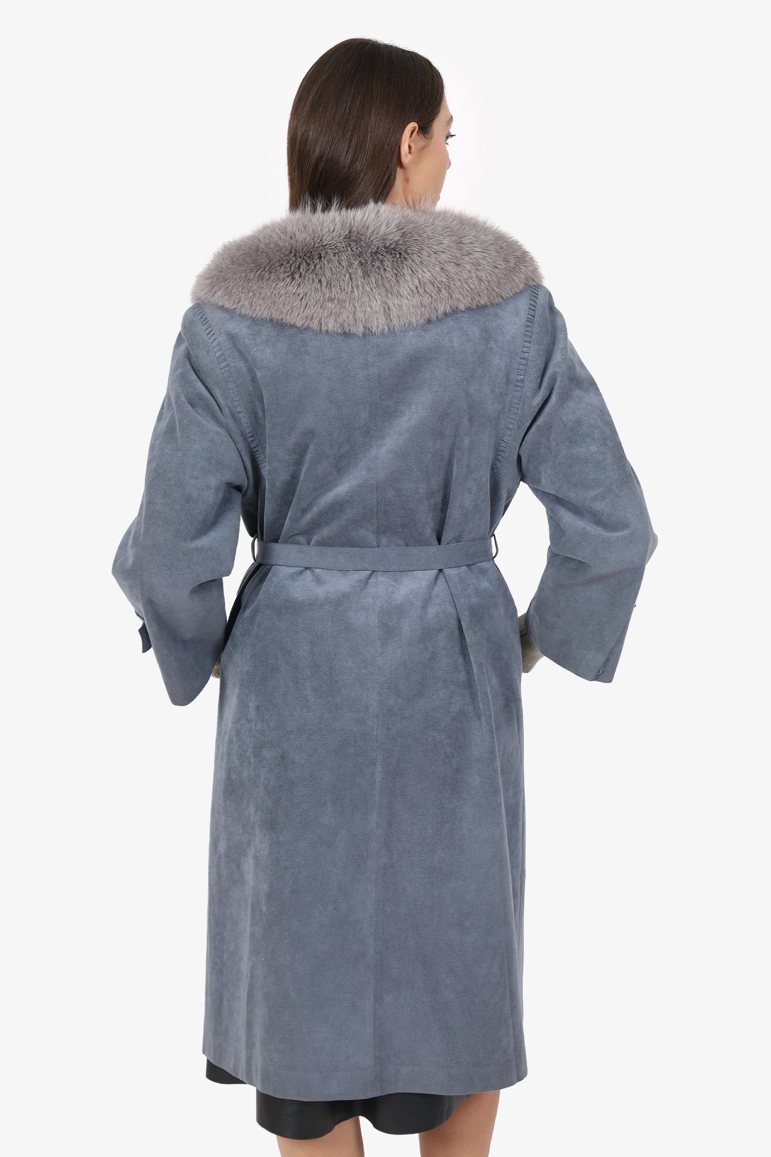 Refresh availabilityVintage Gray Suede/Fox Fur Long Belted Coat. Pull-on. Collared neckline. Open front with waist-tie closure. Button detail to sleeve cuff. 2 exterior side slip pockets. Lined interior. Tonal stitching.
