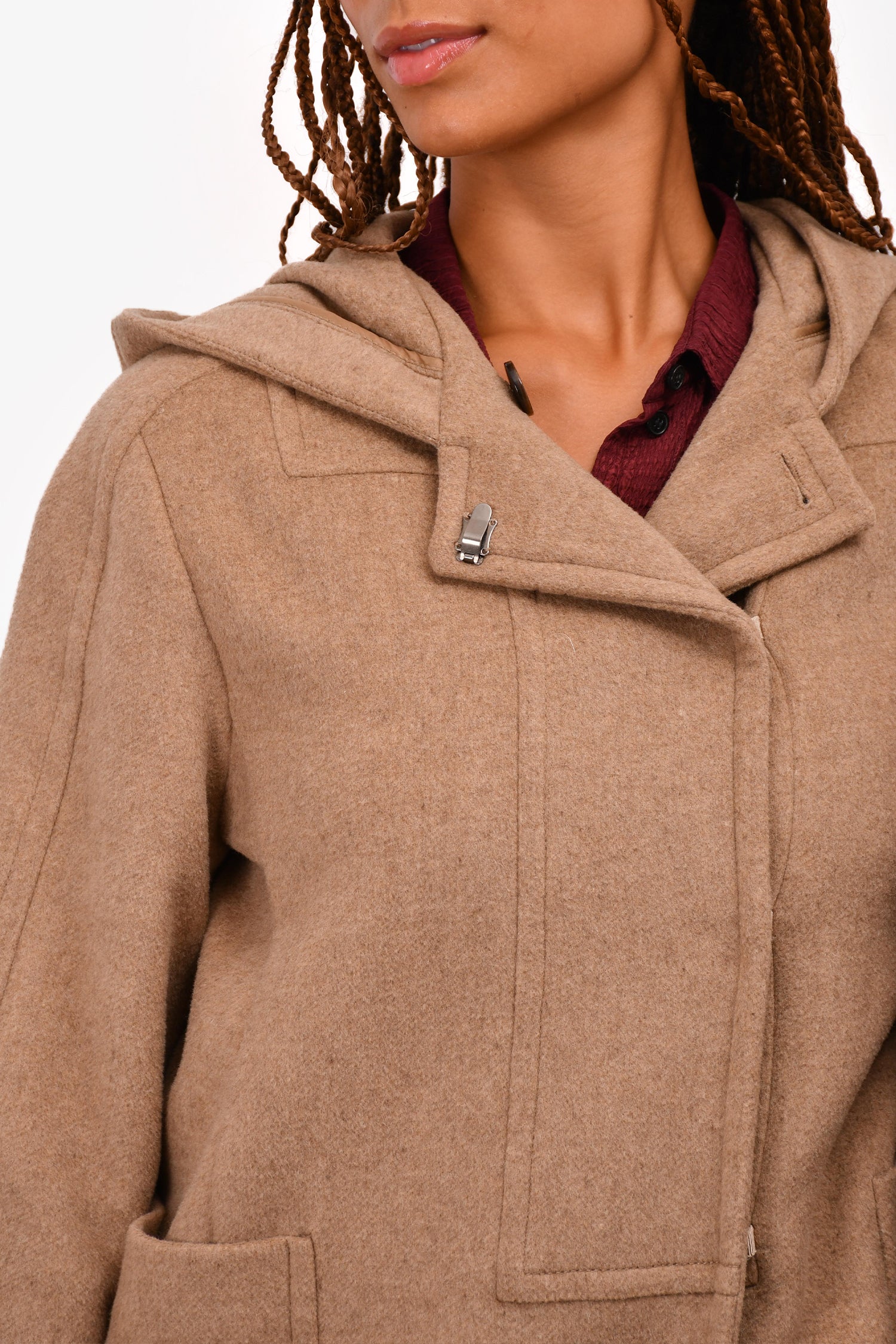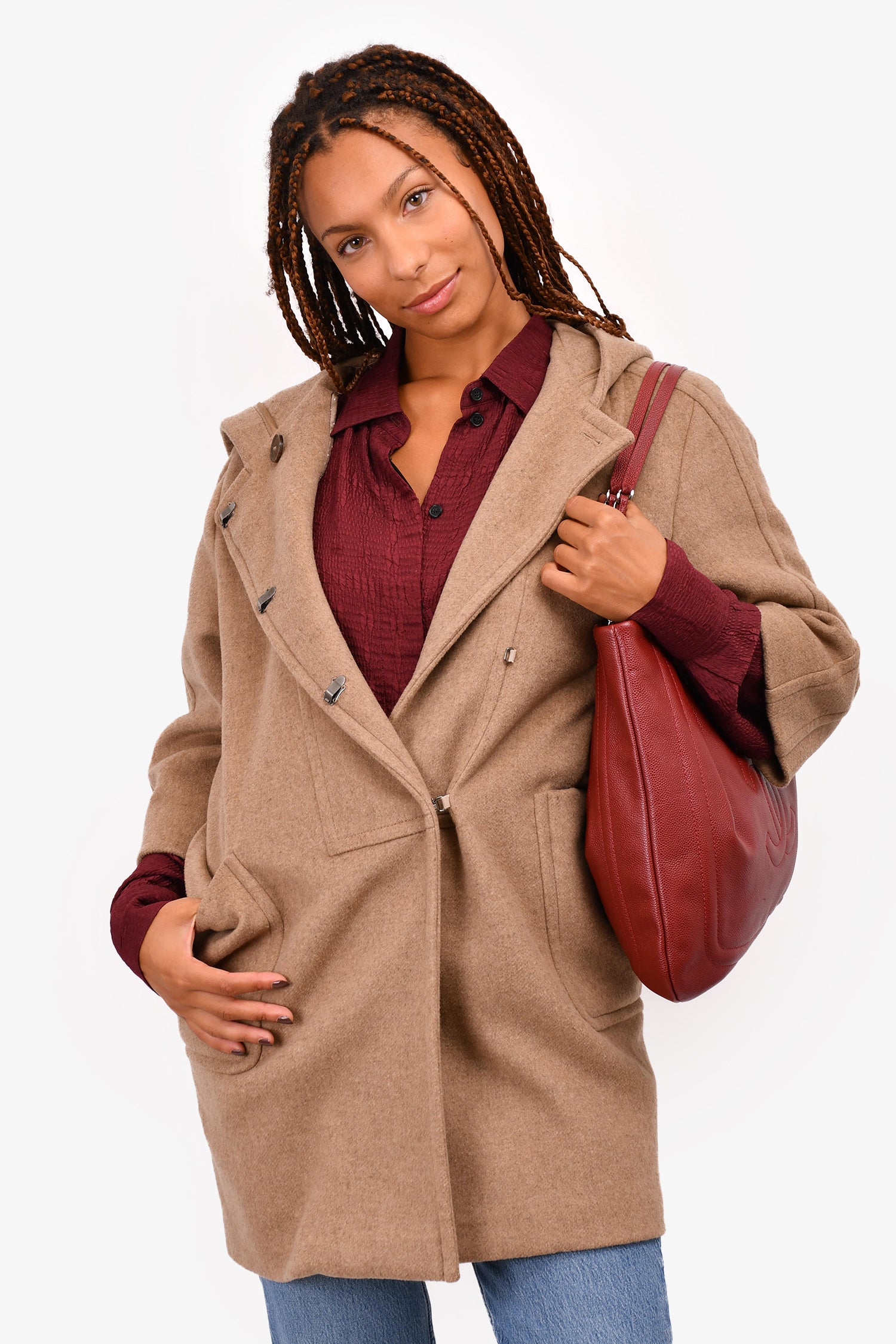 Refresh availabilityWeekend Max Mara Beige Virgin Wool 3/4 Sleeve Peacoat. Tonal stitching. Front hook closures. Partially lined interior. Side pockets.