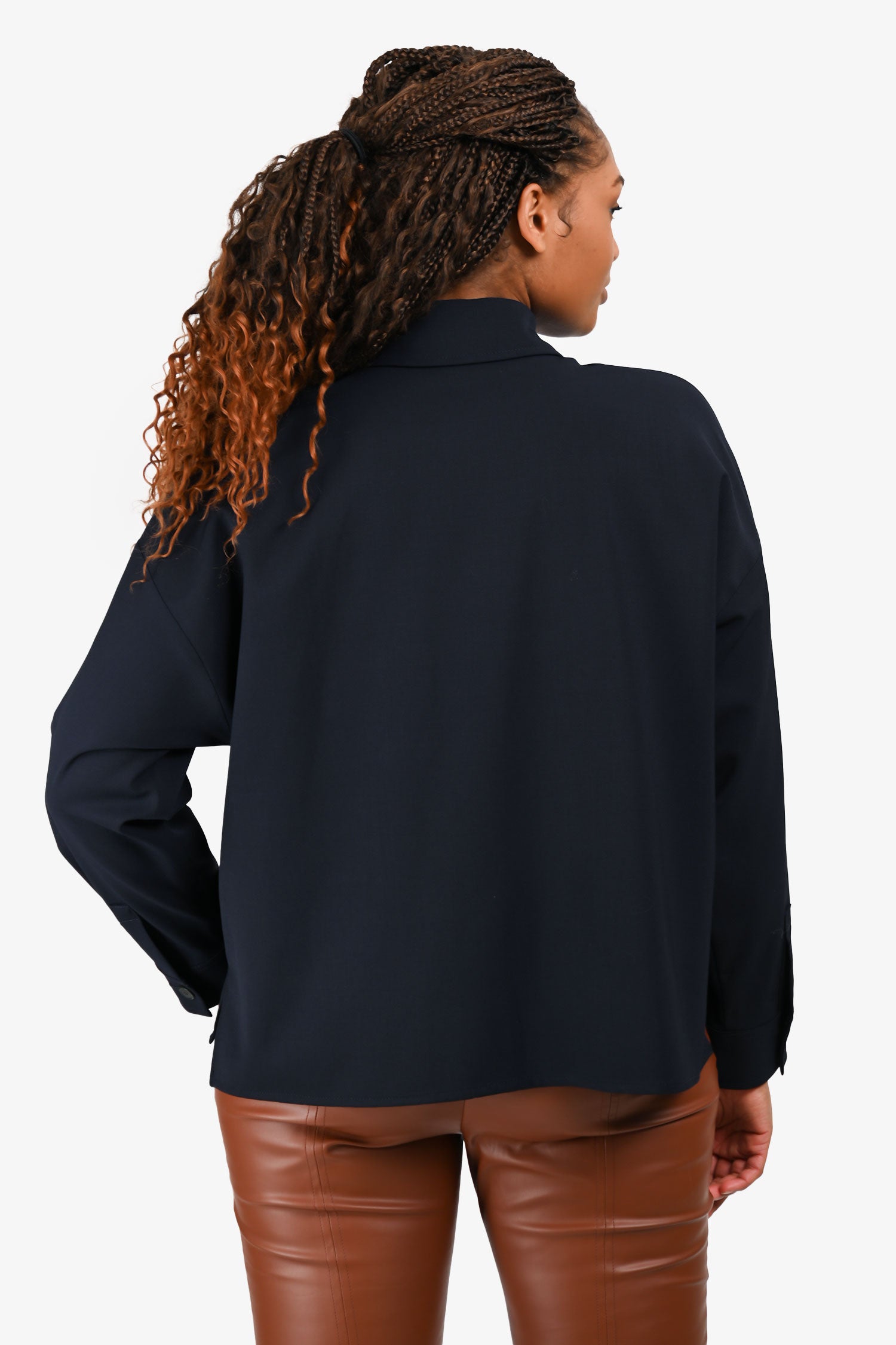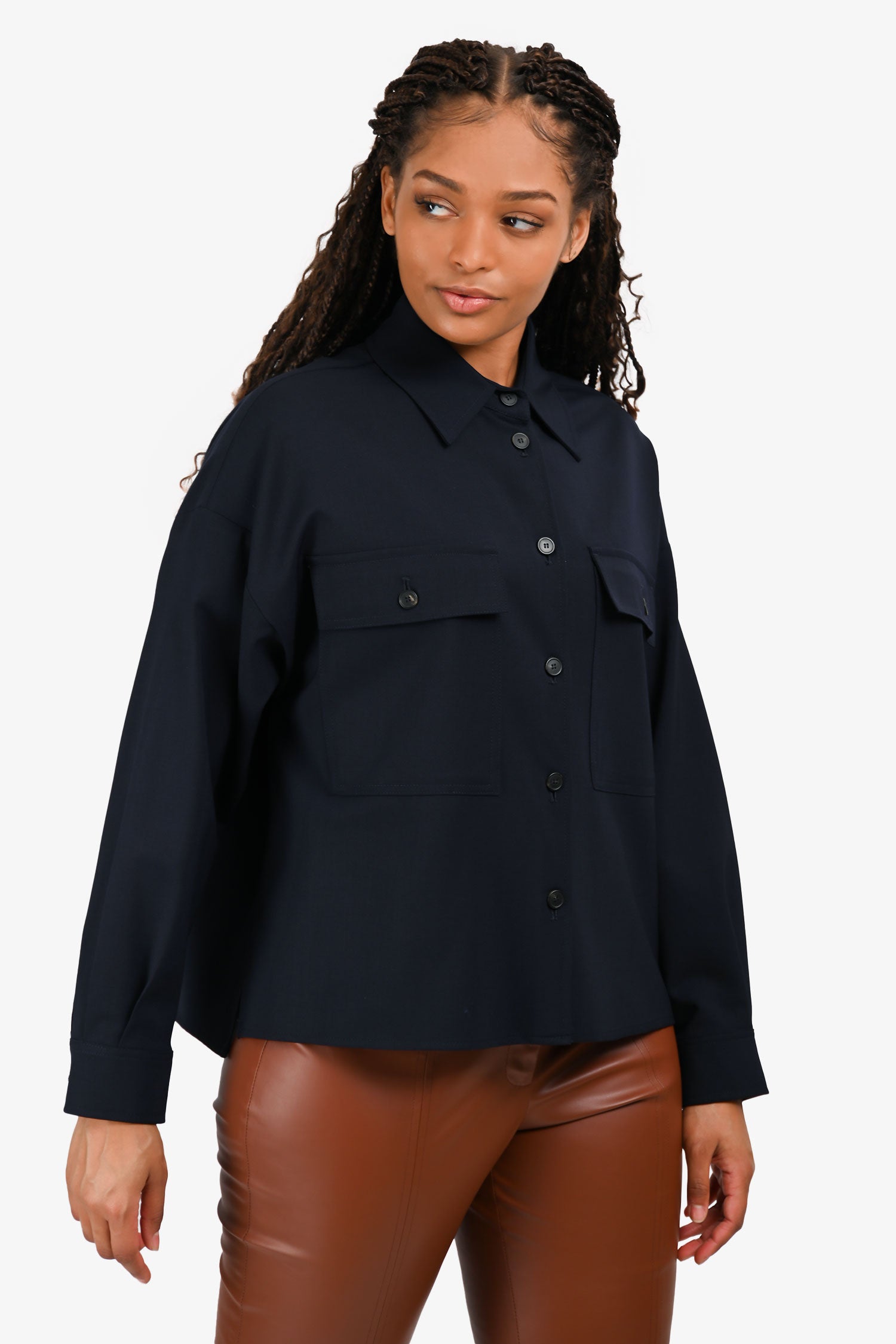 Refresh availabilityWeekend Max Mara Blue Collared Button Down Top. Slip-on. Front button-up closure. Pointed collar. Cuffs with button-up closures. 2 exterior slip pockets with button flaps. Tonal stitching.