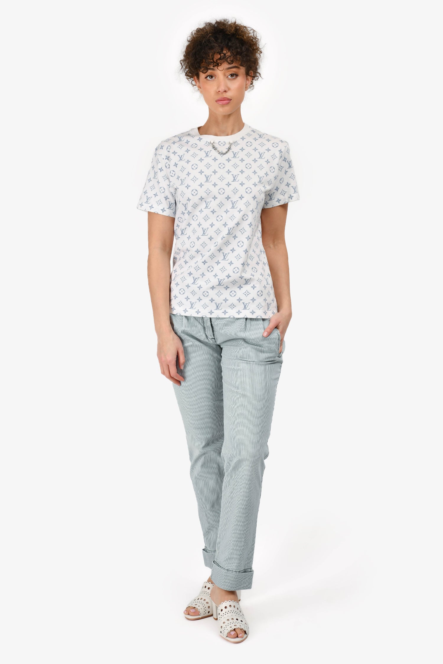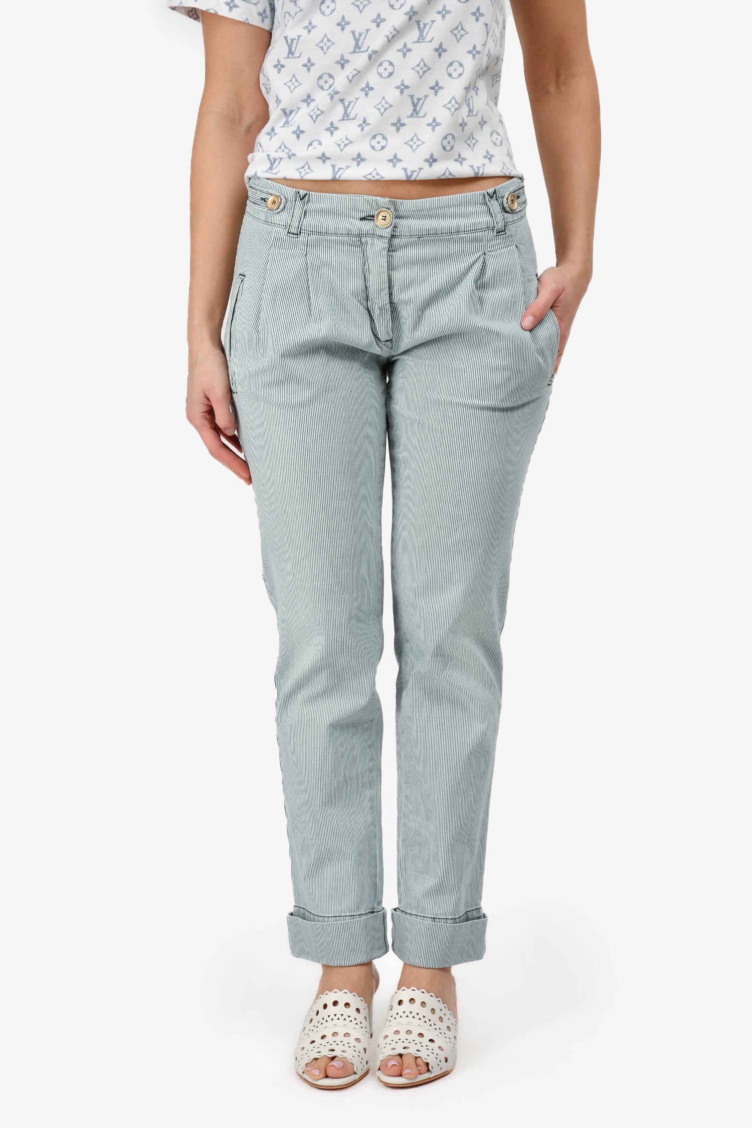 Refresh availabilityWeekend Max Mara Blue/White Striped Pants. Front zip and button closure. 2 front slip pockets and 2 rear slip pockets. Button detailing at waist. Belt loops around waistline. Cuffed hem. Contrast stitching.