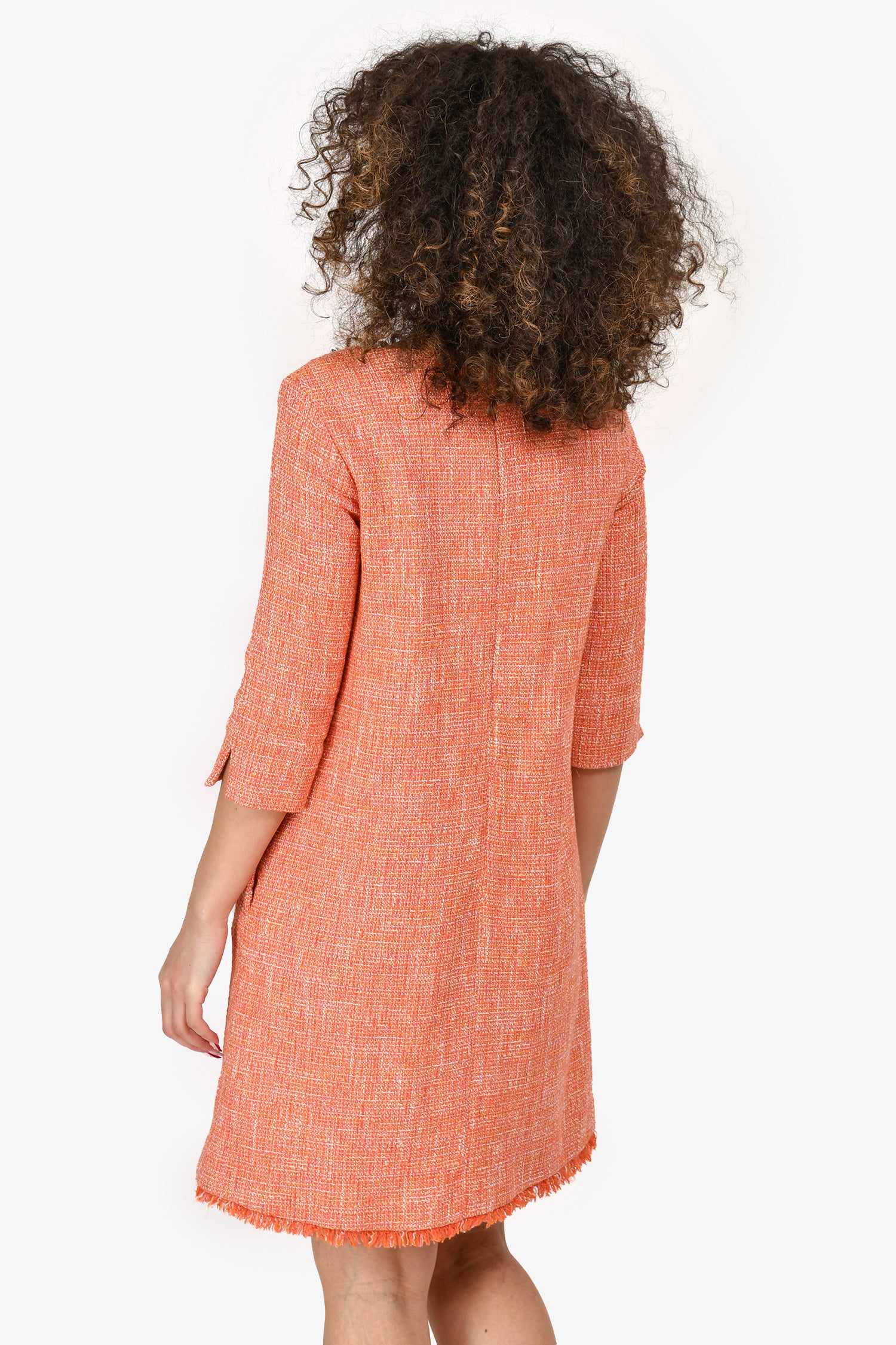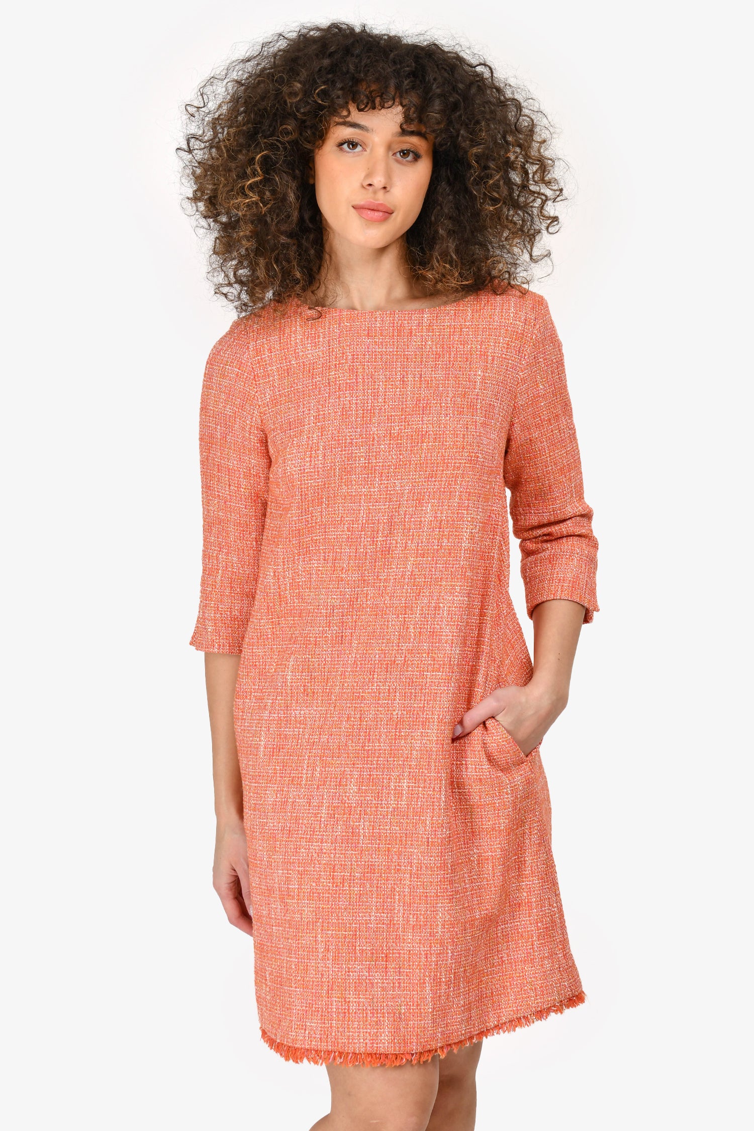 Refresh availabilityWeekend Max Mara Orange Tweed Boat Neck Dress. Back zip-up closure. Frayed gem. Fully lined interior. Two side slip pockets.