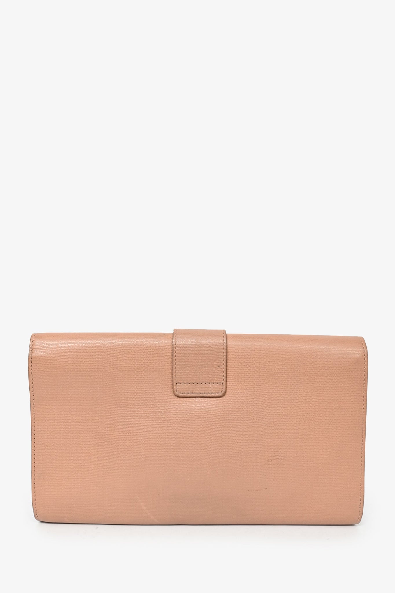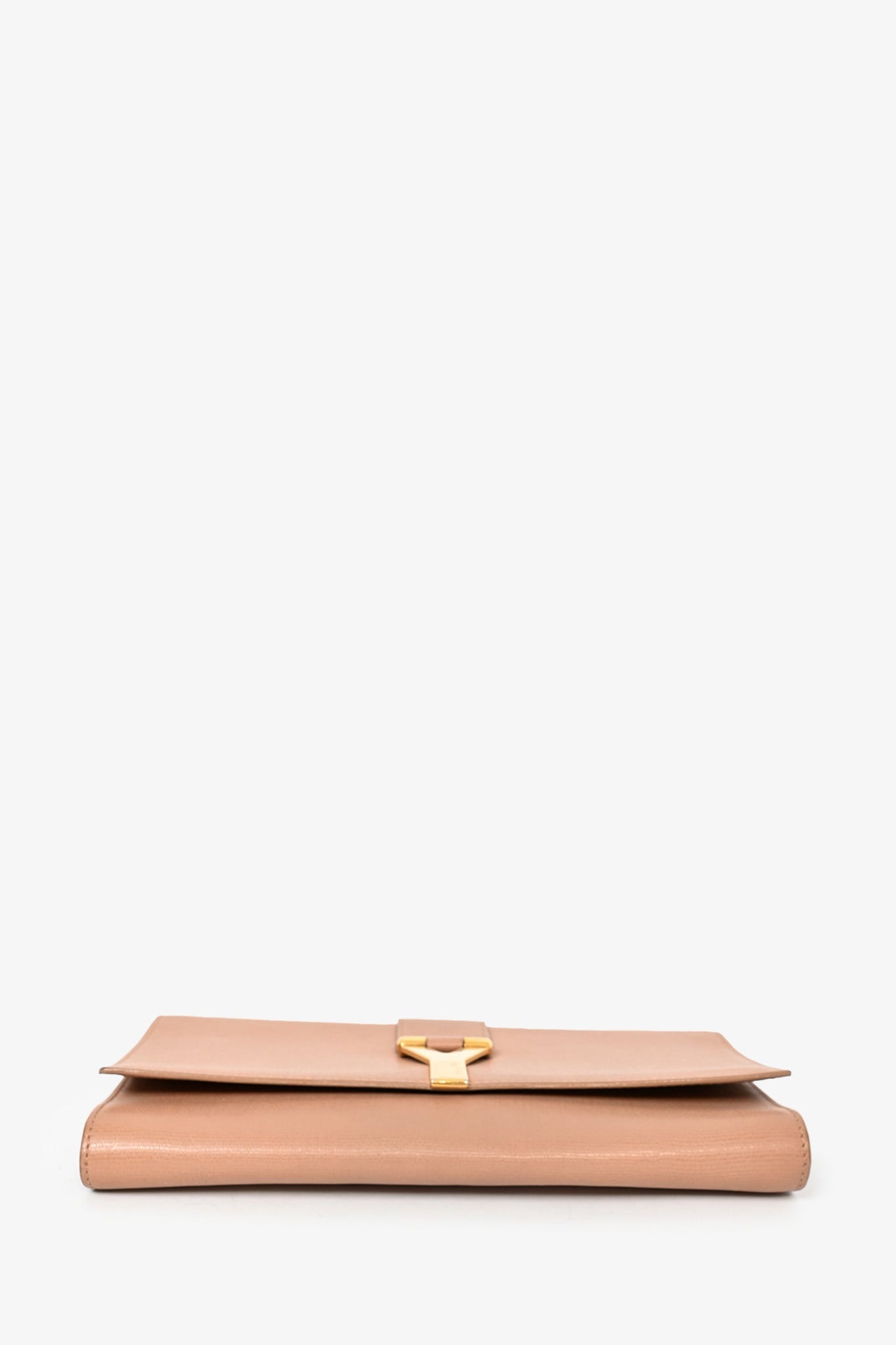 Refresh availabilityYves Saint Laurent Beige Leather Gold 'Y' Ligne Clutch. Front flap with magnetic closure. Interior slip pocket. Beige satin lining. Tonal stitching. Gold-toned hardware.