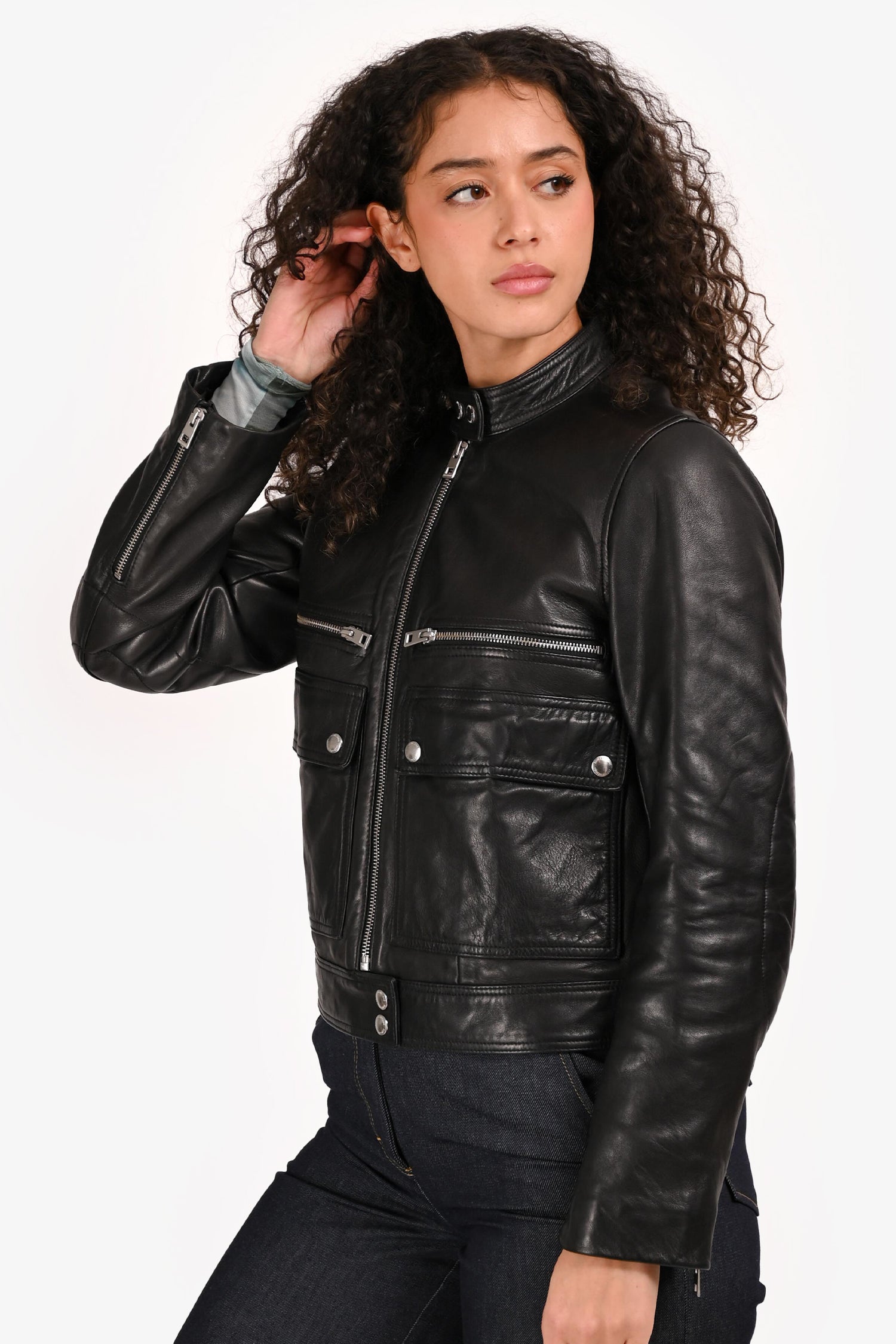 Refresh availabilityZadig & Voltaire Black Leather Jacket. Zip front closure. Snap-tab at collar and hem. 2 exterior zip pockets; 2 exterior flap pockets with snap-button closures. Zip cuffs. Lined interior. Silver-tone hardware. Tonal stitching.