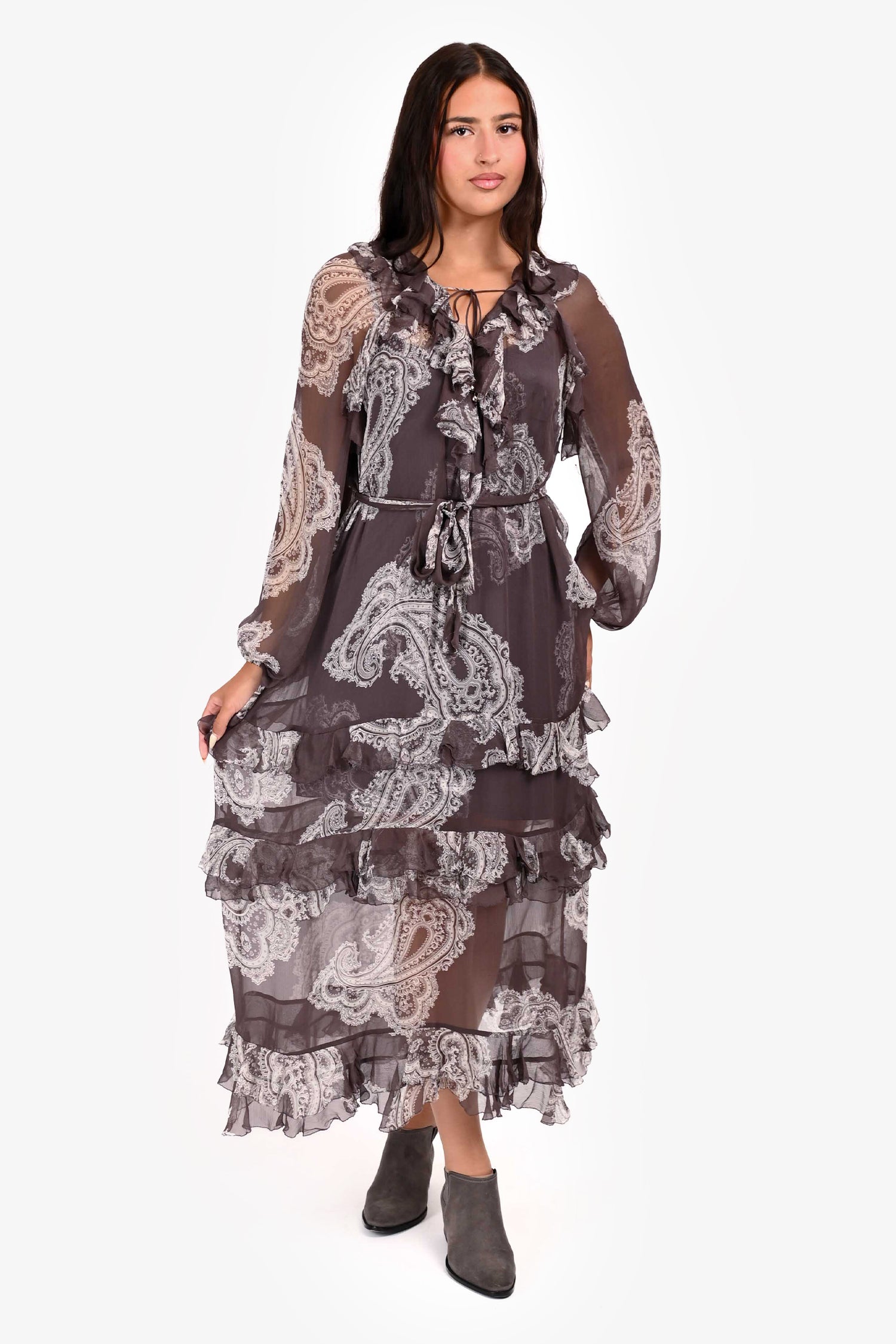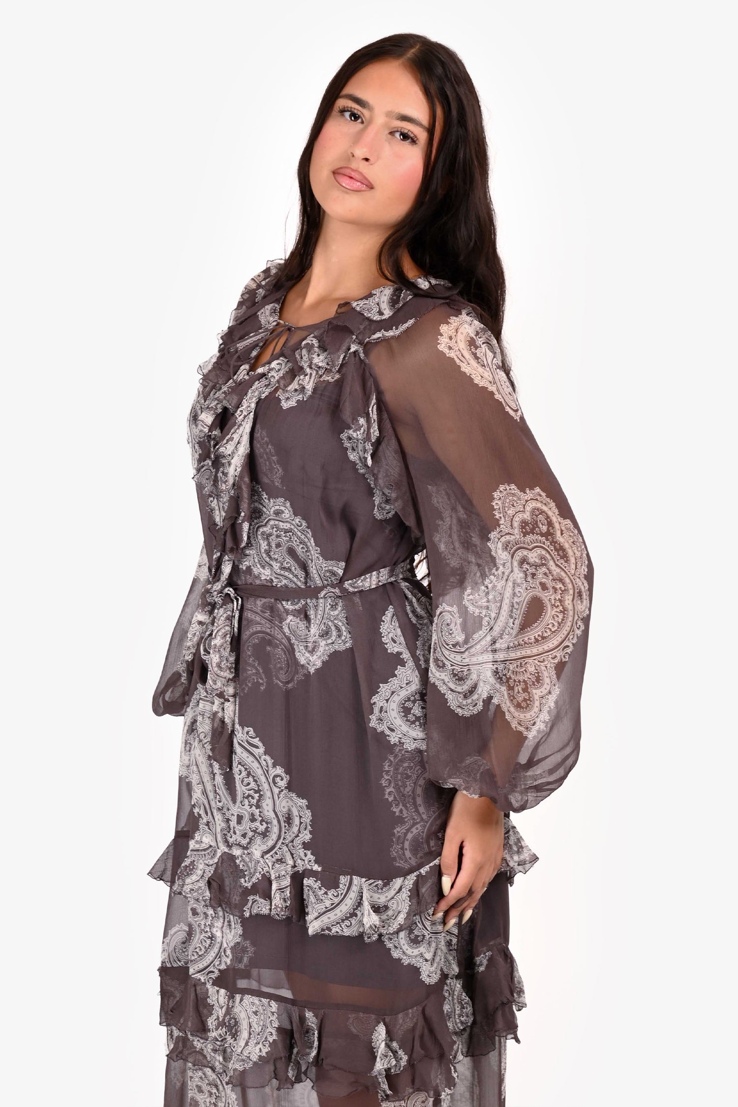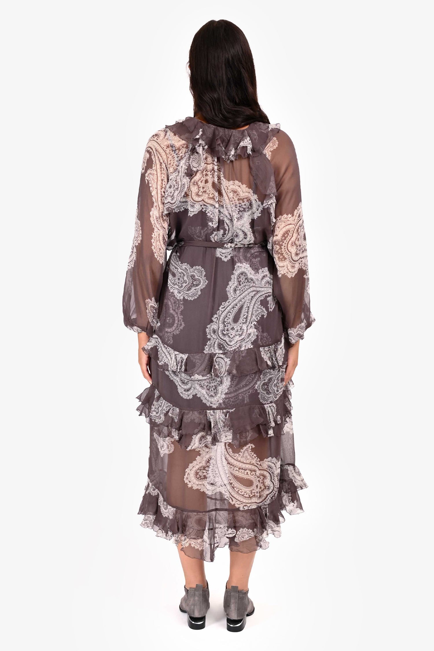 Refresh availabilityZimmerman Grey/White Paisley Sheer Maxi Dress. Slip-on. V-neckline with a single button closure and adjustable tie detail. Removable belt. Ruffle detailing throughout. Interior slip dress with adjustable shoulder straps. Scalloped thread detailing along the neckline. Gold-tone hardware. Tonal stitching.
