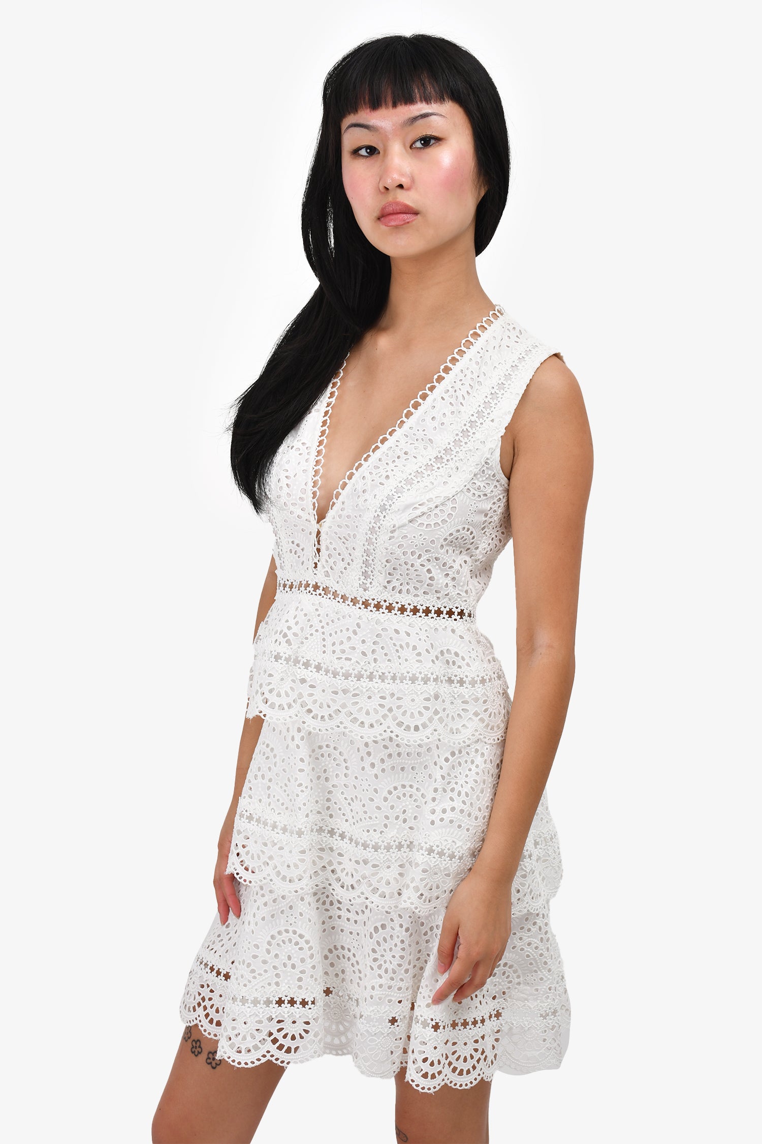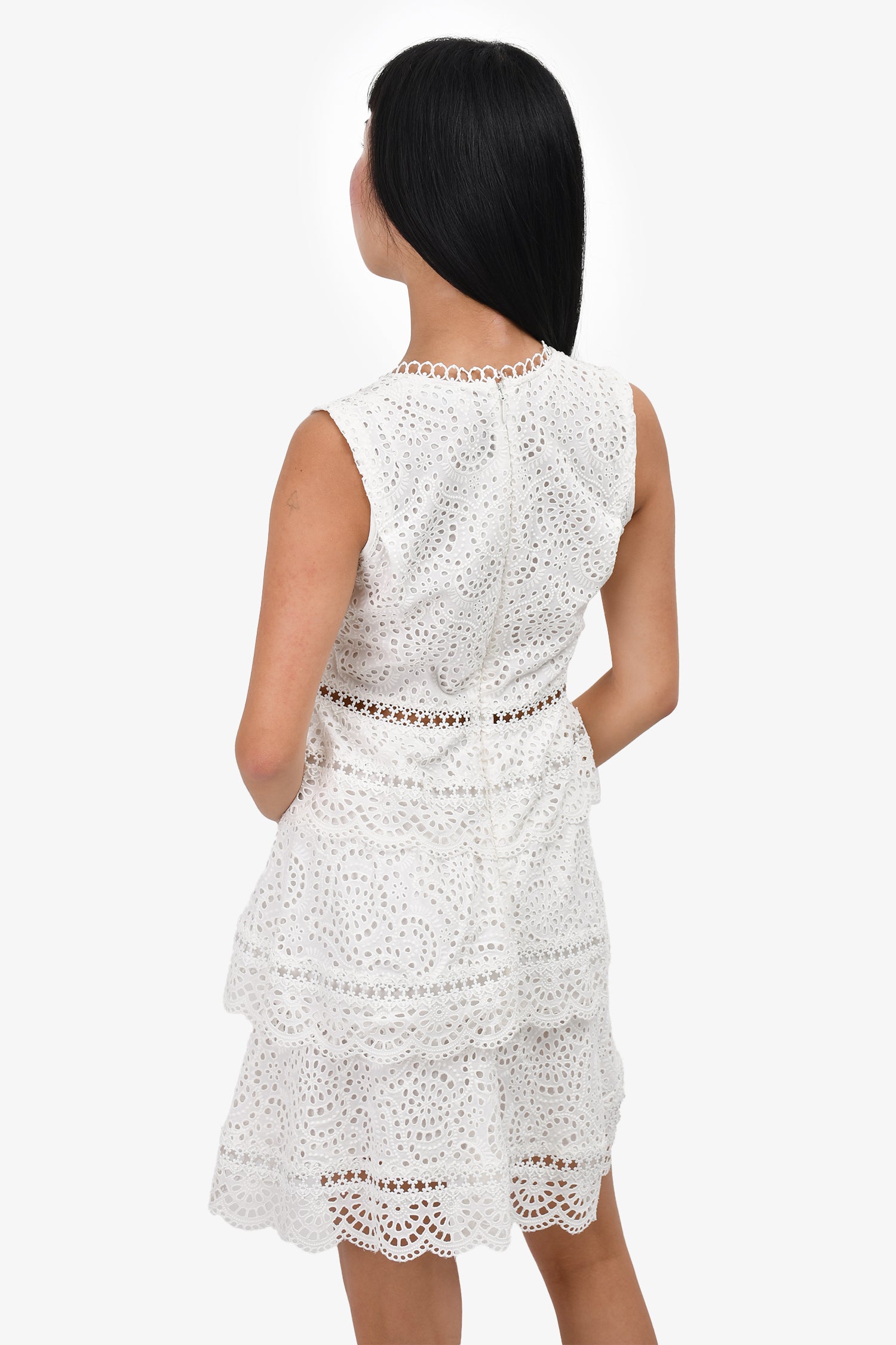 Refresh availabilityZimmerman White Eyelet Lace Sleeveless Mini Dress. Rear zip closure. Lined. V-neck.