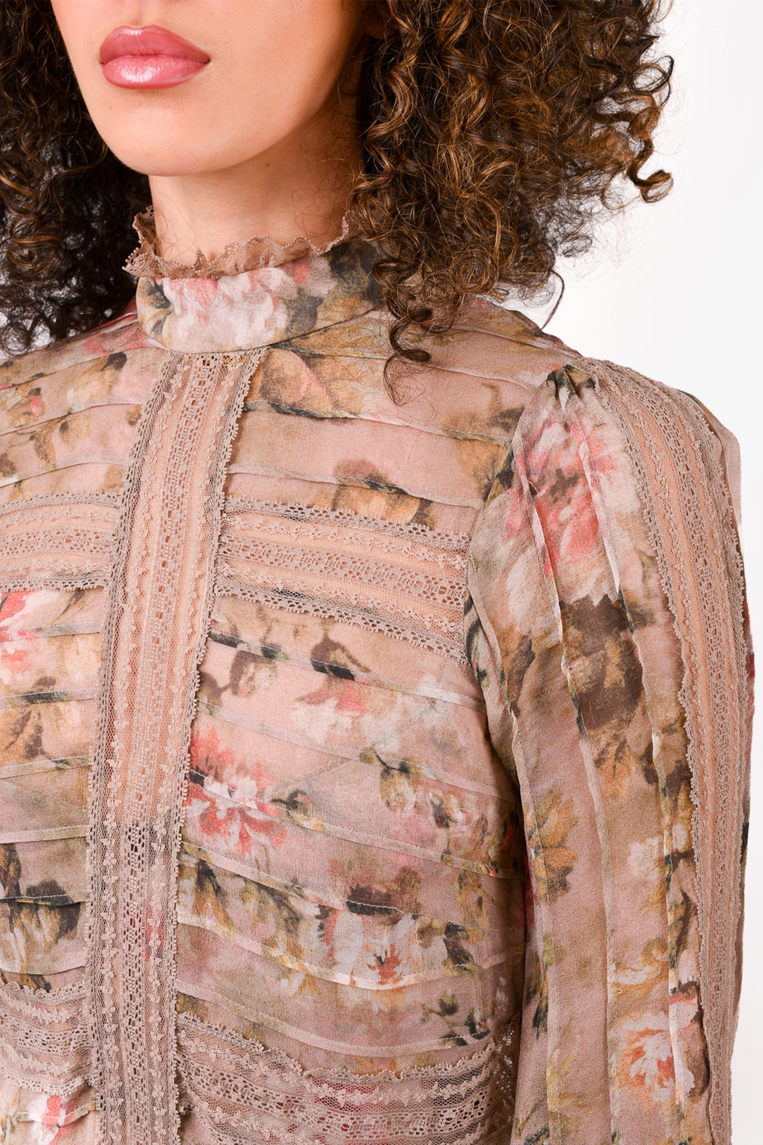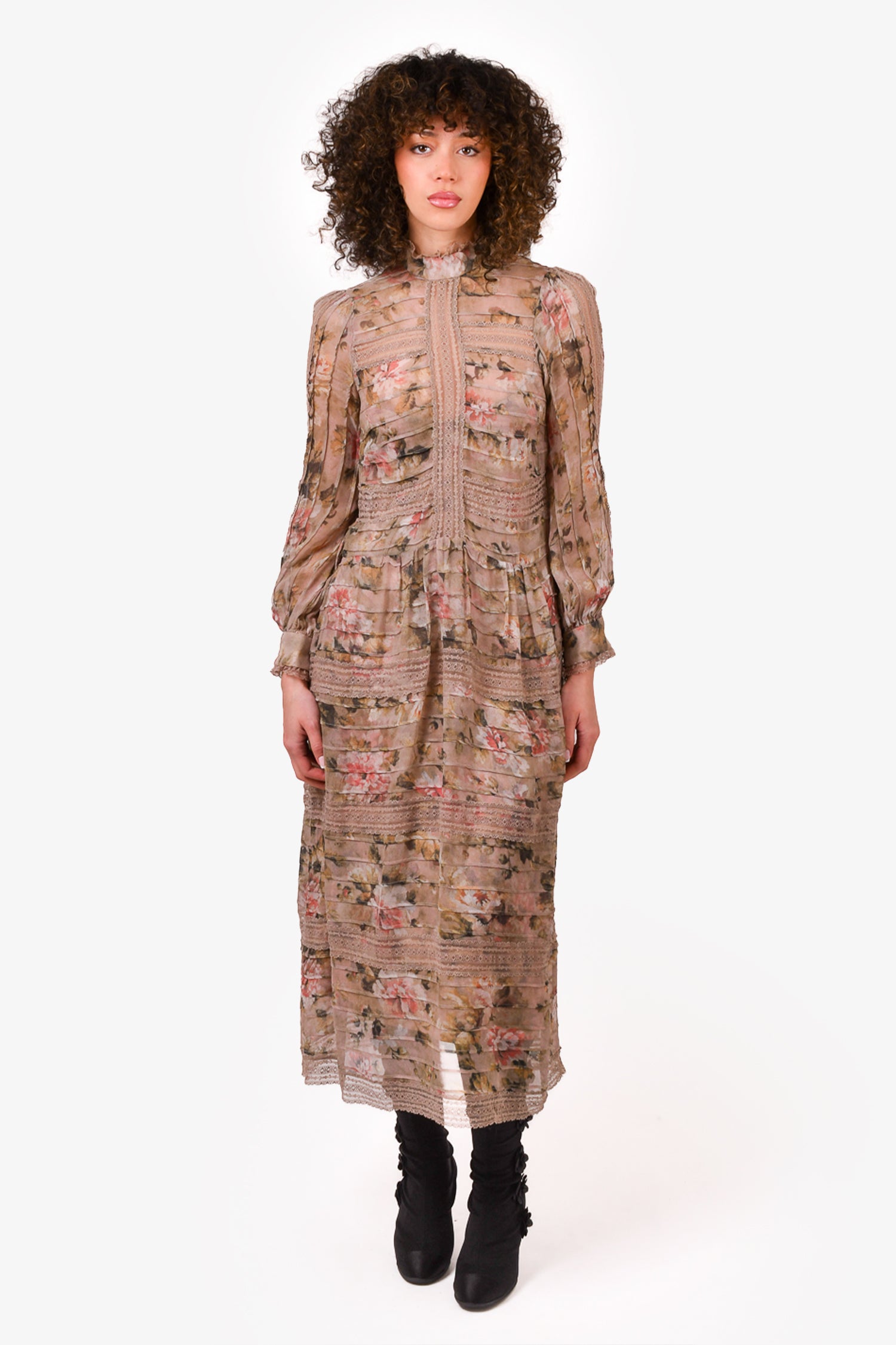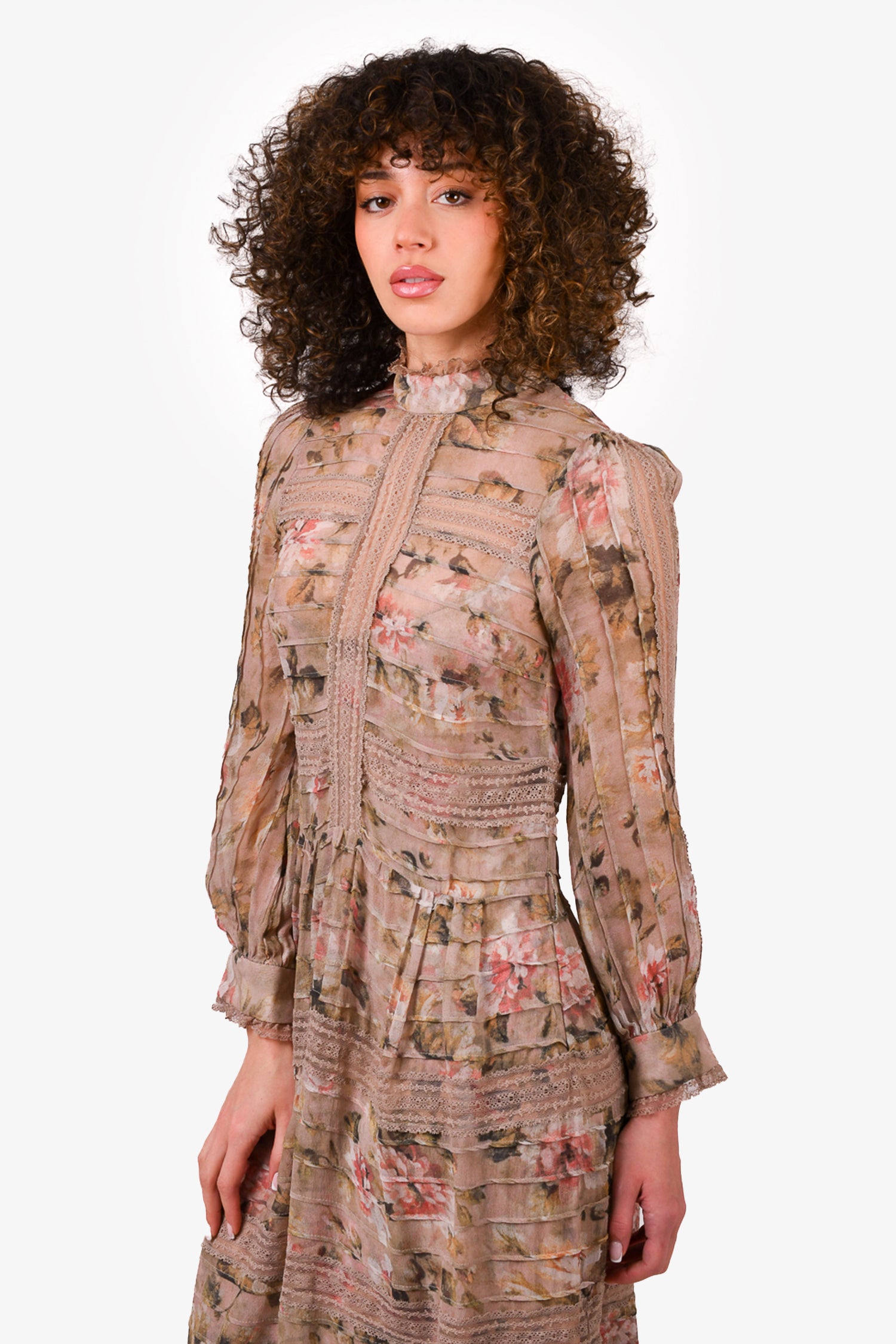 Refresh availabilityZimmermann Beige/Pink Silk Patterned Dress with Slip. Rear zip closure. Button closure on the cuffs. Tonal stitching.