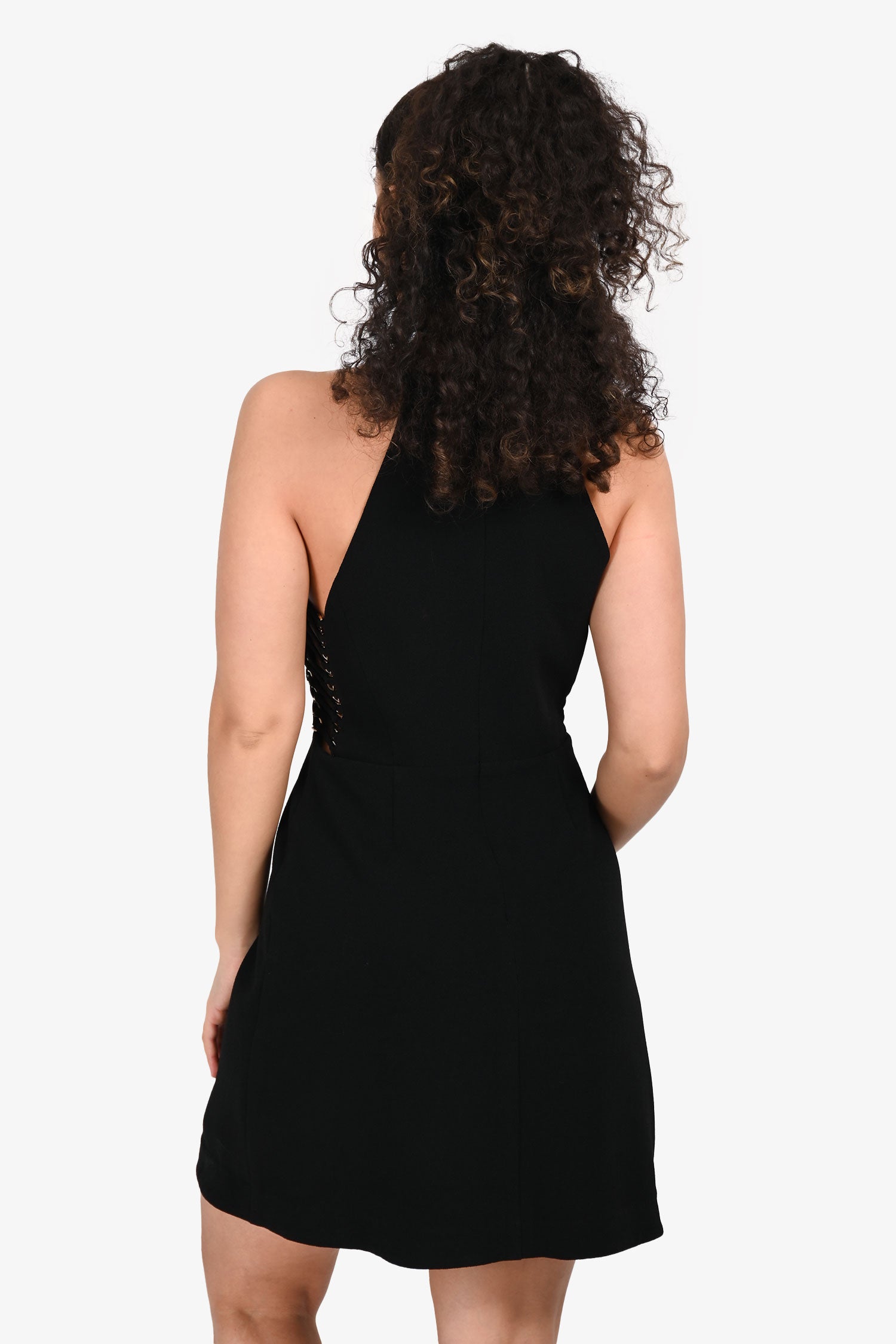 Refresh availabilityZimmermann Black Lace Side Mini Dress. Slip-on. High neckline. Rear zip and clasp closure. Lined skirt. Gold-tone hardware. Tonal stitching.