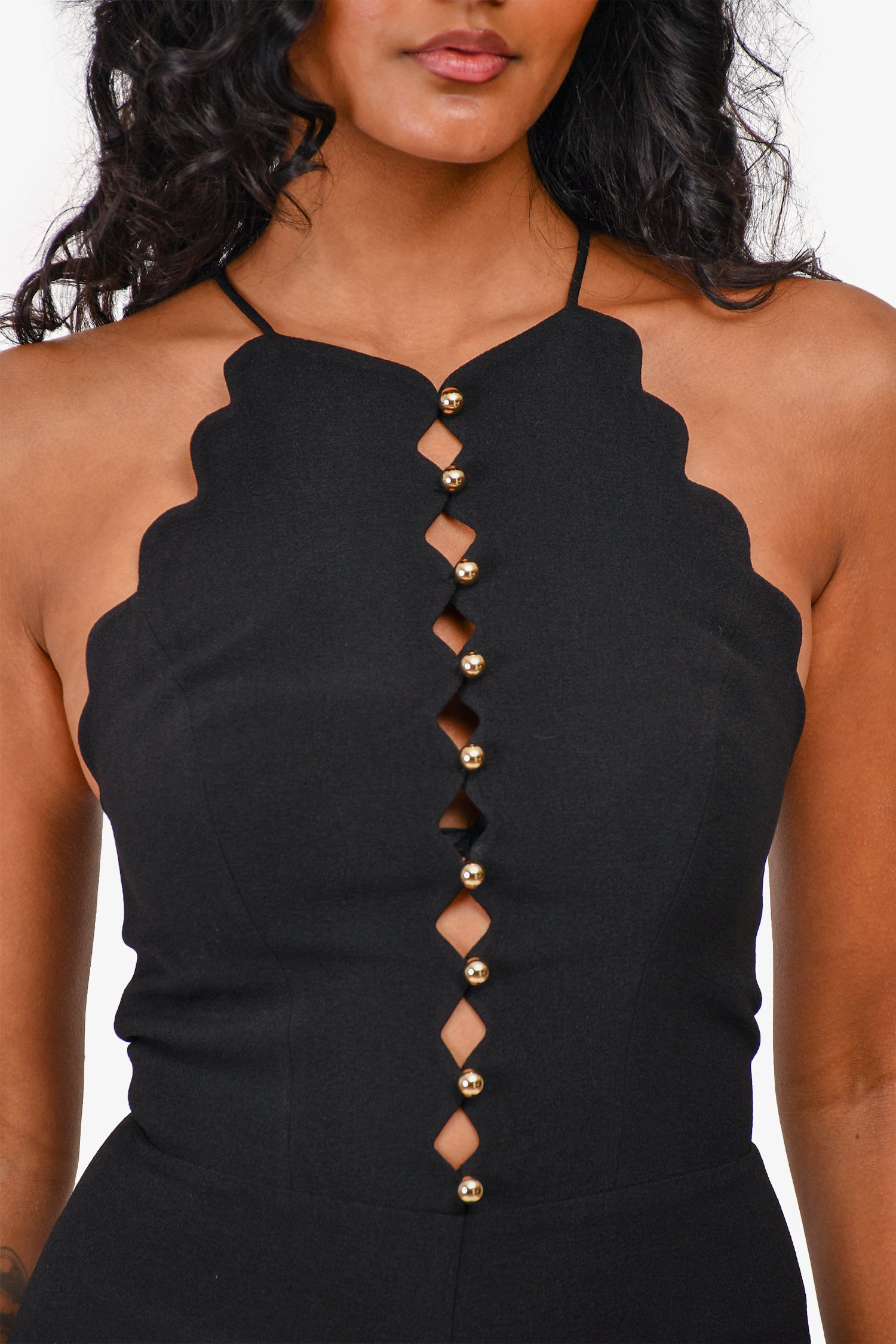 Refresh availabilityZimmermann Black Sleeveless High Neck Jumpsuit. Gold-tone button detail. Concealed zipped closure at the rear. Tonal stitching.