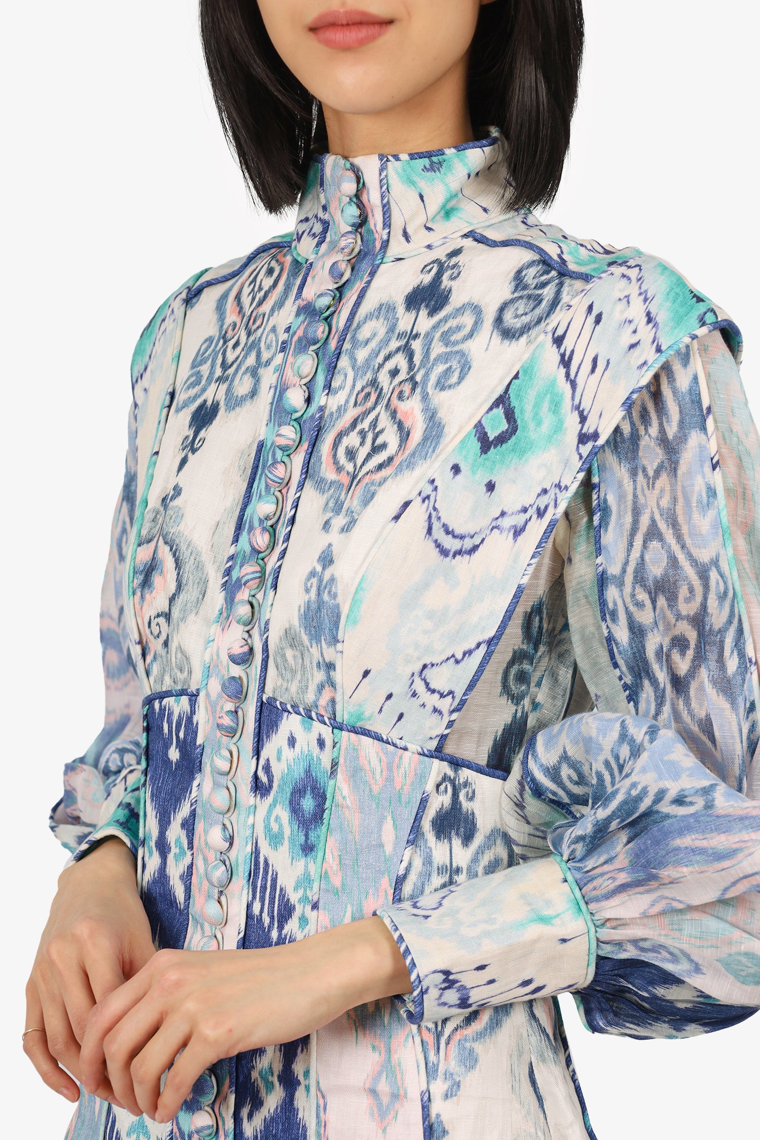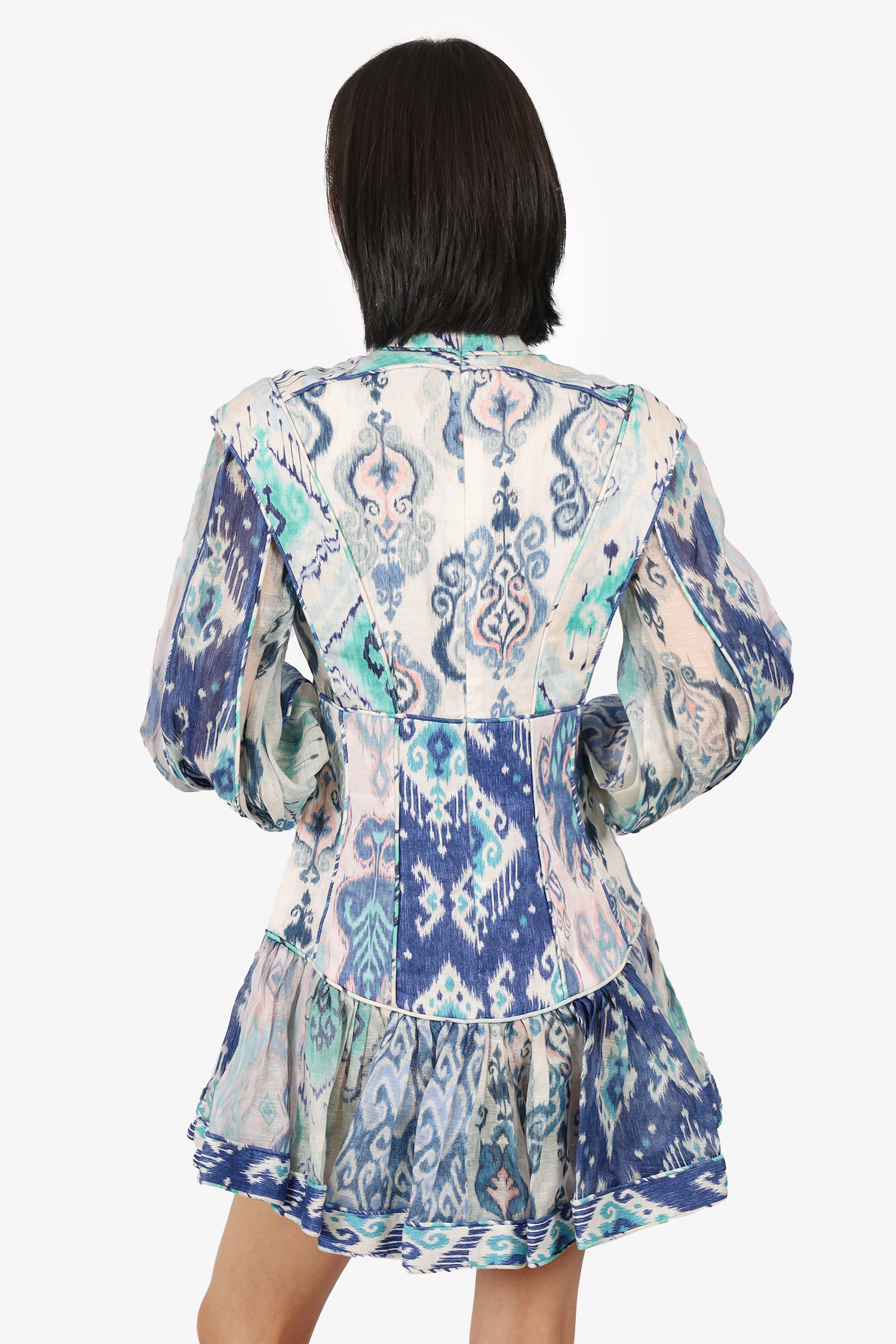 Refresh availabilityZimmermann Blue Glassy Fluted Linen Mini Dress. Pull-on. Mock-neckline. Front button-up closure and rear zip closure. Sleeve cuffs with button-up closure. Sheer side panels, sleeves and skirt. Partially lined interior. Tonal stitching.