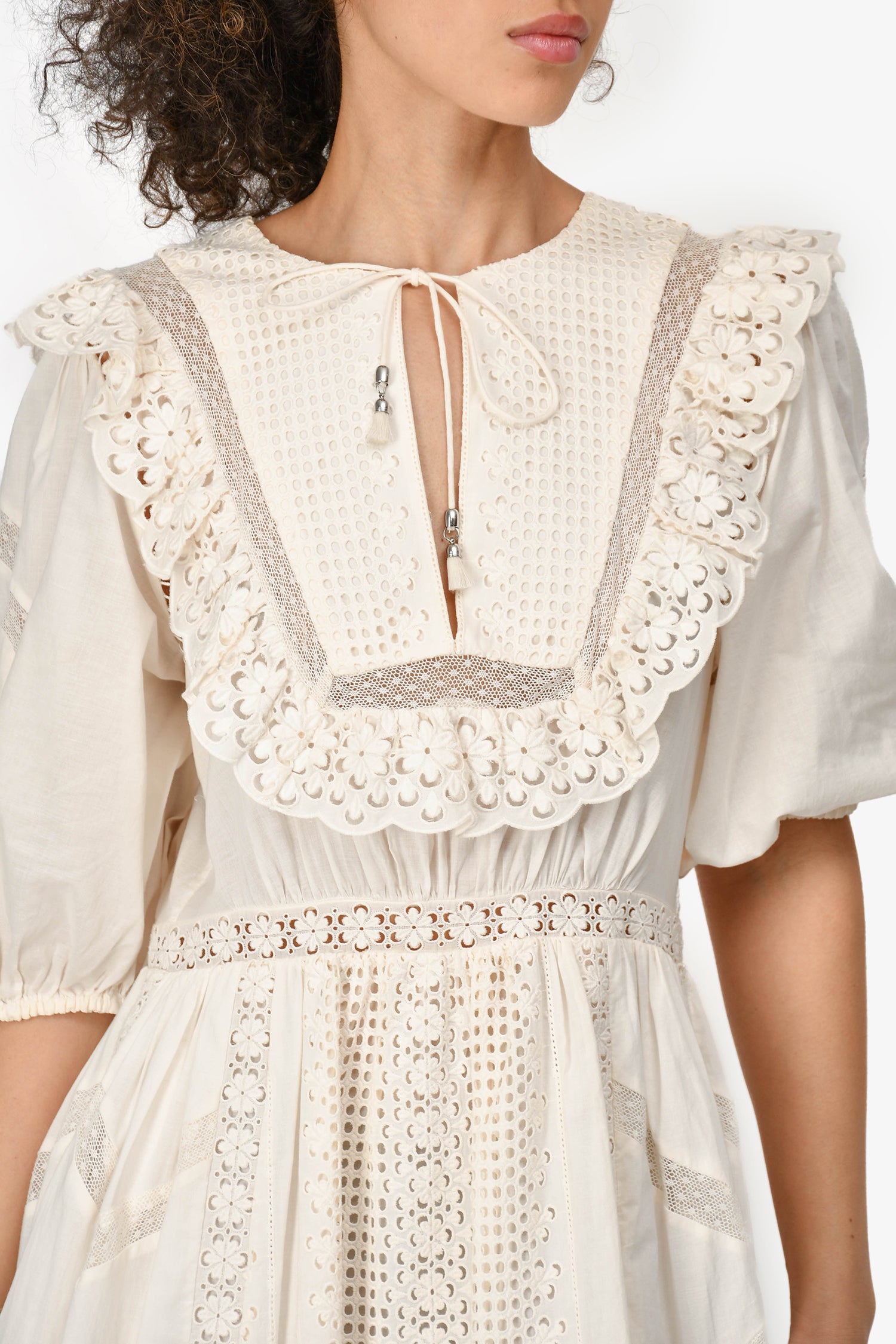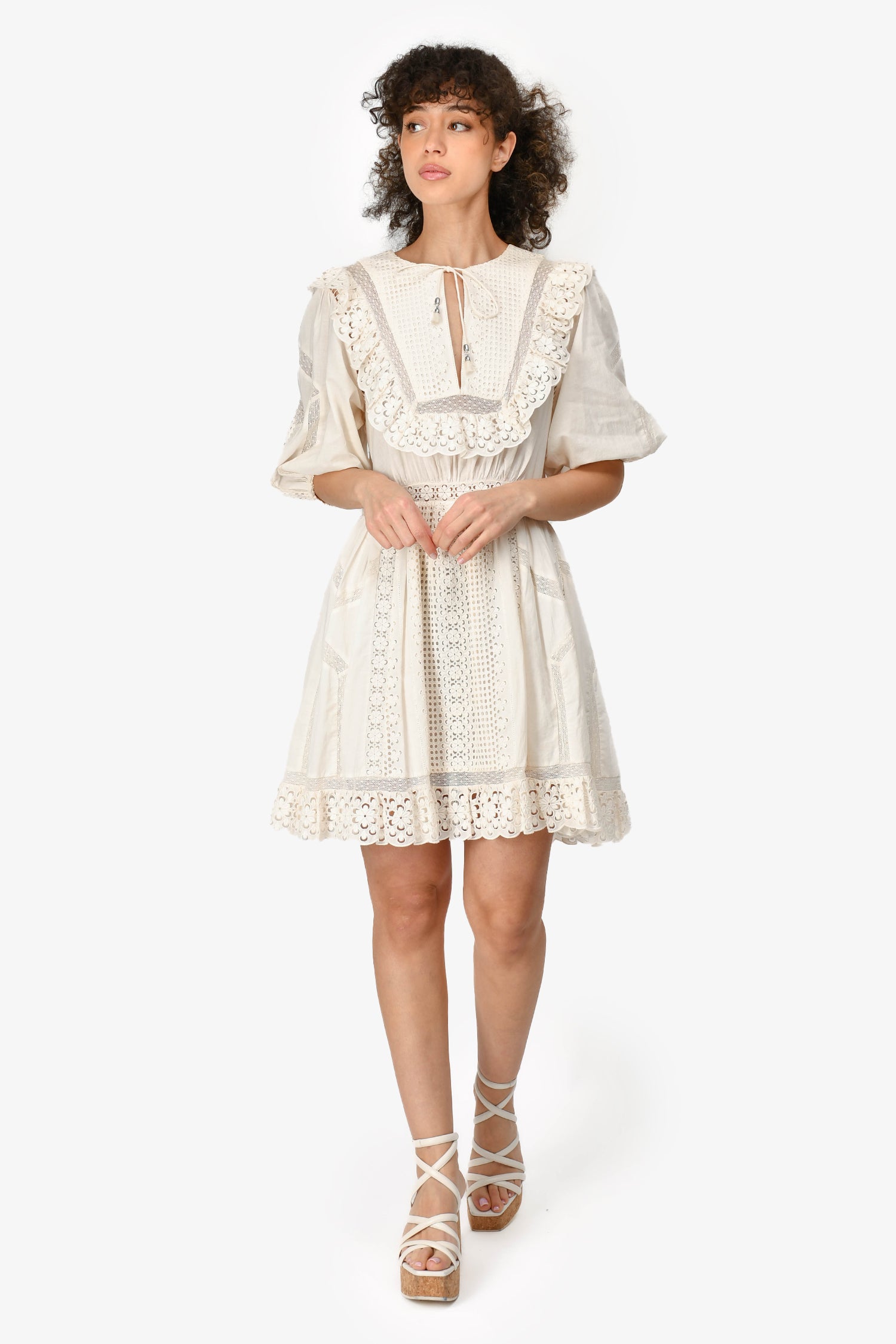 Zimmermann Cream Eyelet Mini Dress. V-neckline with tie-up closure. Quarter sleeves. Lace trim detailing on the hem. Hidden back zipper closure. Tonal stitching.
