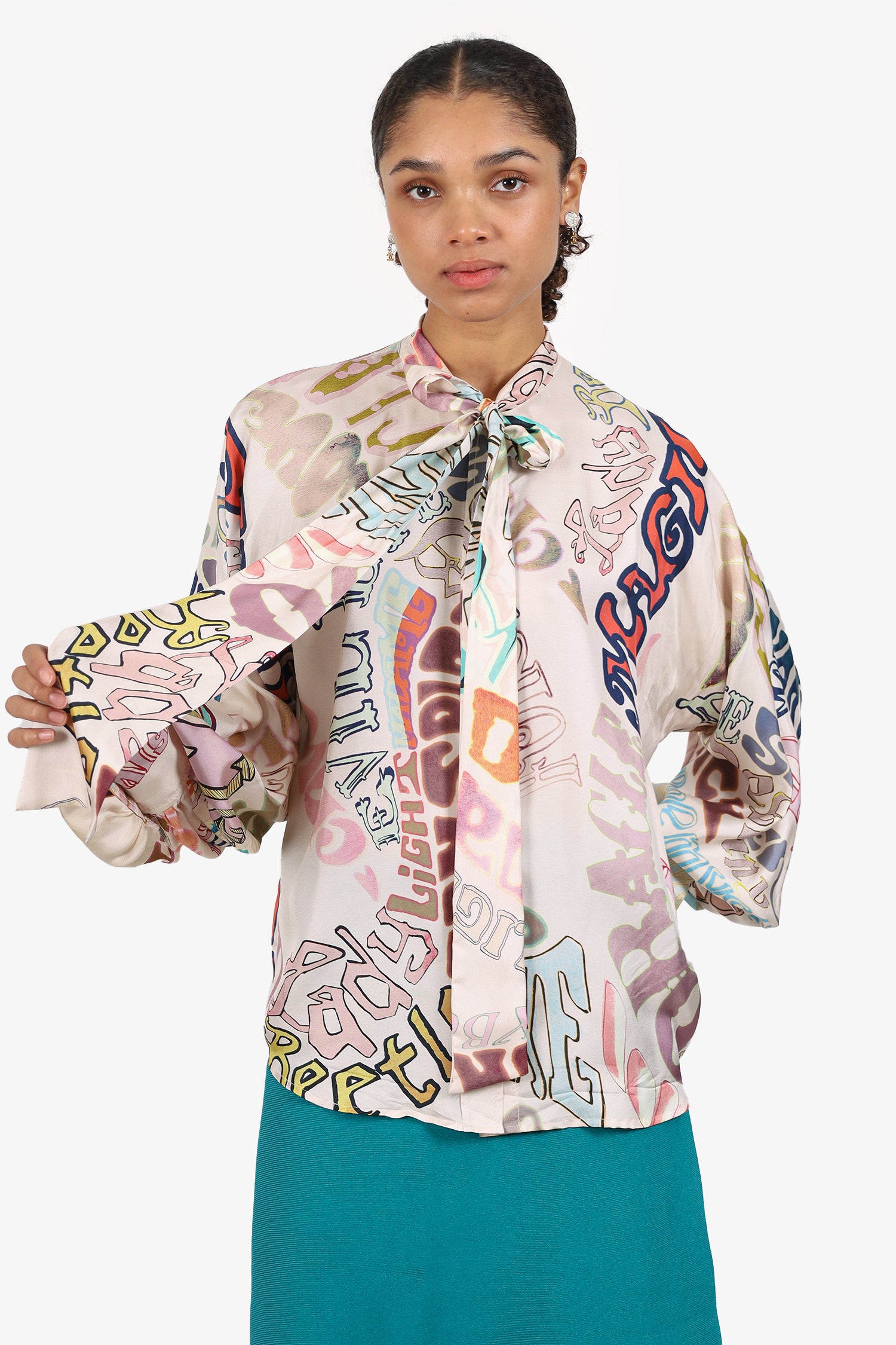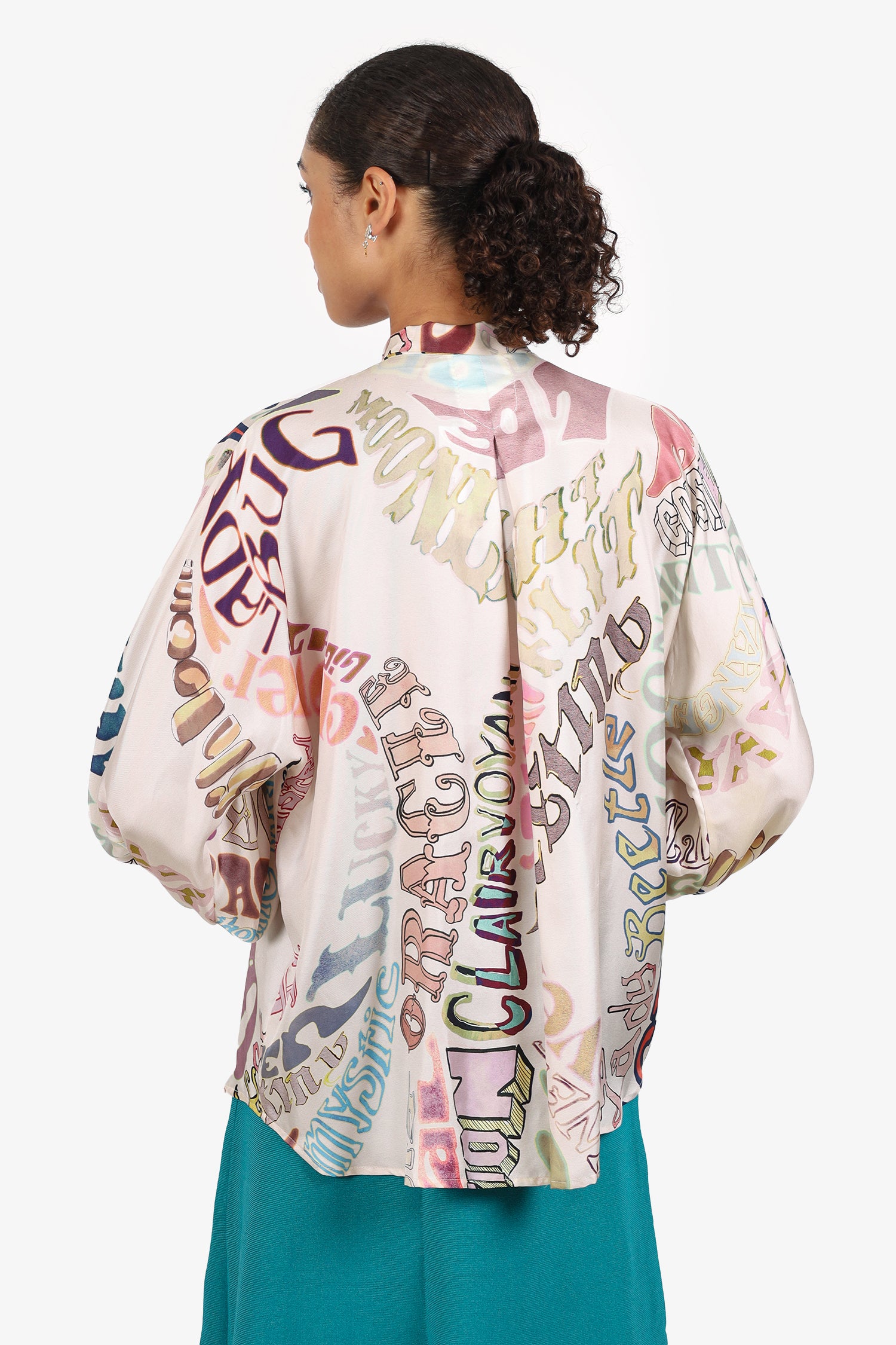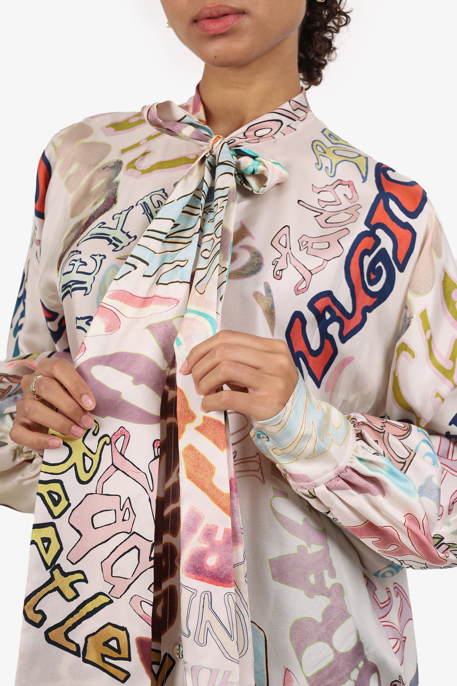 Refresh availabilityZimmermann Cream/Multicolour Silk 'Ladybeetle' Word Print Blouse. Pull-on. Round-neckline. Front button-up with tie-up closure. Sleeve cuffs with button-up closure. Tonal stitching.