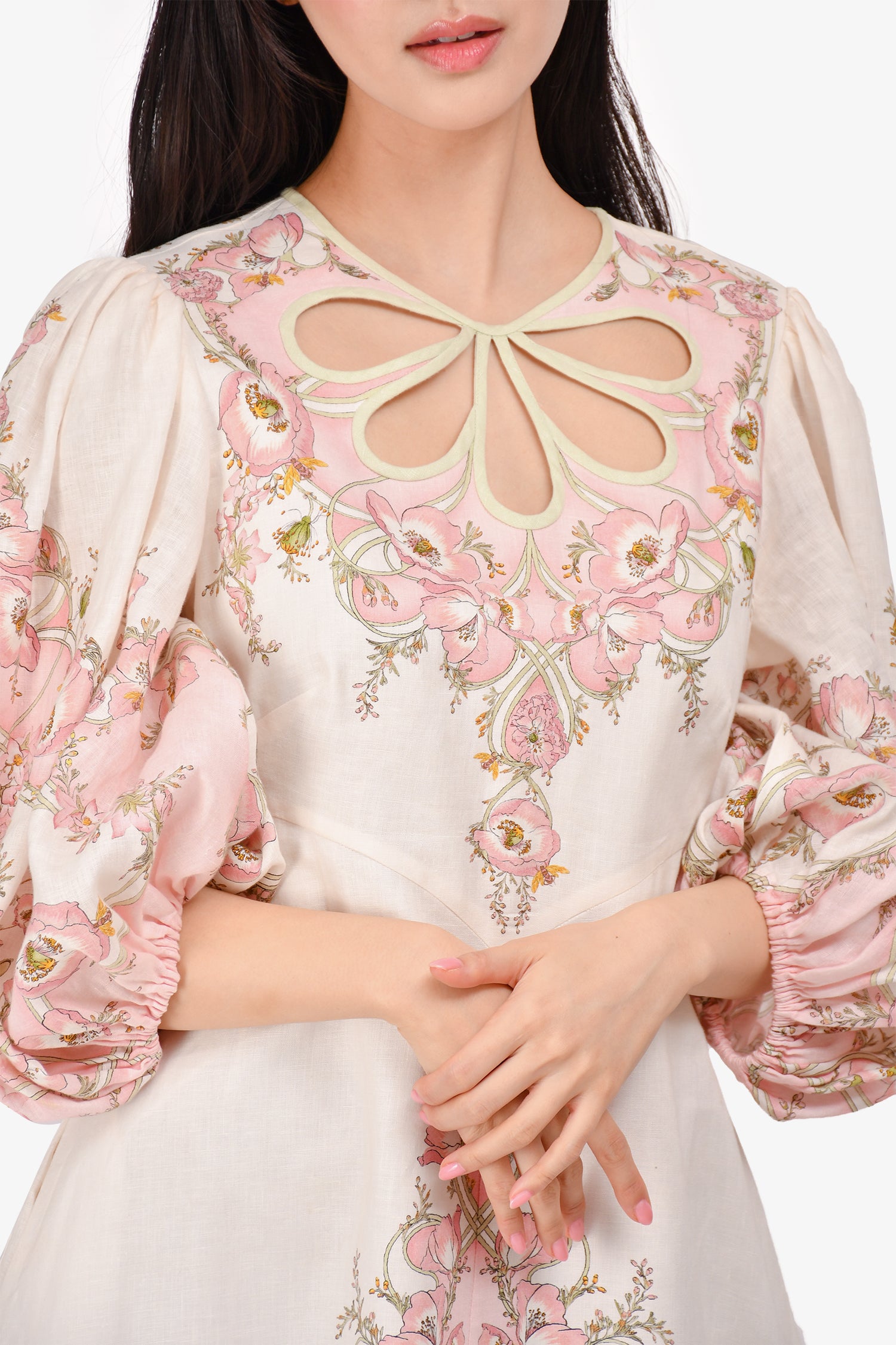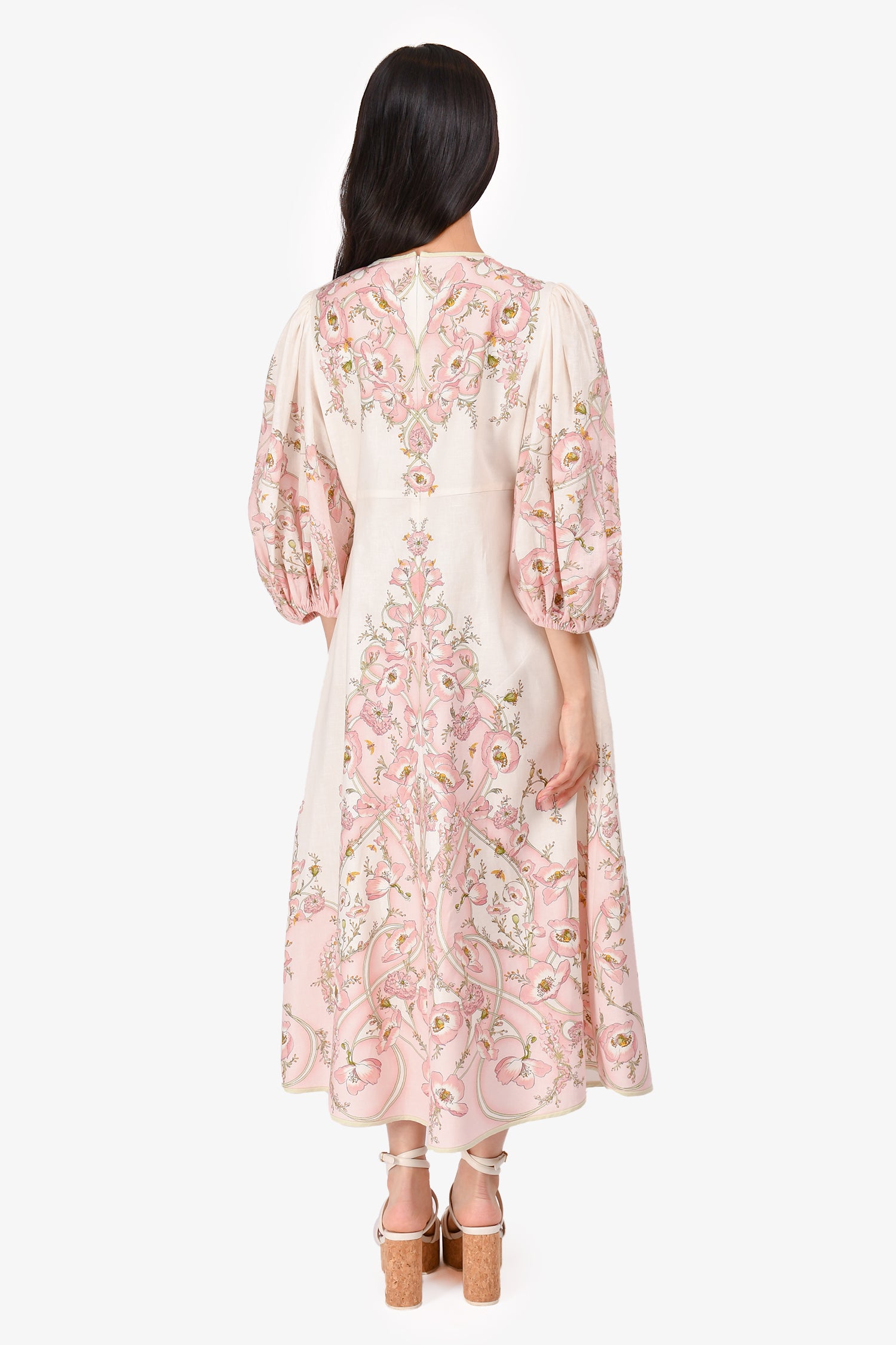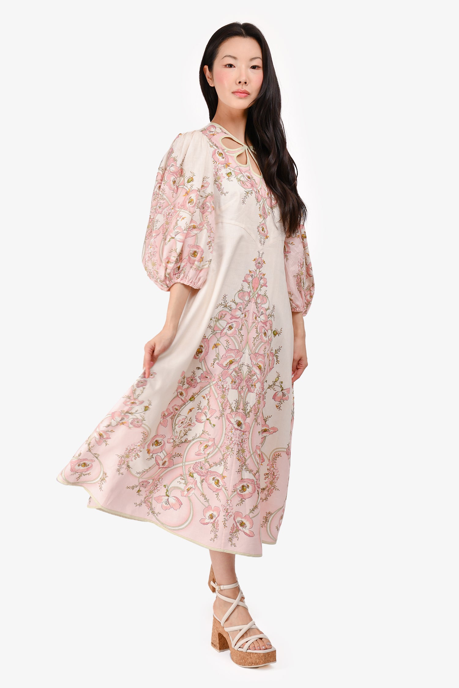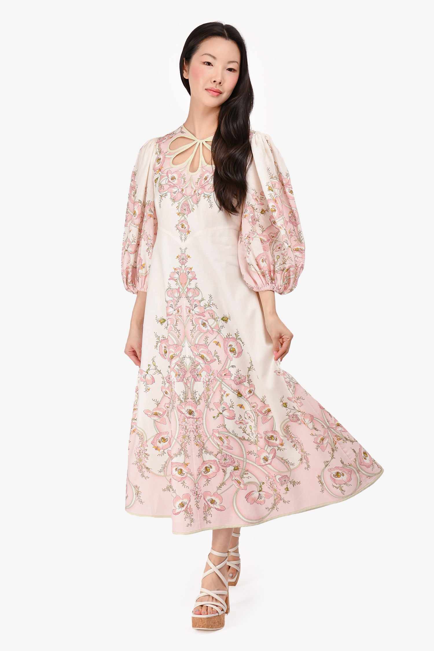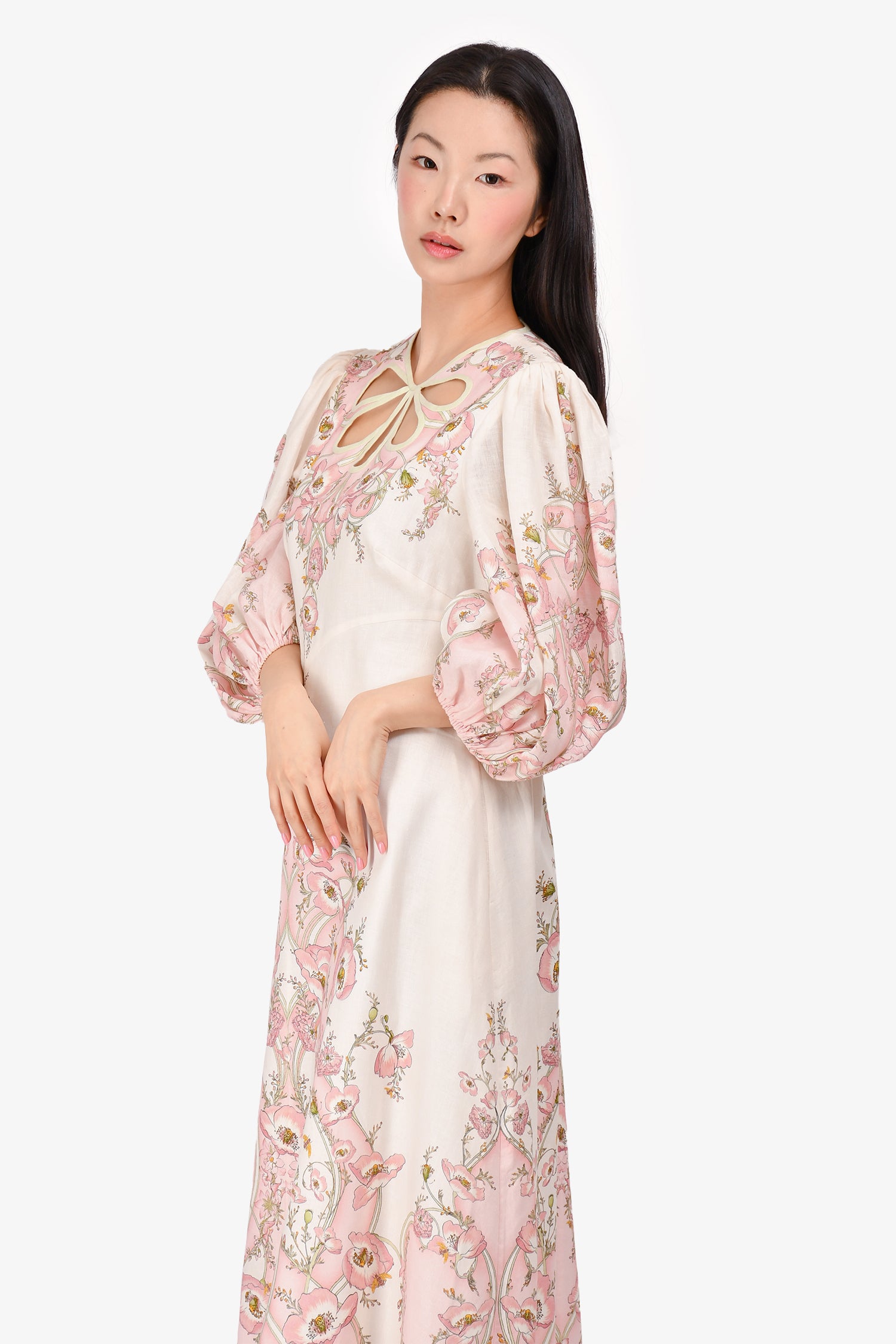 Refresh availabilityZimmermann Cream/Pink Floral Pattern Long Sleeve Maxi Dress. Rear zip closure. Front cutout detail. Side pockets. Lined. Tonal stitching.
