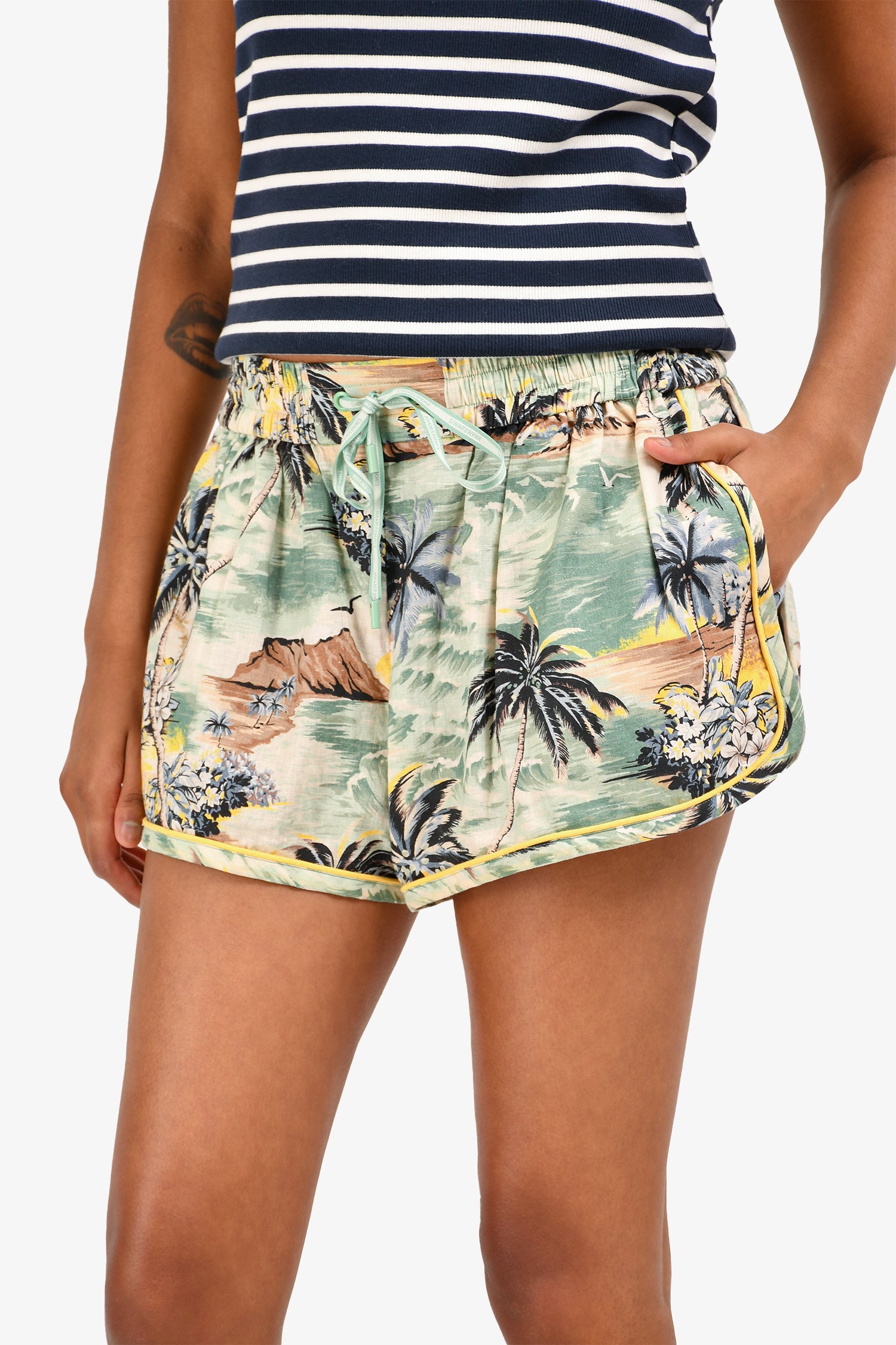 Refresh availabilityZimmermann Green Multicolour Beach Print Cotton Linen Blend Shorts. Side slip pockets. Elasticized waistband. Drawstring on the waistband. Tonal stitching.