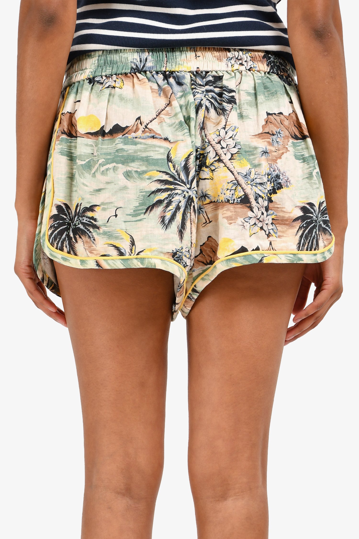 Zimmermann Green Multicolour Beach Print Cotton Linen Blend Shorts Size 1