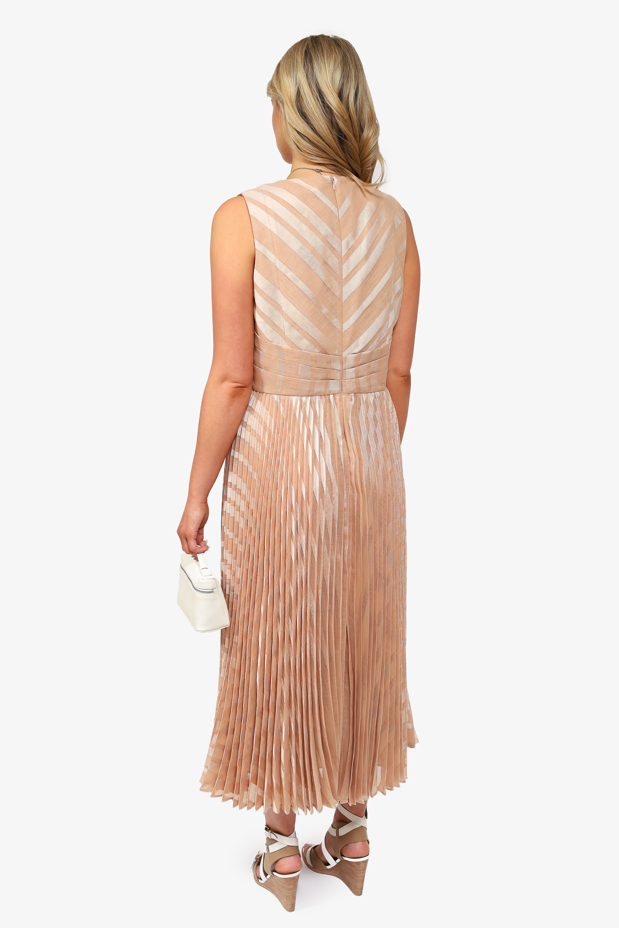 Refresh availabilityZimmermann Nude Pleated Stripe V-Neck Maxi Dress. Back zip closure. Deep v-neck with single button-up closure. Top half unlined, bottom half lined. Tonal stitching.