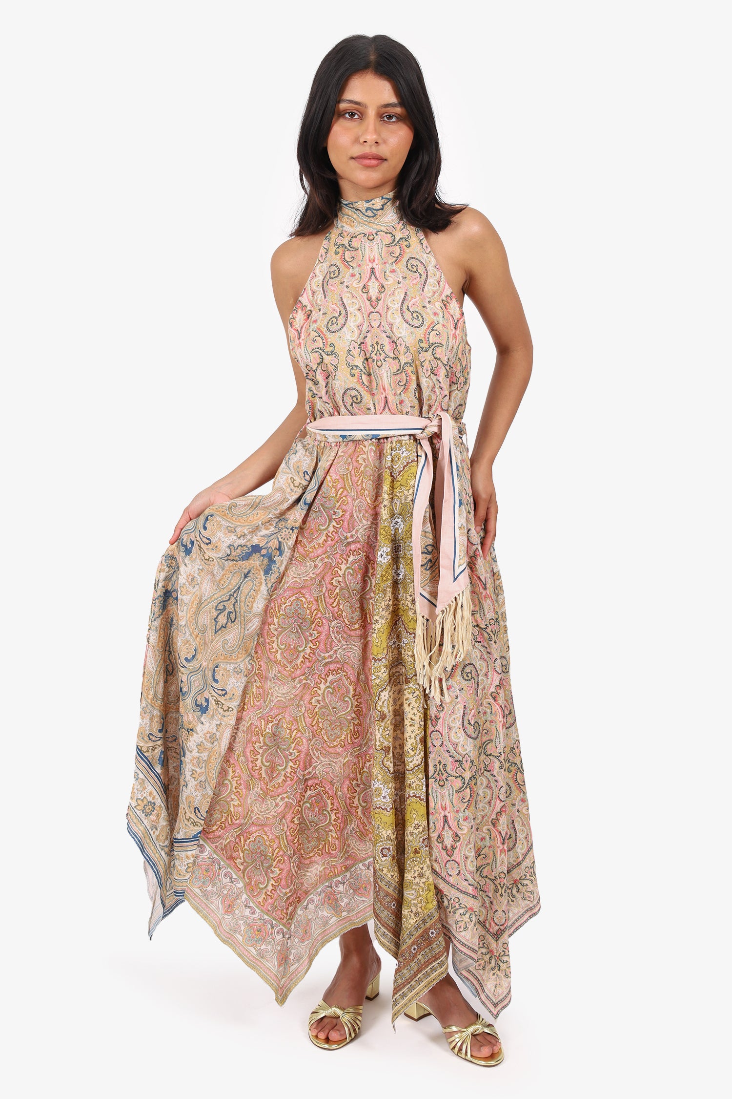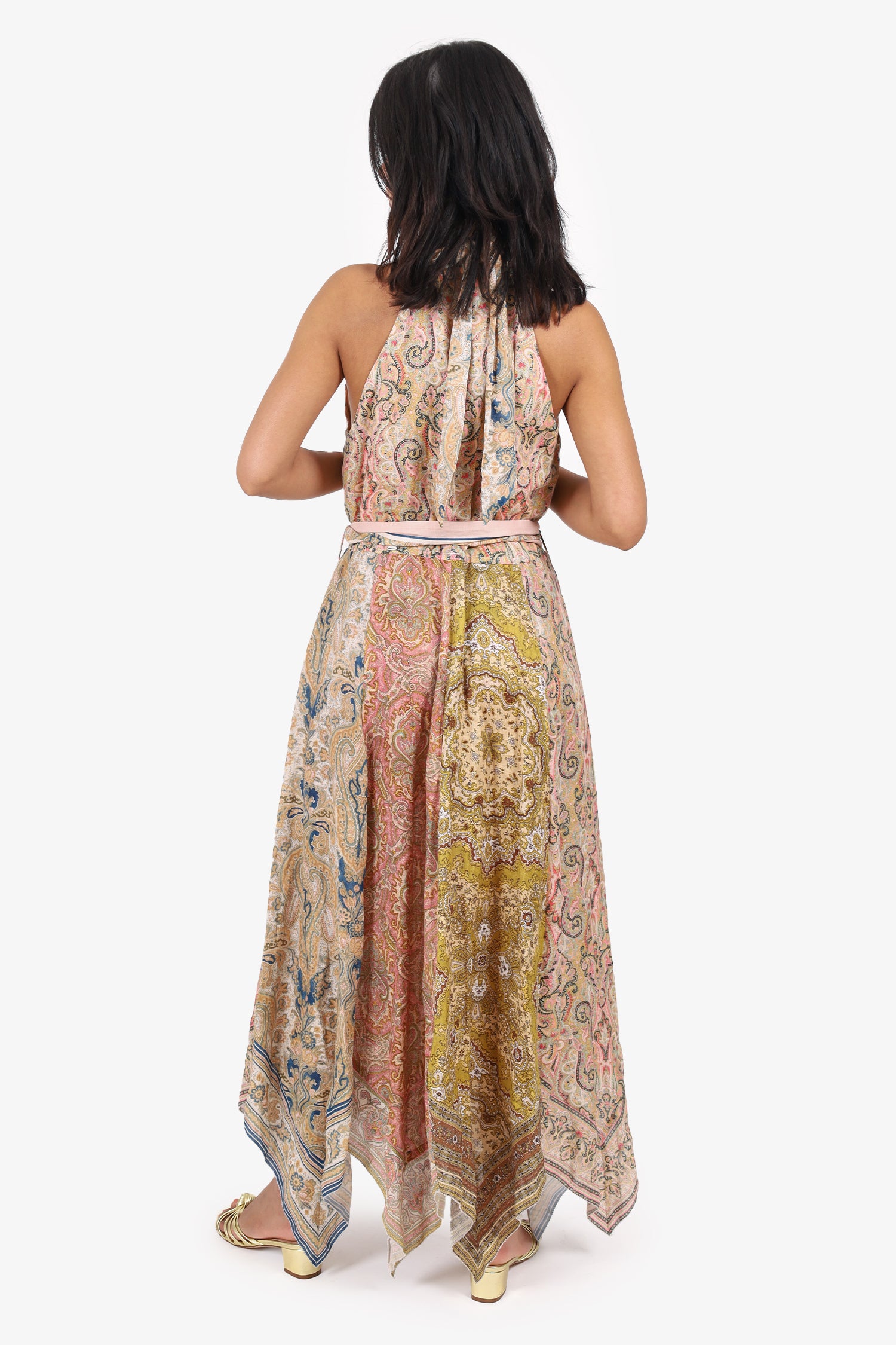 Refresh availabilityZimmermann Pink/Green Paisley Print Sleeveless Halter Neck Dress With Belt. Slip-on. Halter-neckline. Rear zip with tie-up closure. Elasticated waistband. Removable belt at waistline with tie-up closure. Asymmetrical bottom hem. Lined interior. Tonal stitching.
