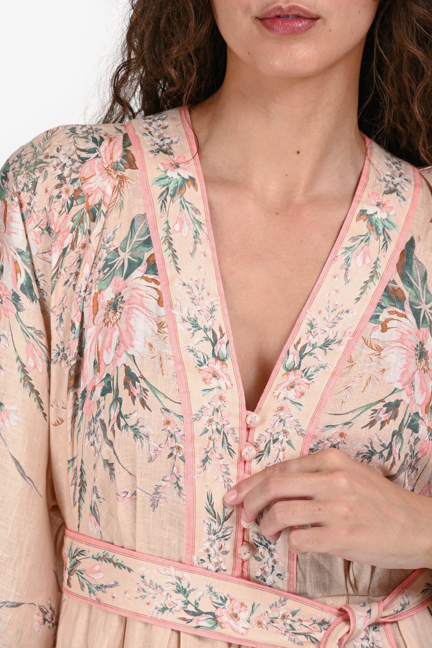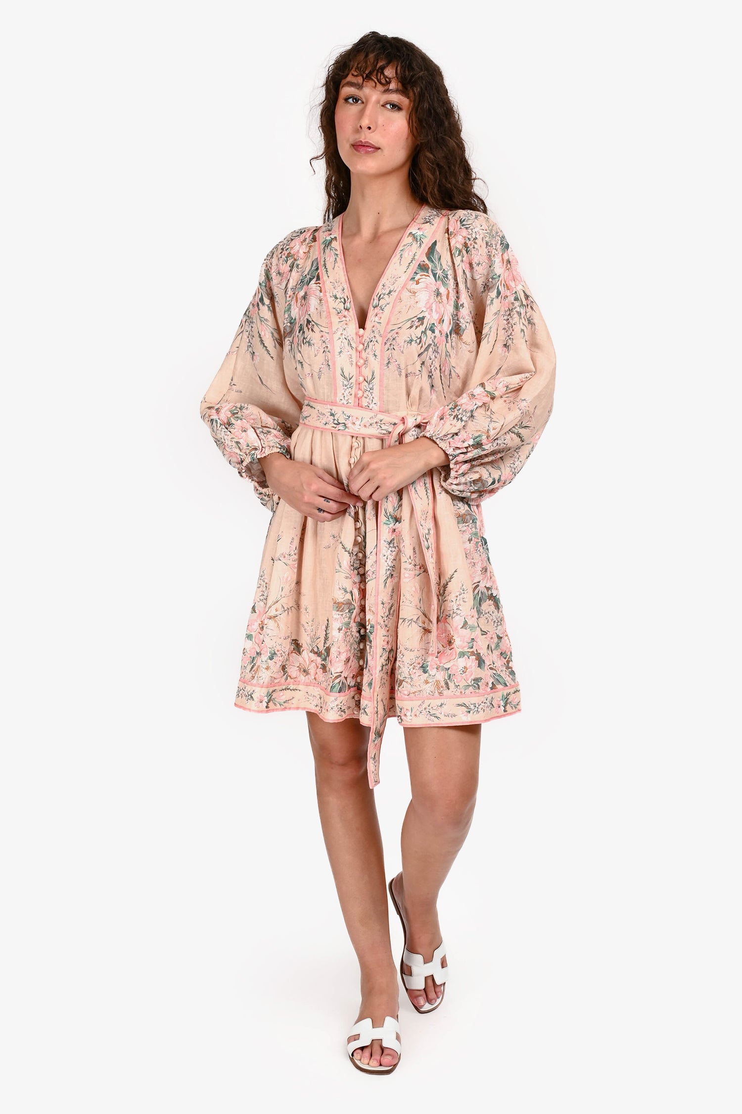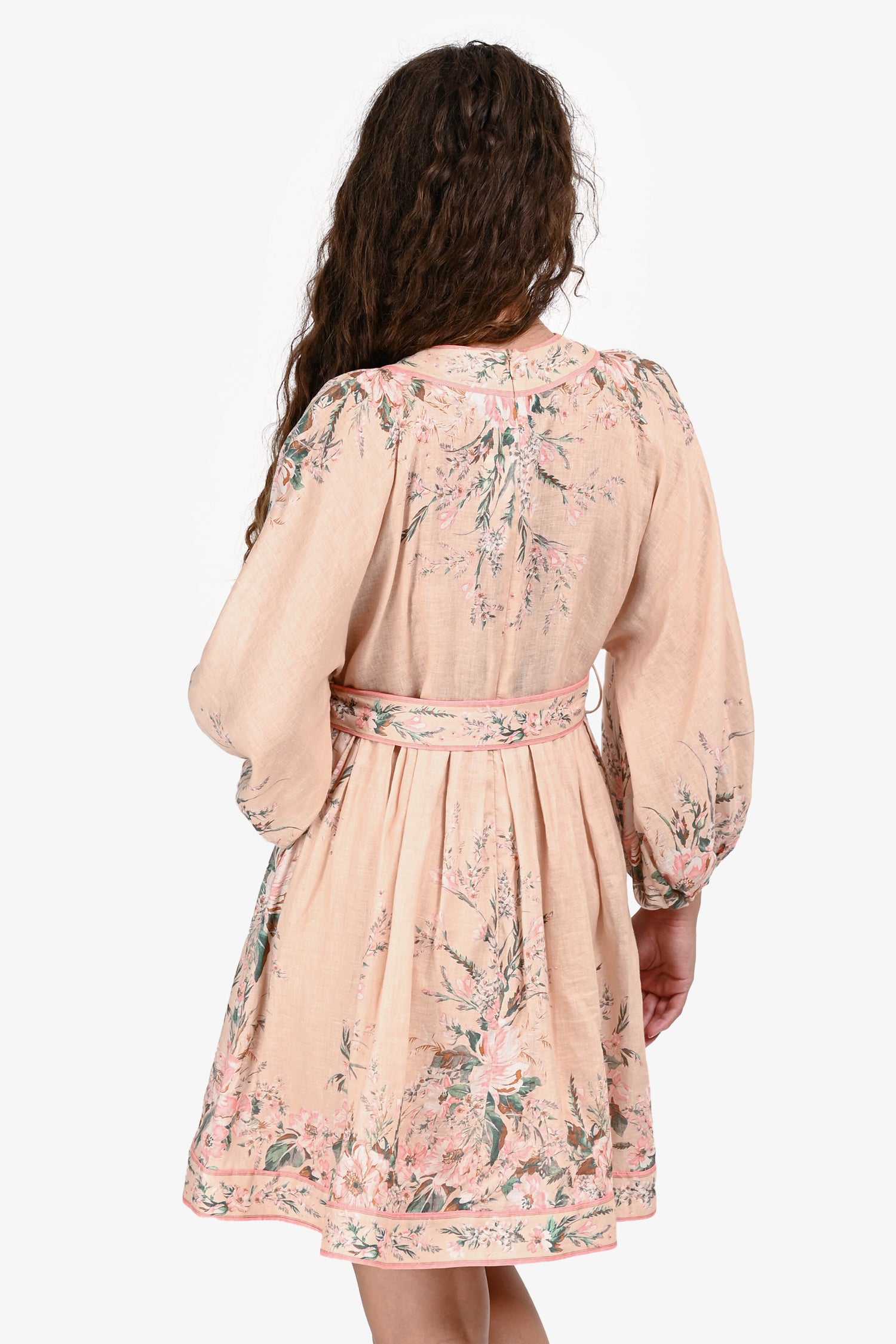 Refresh availabilityZimmermann Pink Linen Floral Printed Puff Sleeve Mini Dress. V-neckline. Long puff sleeves with elastic cuffs. Back zip closure. Matching attachable belt. Tonal stitching.