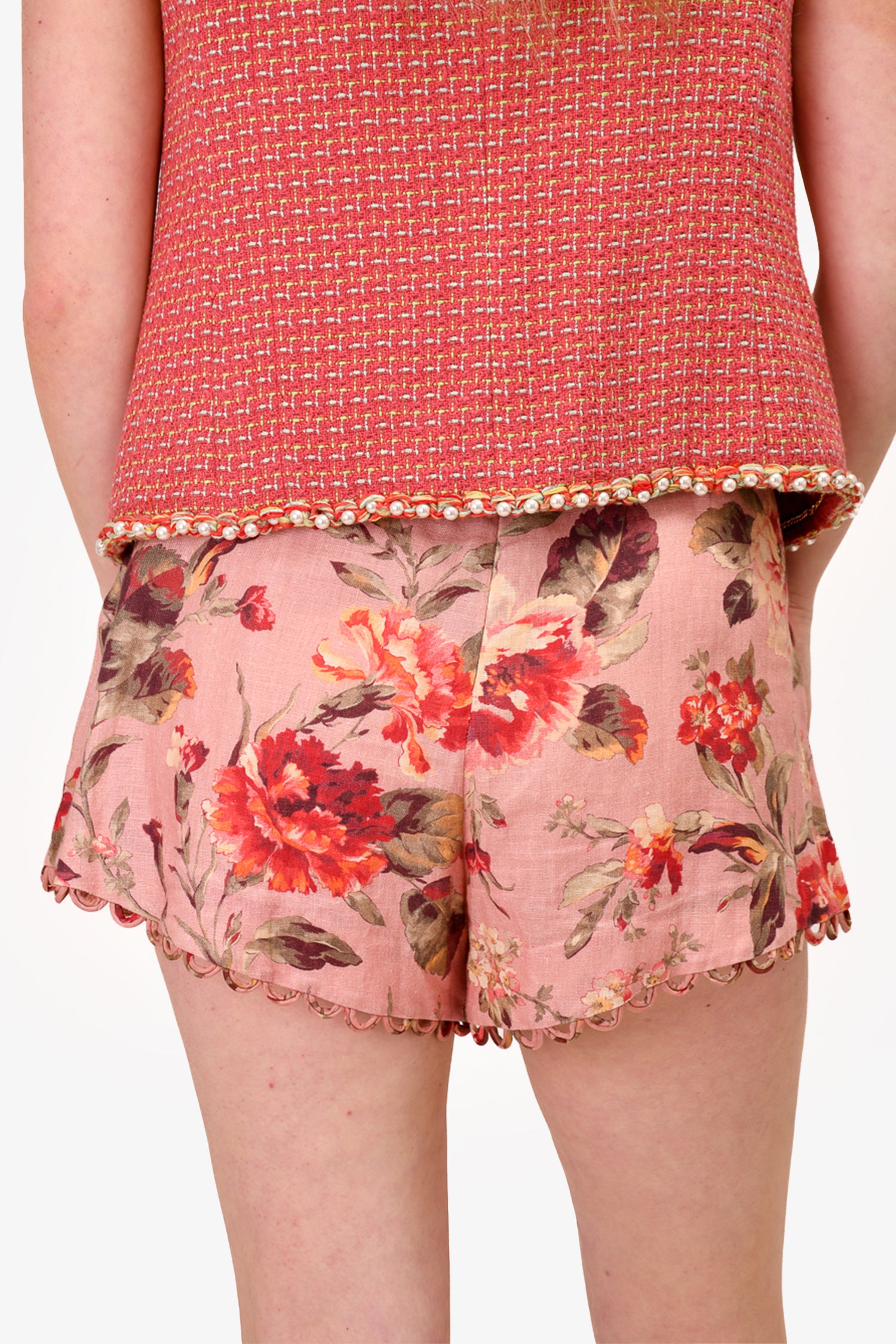 Refresh availabilityZimmermann Pink and Red Floral Linen 'Cassia' Scallop Shorts. High rise. Trim detailing on the waist and cuff. Back zipper closure. Tonal stitching.