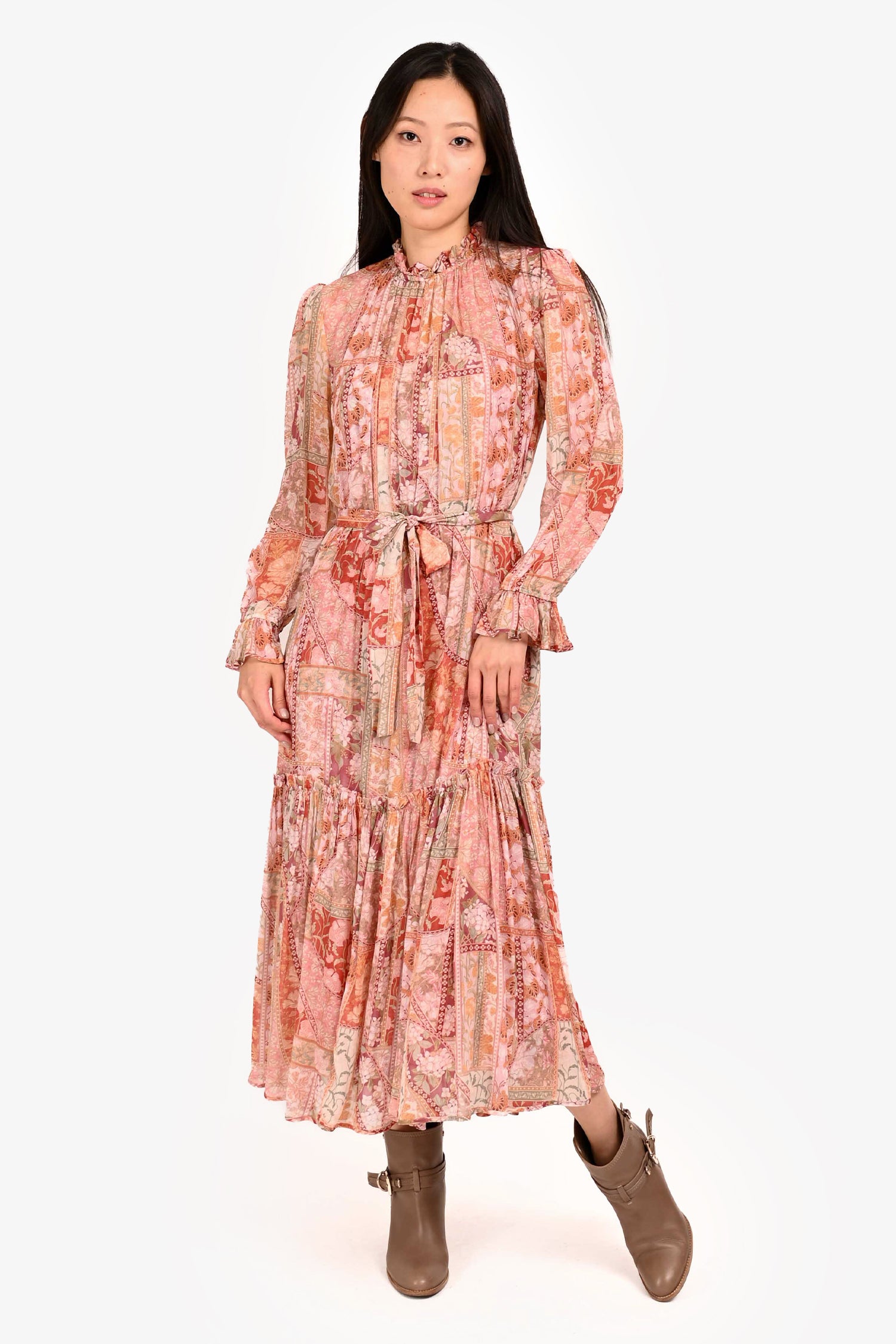 Refresh availabilityZimmermann Pink/Multicolor Floral Print Sheer Maxi Belted Dress with Slip. Elasticized neckline and cuffs with ruffle details. Detachable belt. Puckered shoulder seams. Full body slip with V-neckline. Tonal stitching.