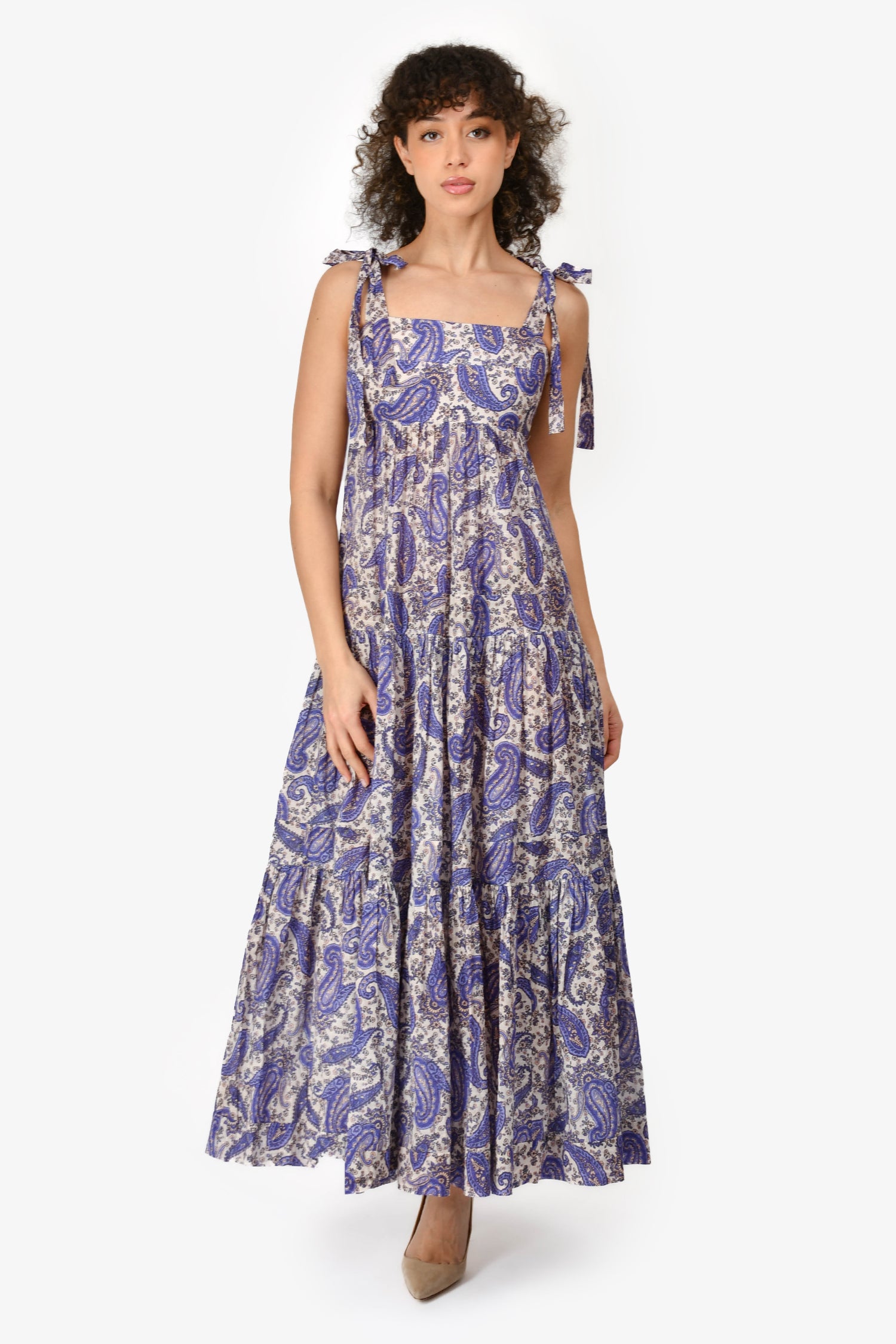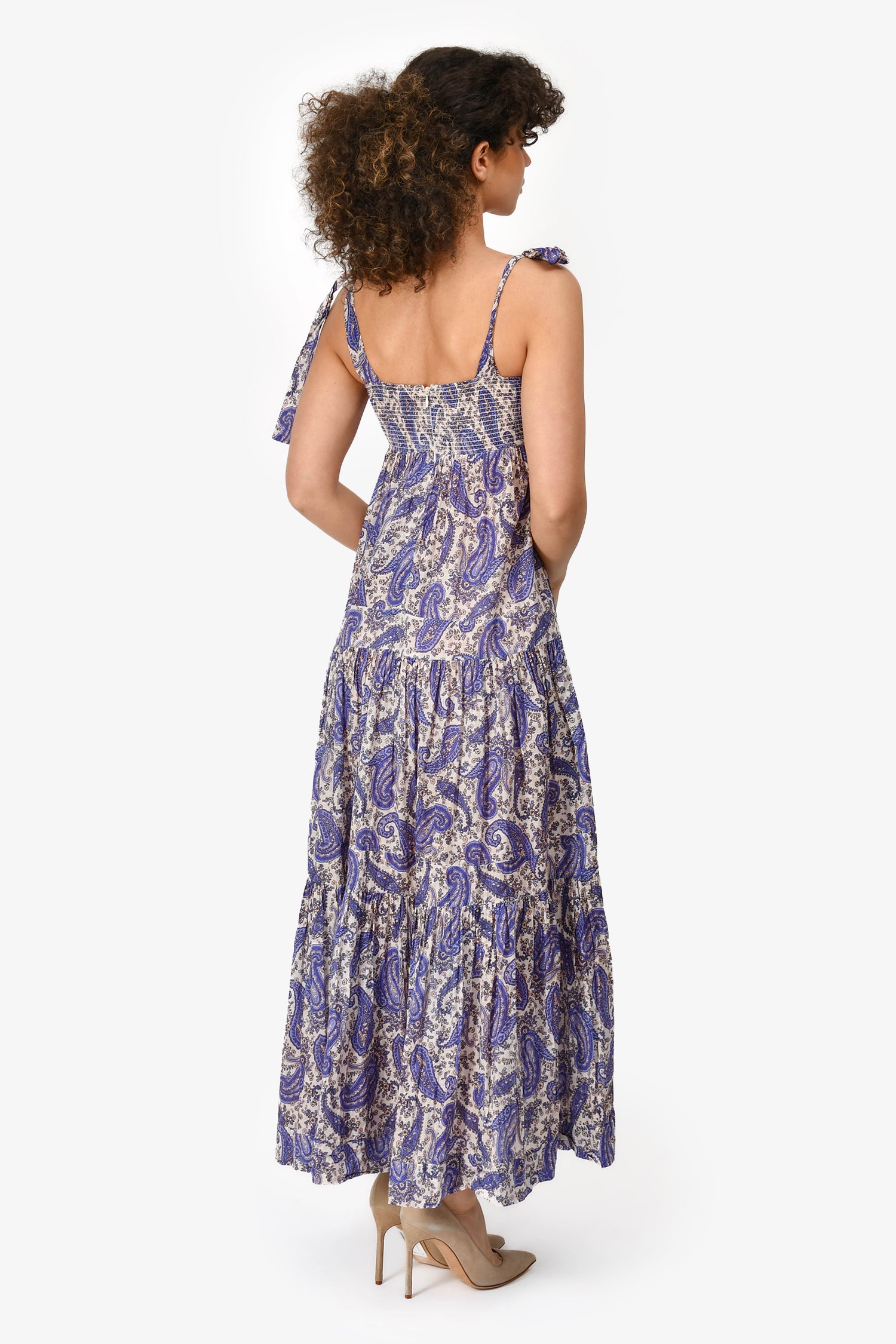 Refresh availabilityZimmermann Purple Cotton Paisley Tiered Long Dress. Back zip-up closure. Smocked panel in the back. Adjustable straps to tie. Tonal stitching.