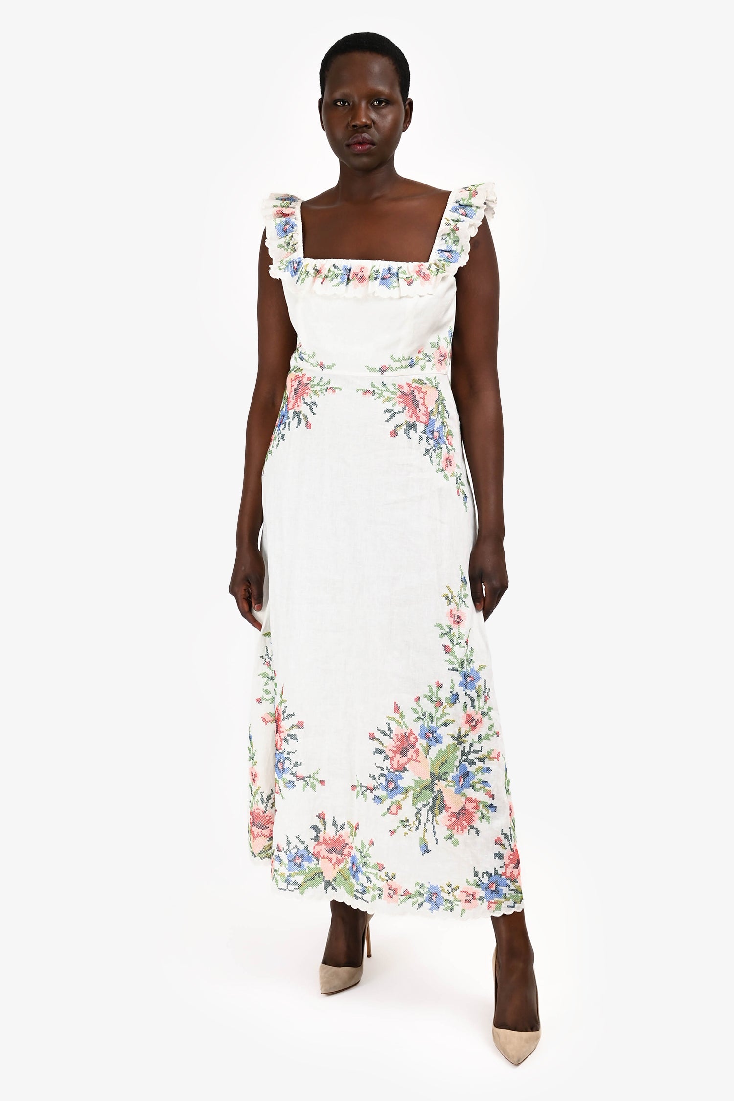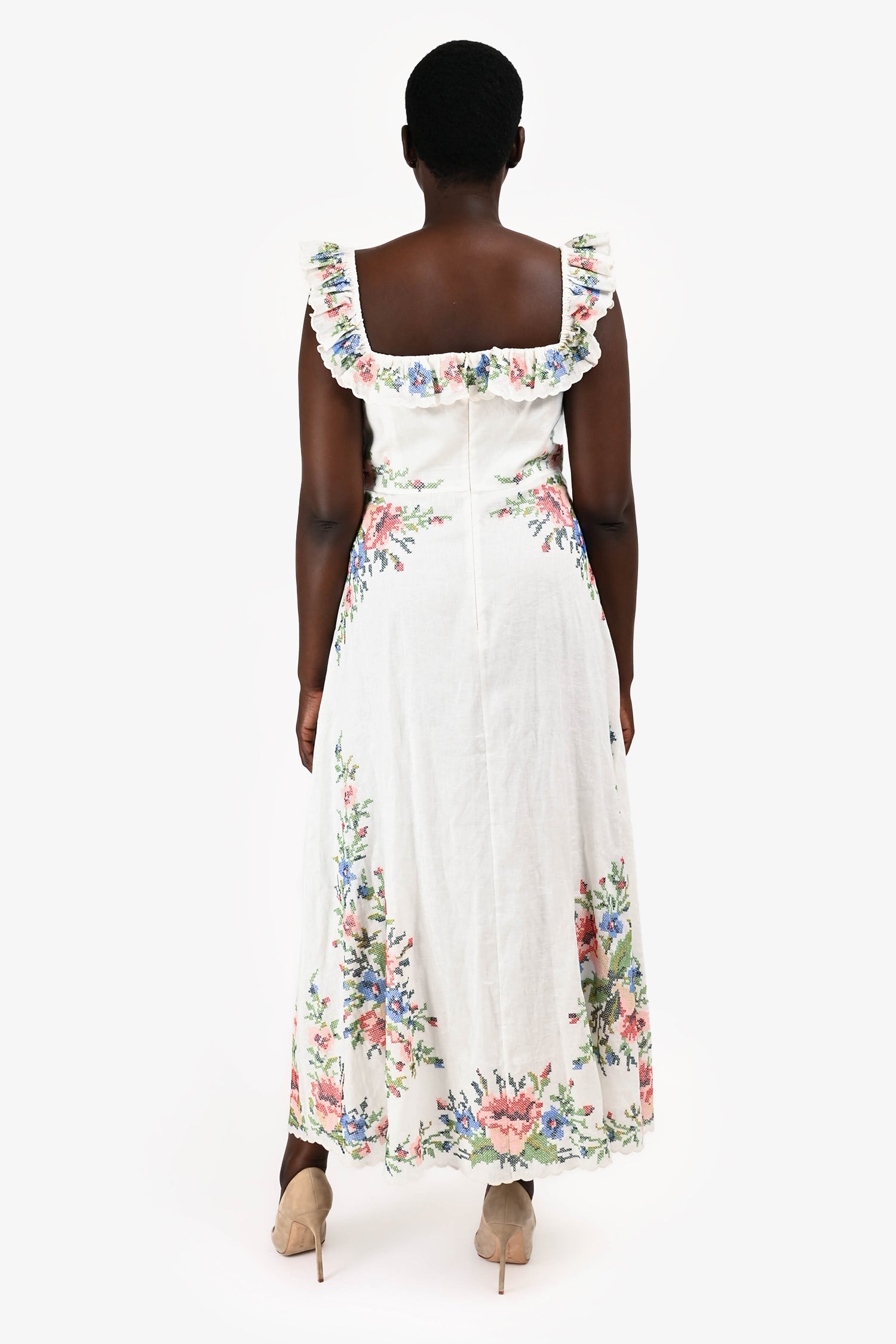 Refresh availabilityZimmermann White Floral Embroidered Details Sleeveless Midi Dress. Square neckline. Sleeveless design. Back zip closure. Tonal stitching.
