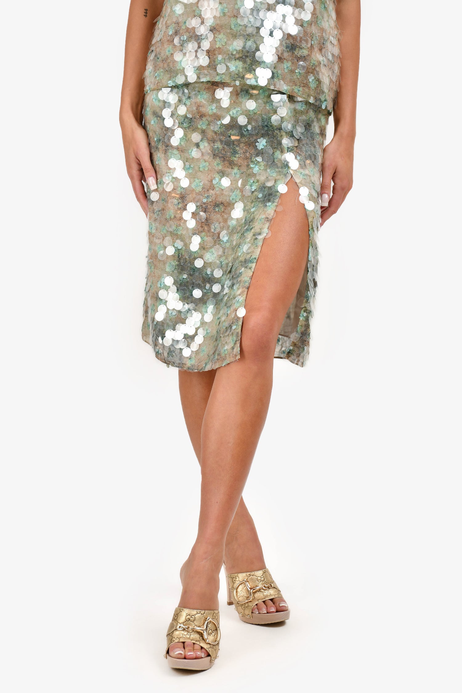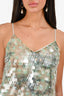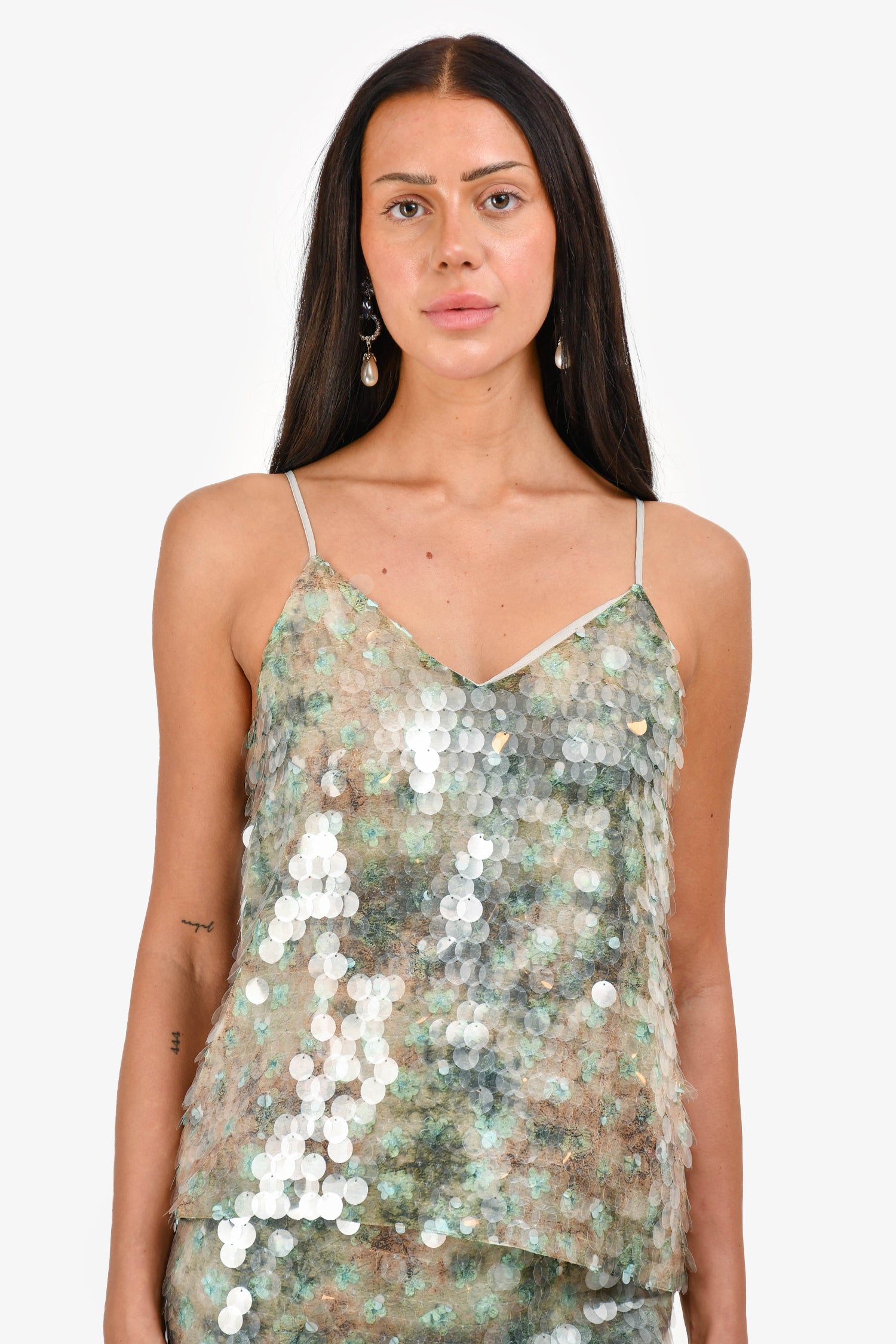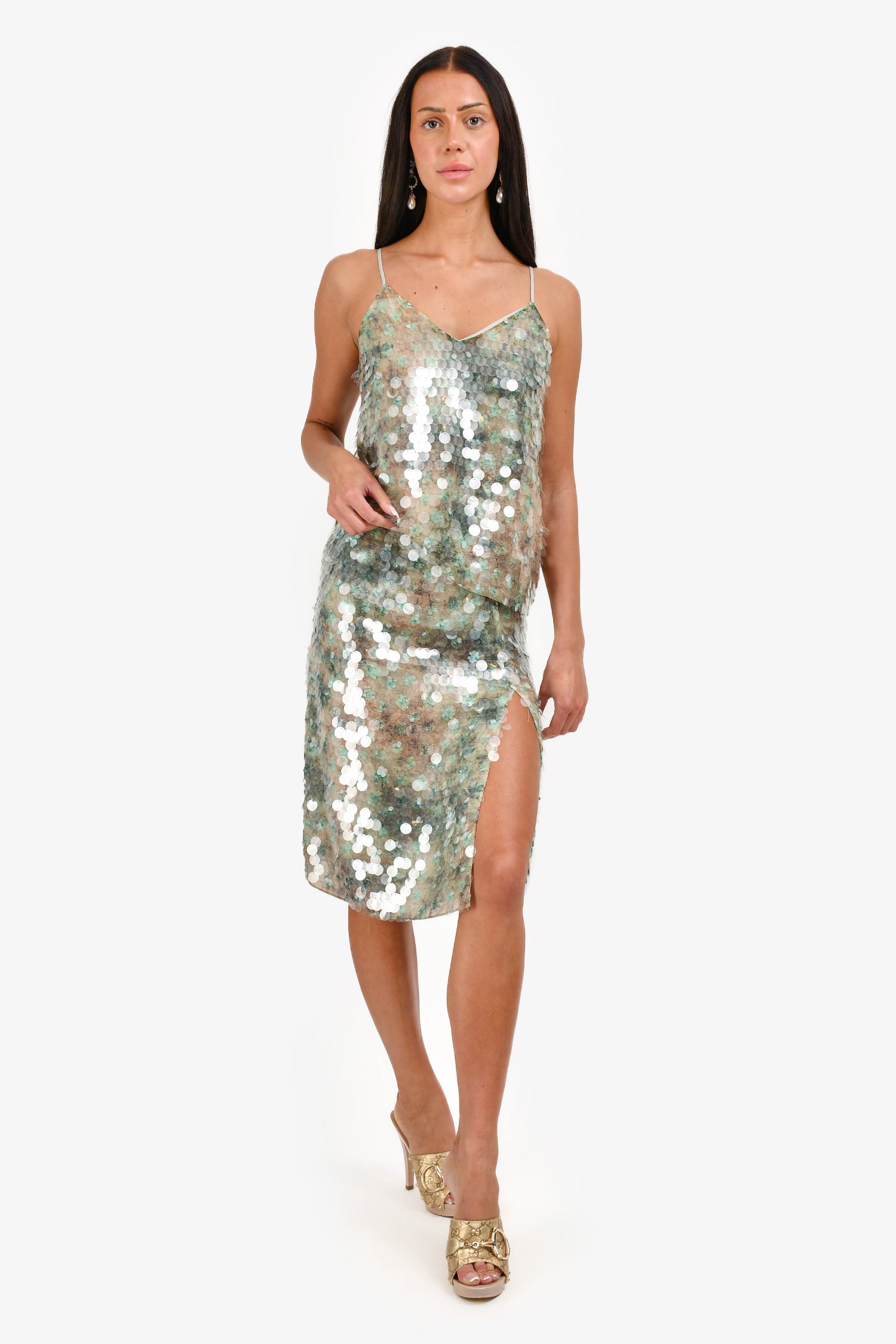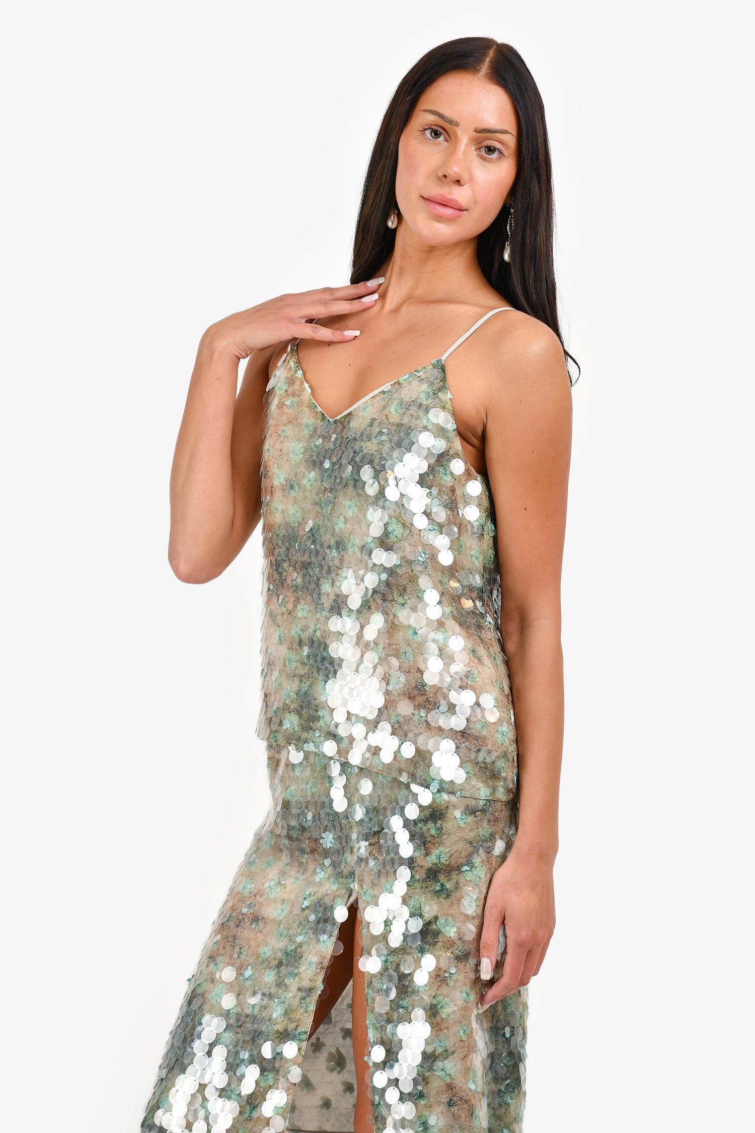 Refresh availability12 Storeez Green Sequin Tank Top + Midi Skirt Set. All-over shimmering green sequin embellishment. Sleeveless tank top with V-neckline and pull-on style. High-waisted skirt with elastic waistband and slit on the side. Fully lined. Tonal stitching.