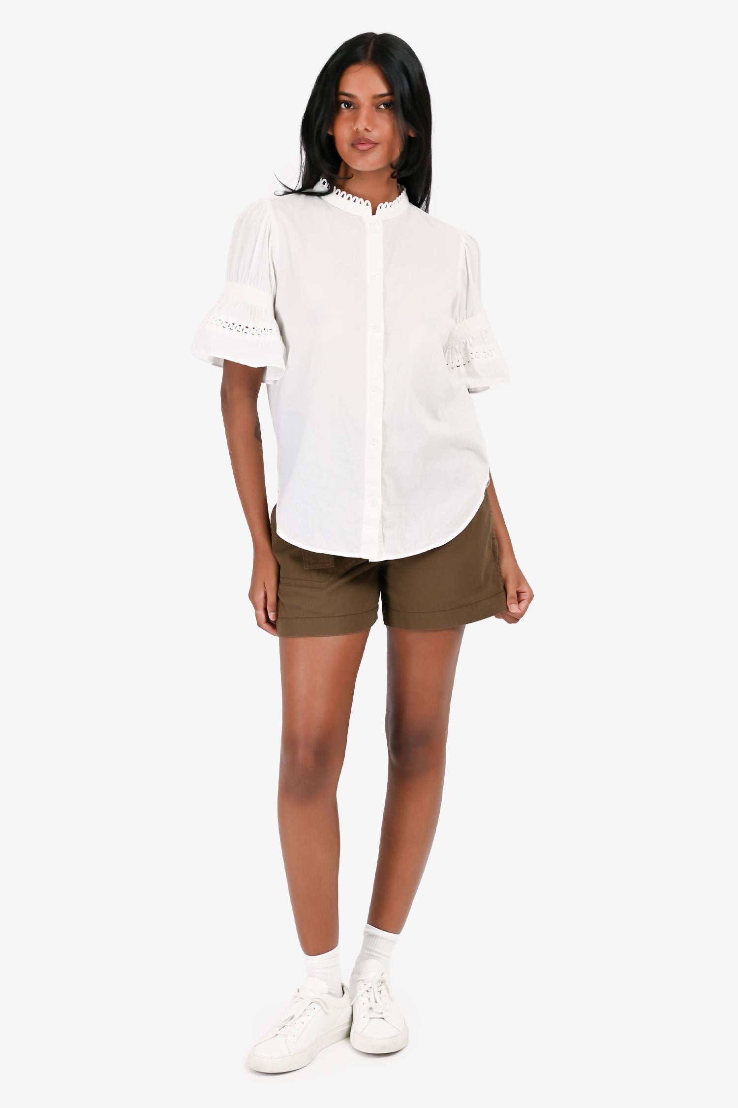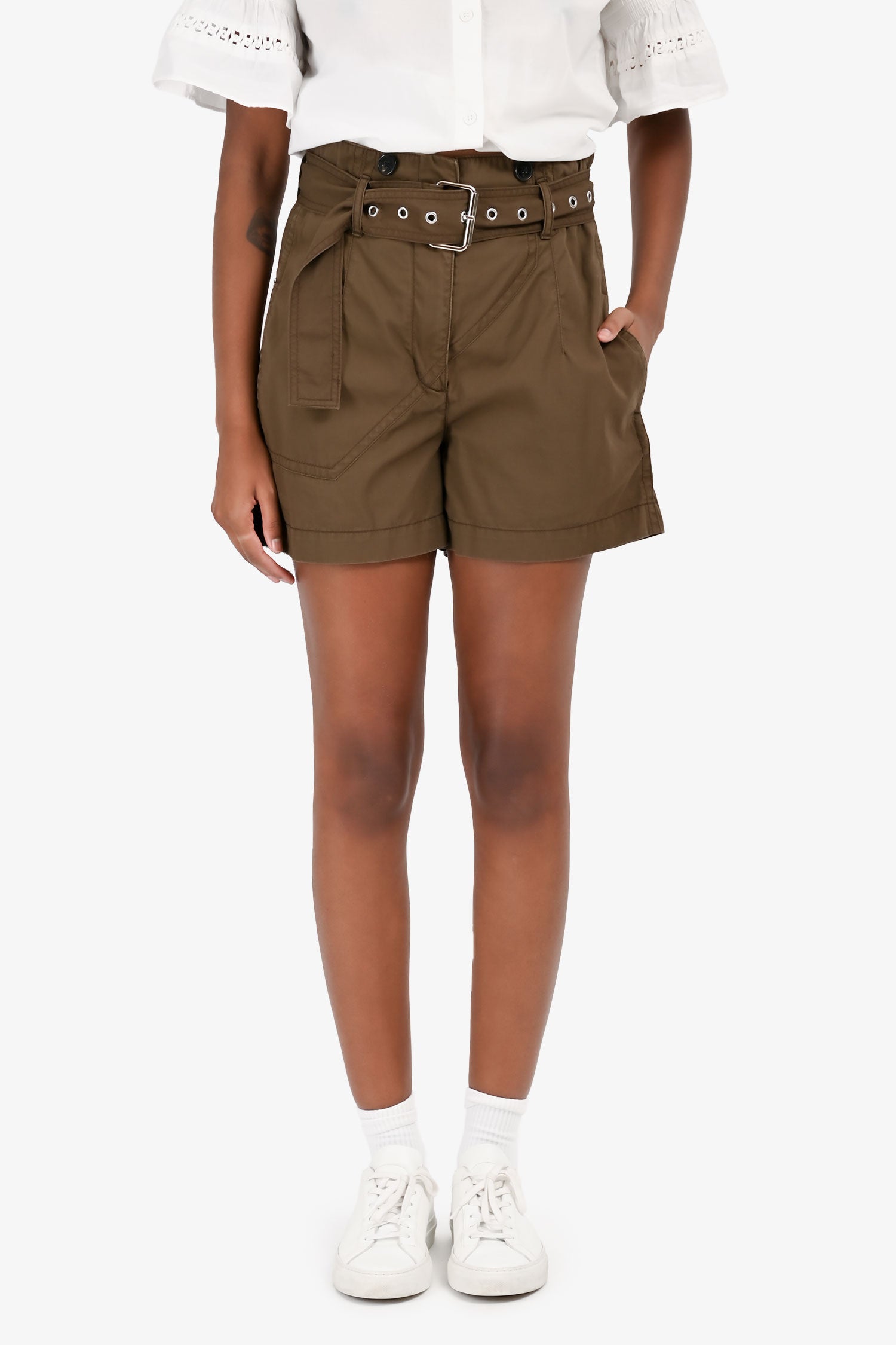 Refresh availability3.1 Phillip Lim Army Green Belted Shorts. Front zip and hook-up closure. Front and rear pockets. Waist belt with buckle closure. Silver-tone hardware.