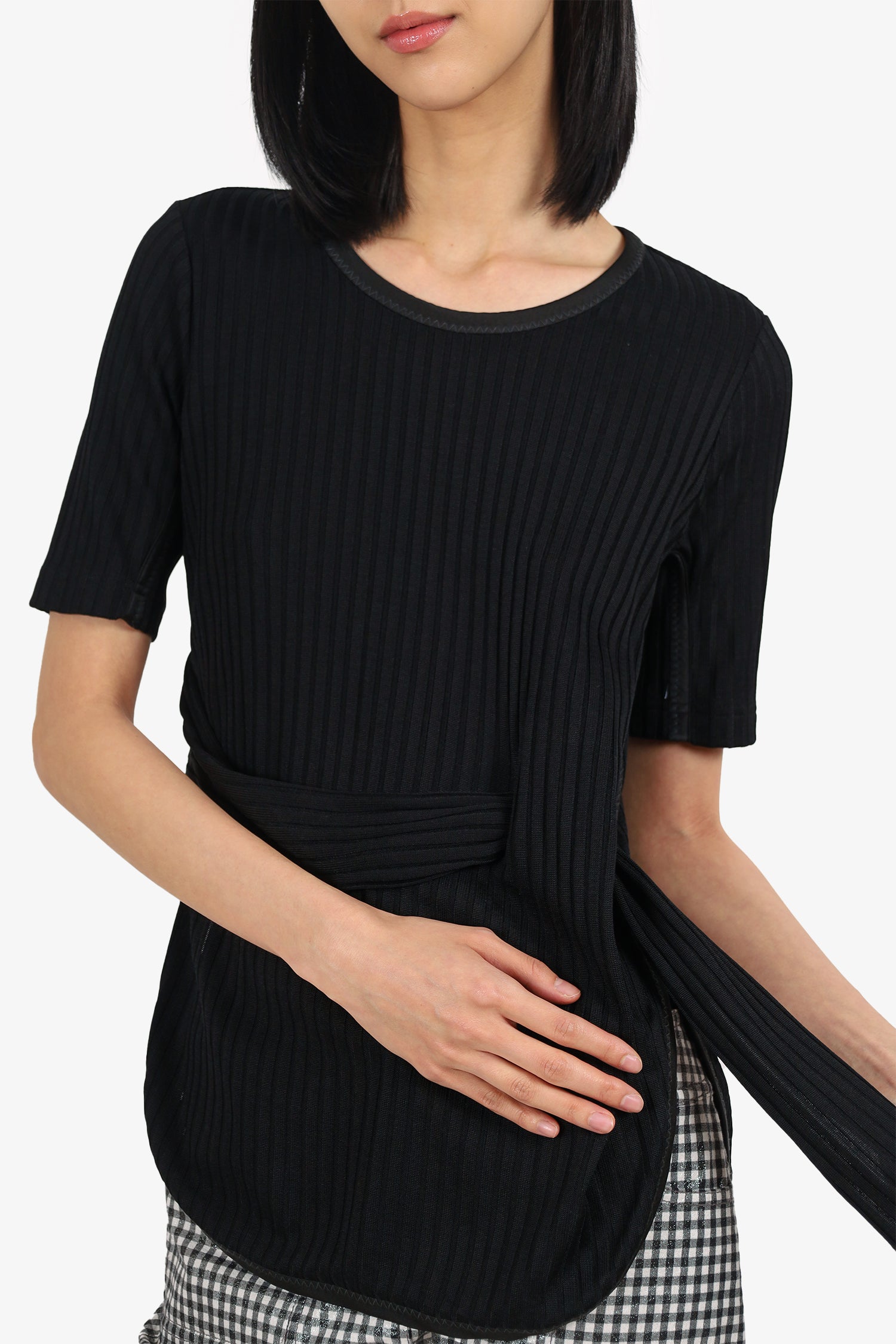 Refresh availability3.1 Phillip Lim Black Ribbed Belt T-Shirt. Pull-on. Round neckline. Pull-through belt detail at waistline. Tonal stitching.