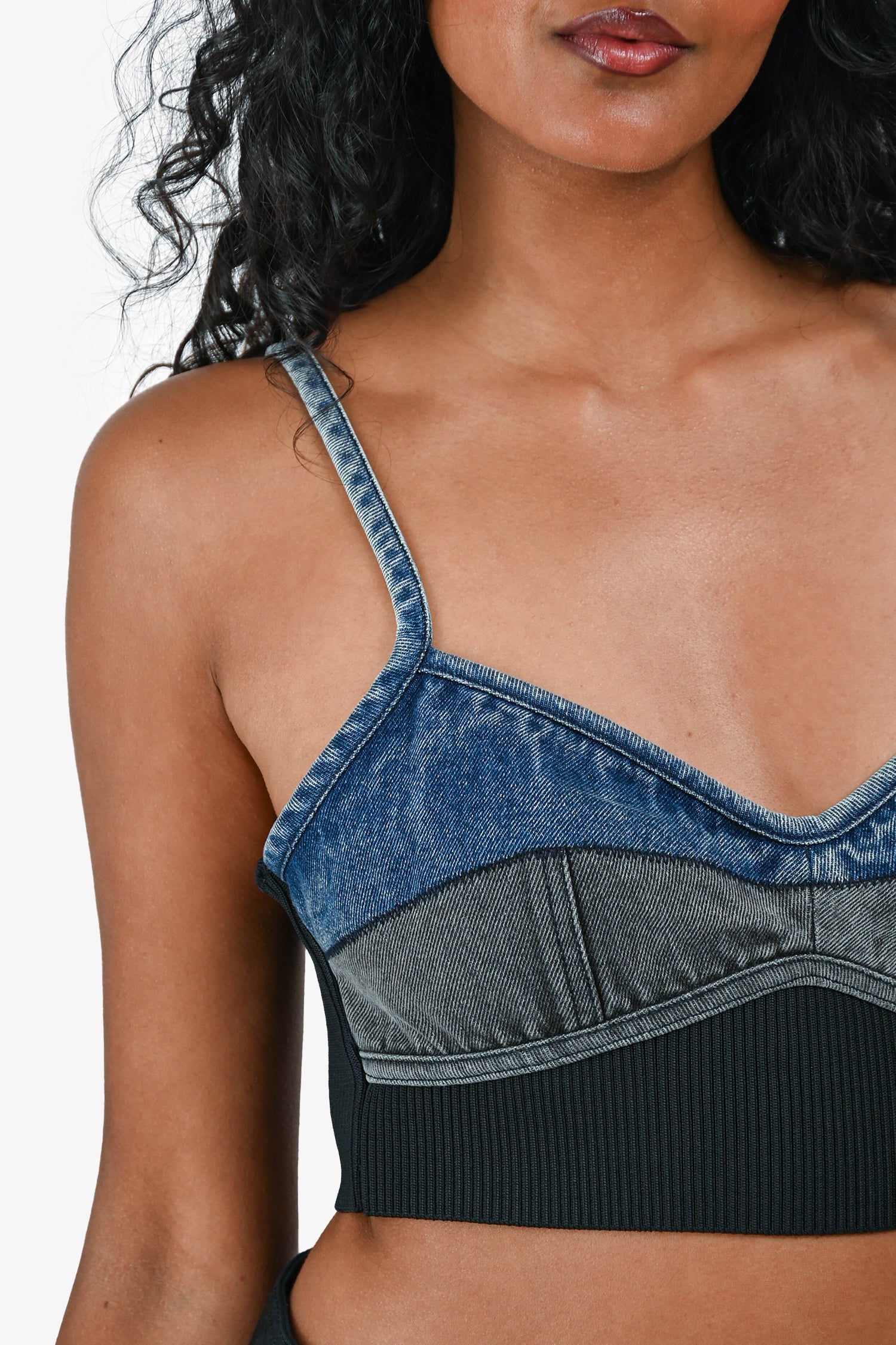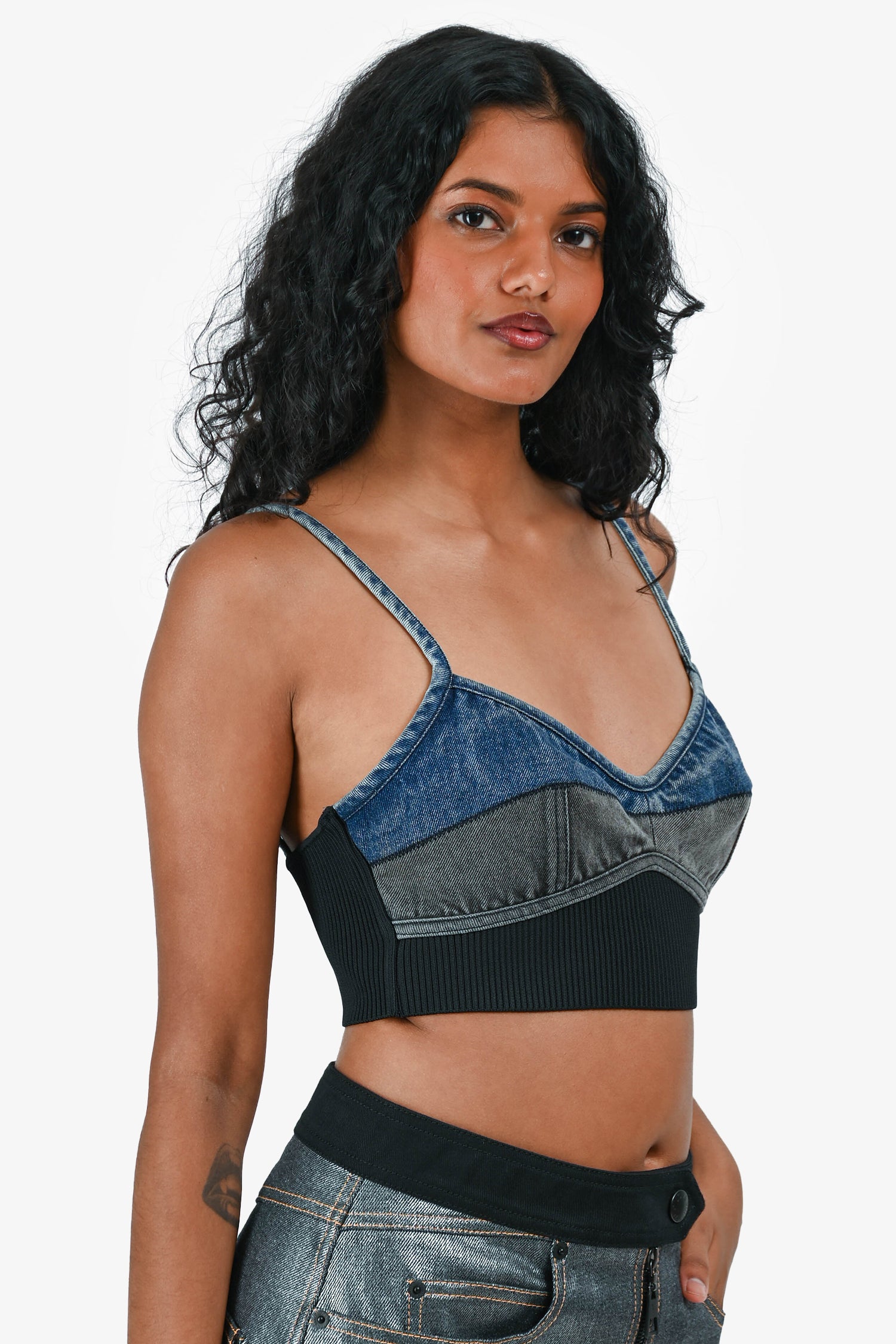 Refresh availability3.1 Phillip Lim Blue/Grey Denim Bralette Top. Pull-on. Elasticized back and hem. Tonal stitching.