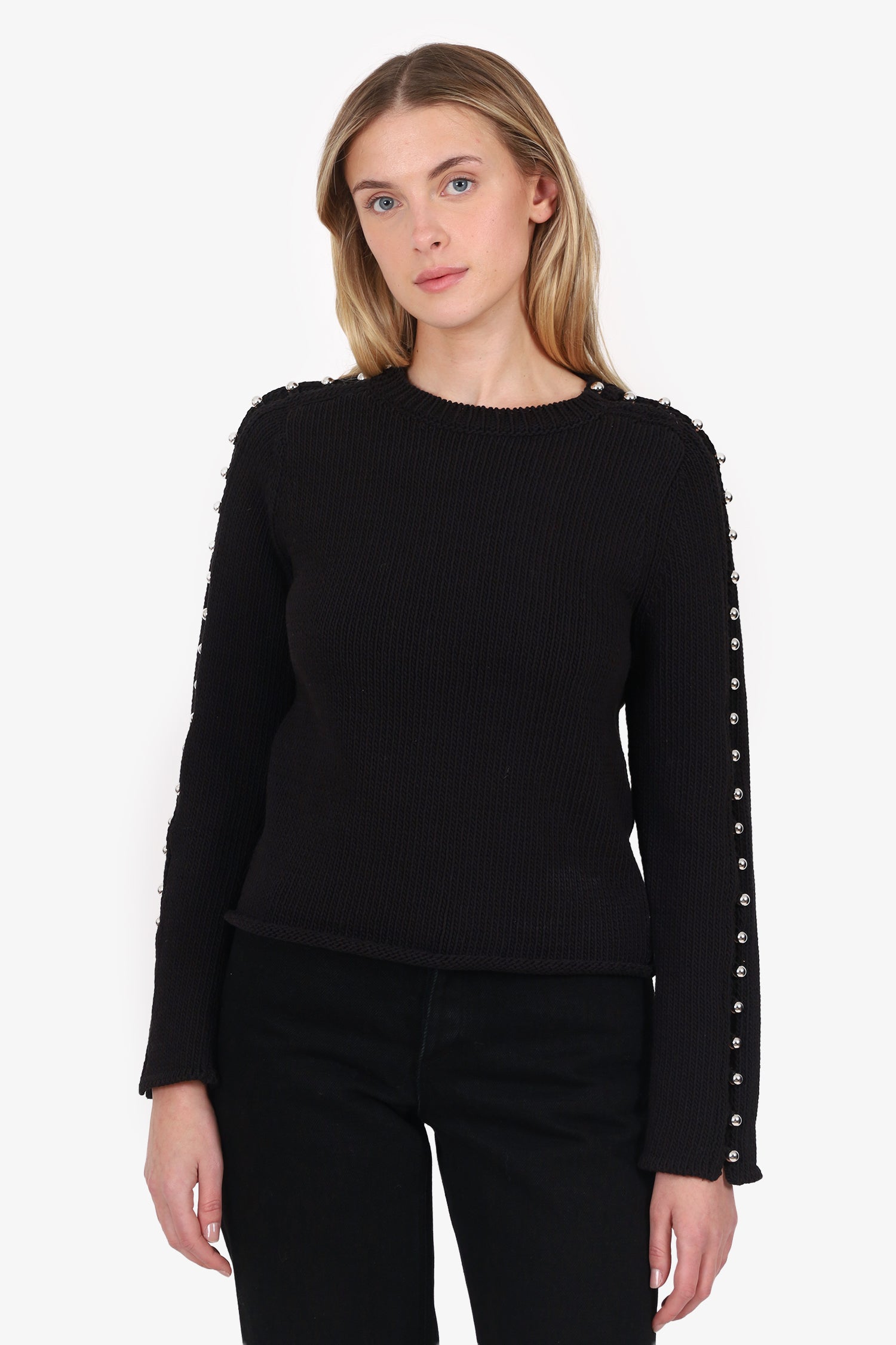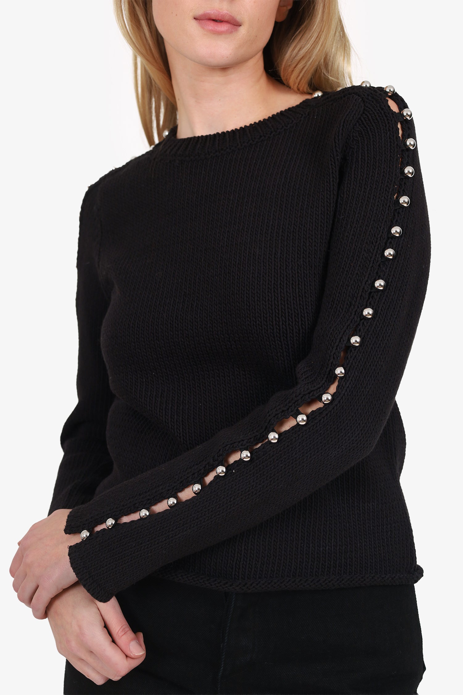 Refresh availability3.1 Phillip Lim Black Studded Knit Sweater. Pull-on. Round neckline. Cut-out detailing on sleeves. Silver-tone hardware. Tonal stitching.