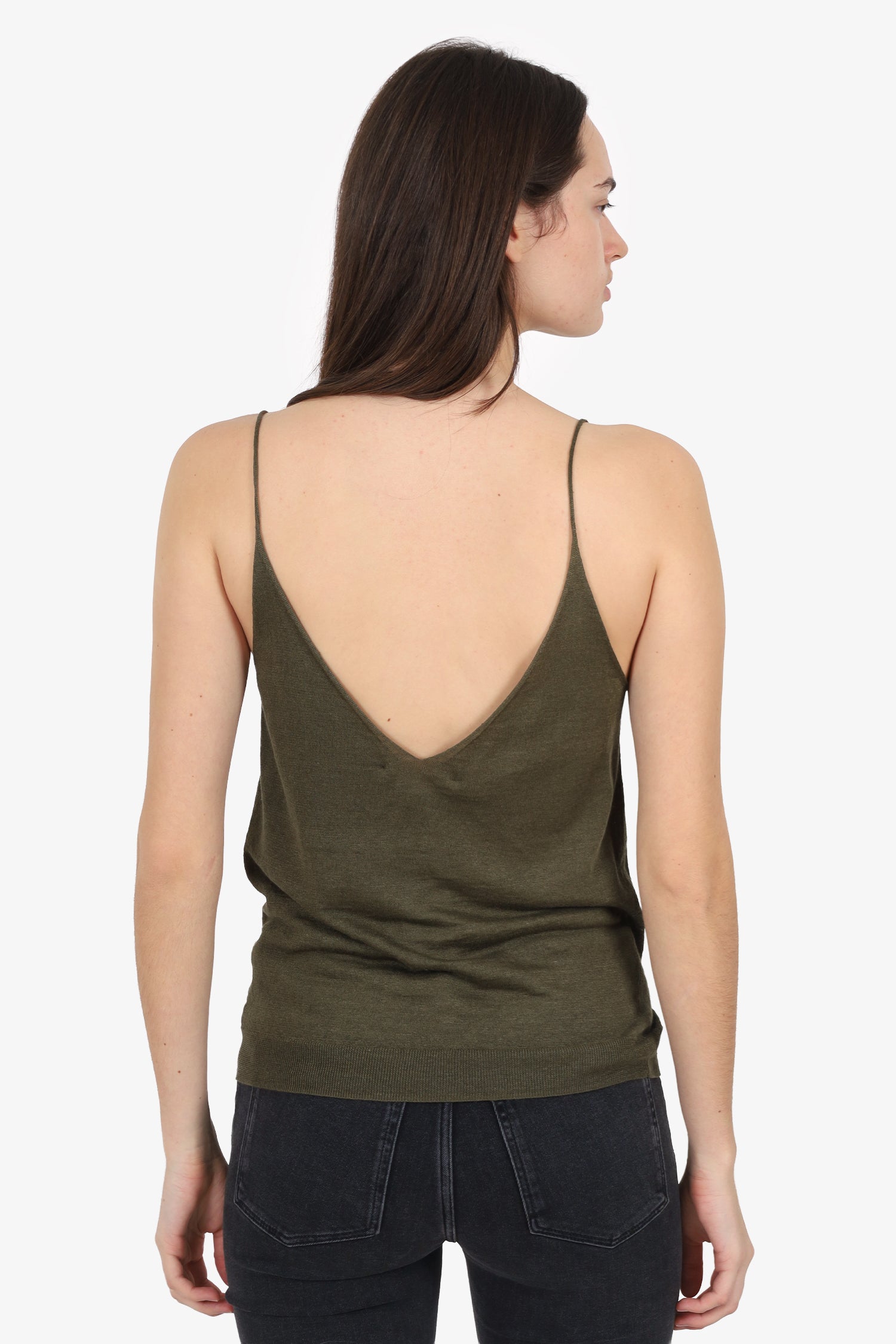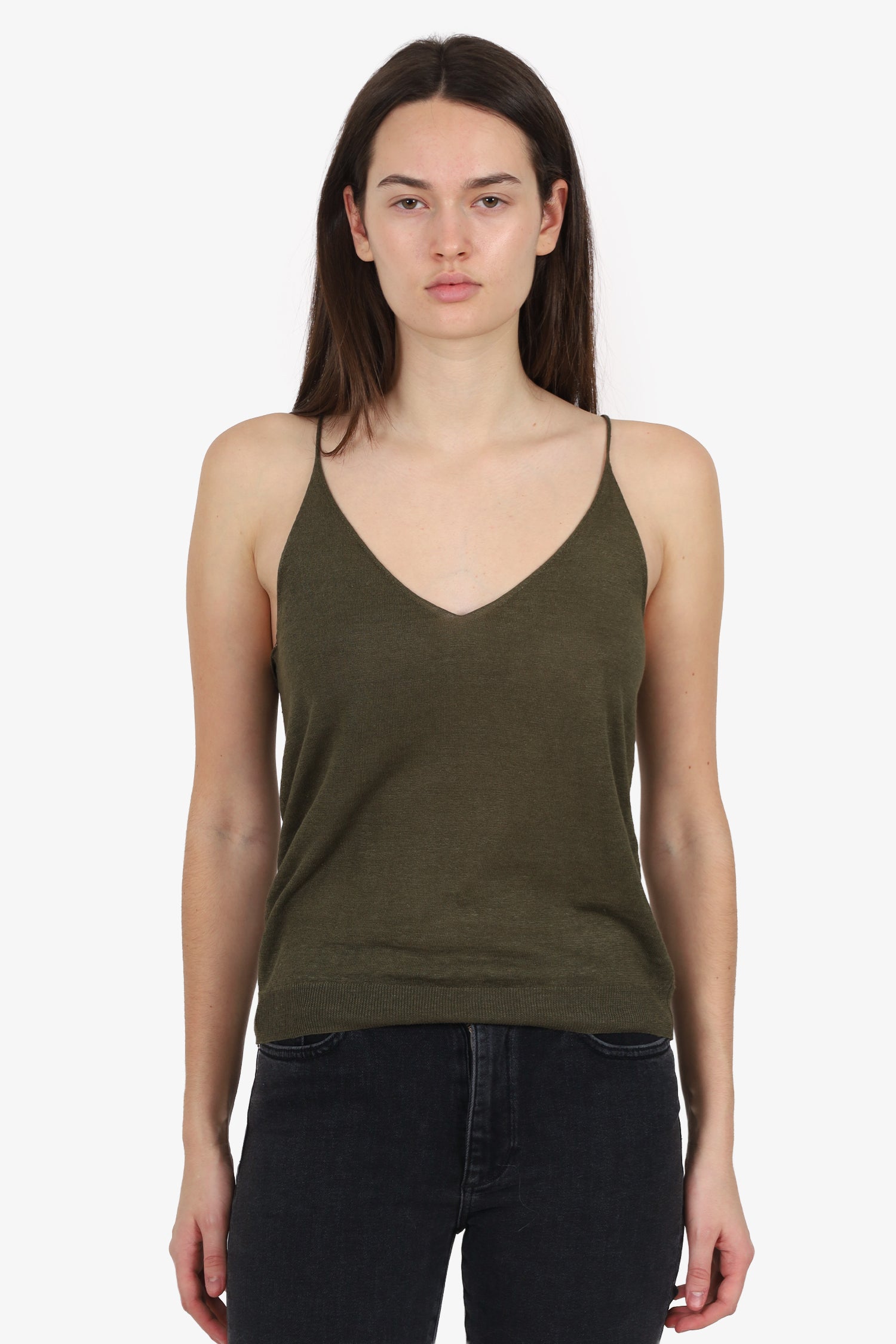 Refresh availability6397 Army Green Spaghetti Strap Tank Top. Pull-on. V-neckline. Tonal stitching.