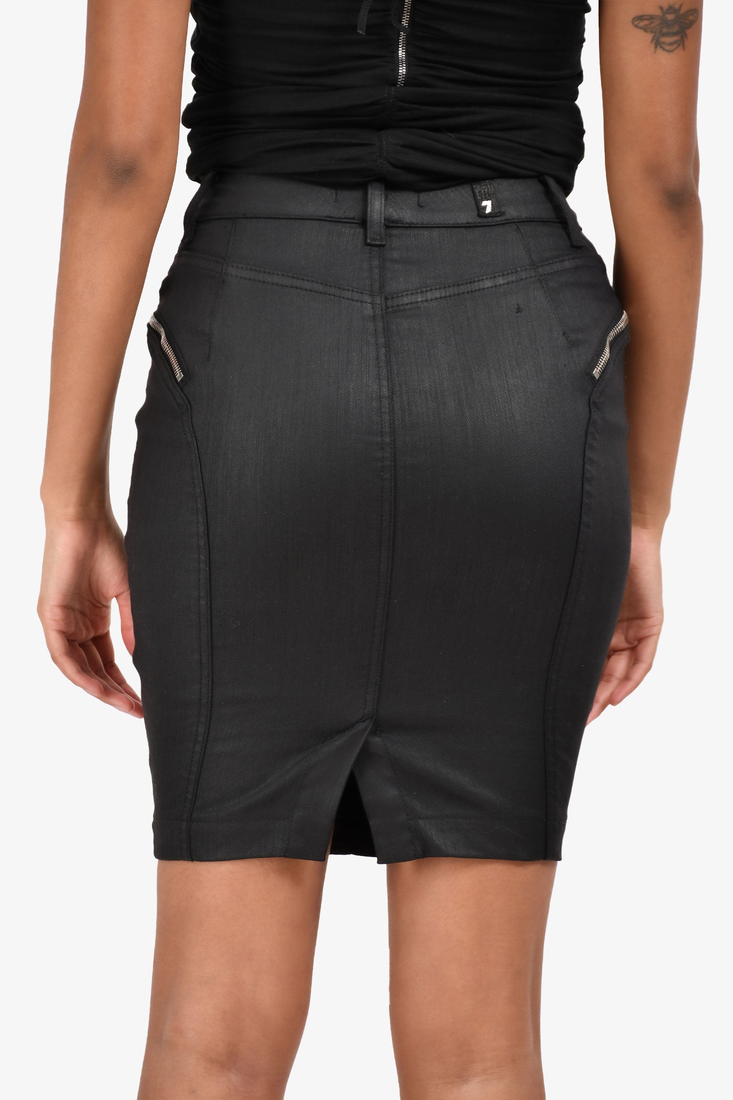 Refresh availability7 For All Mankind Black Coated Denim Fitted Skirt. Front zip-fly and button closure. Two side faux zippered pockets. Silver-tone hardware. Tonal stitching.