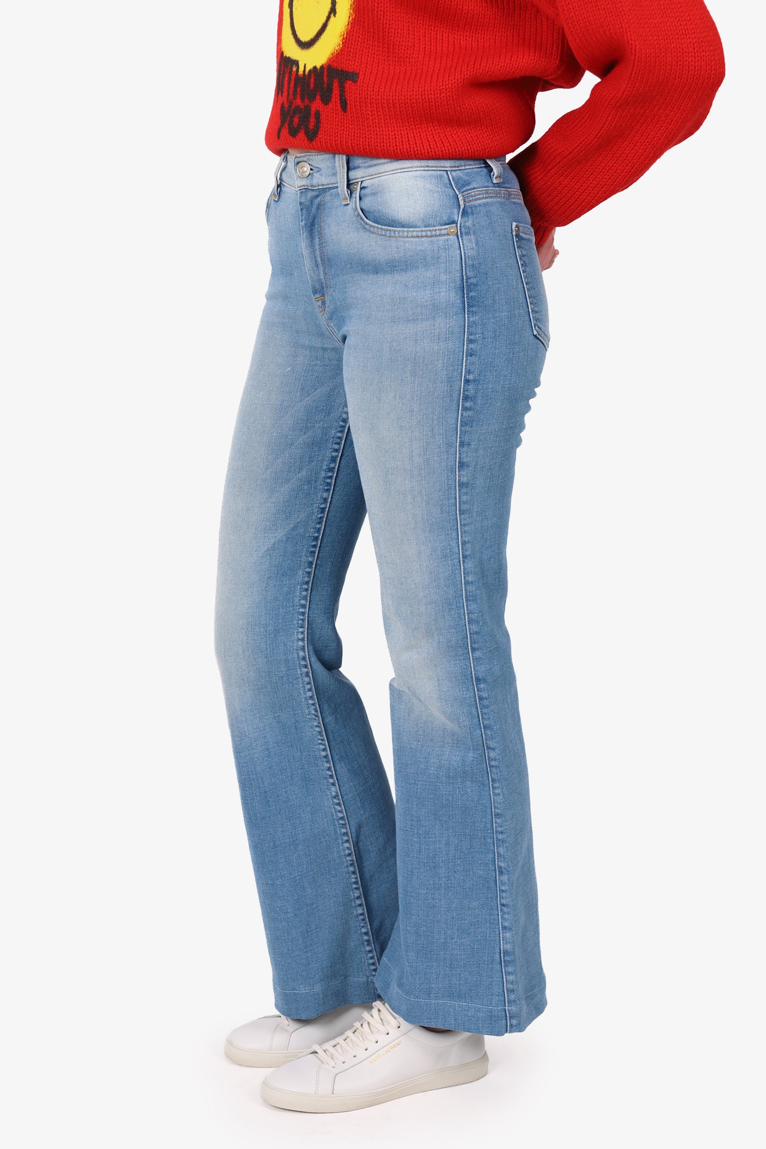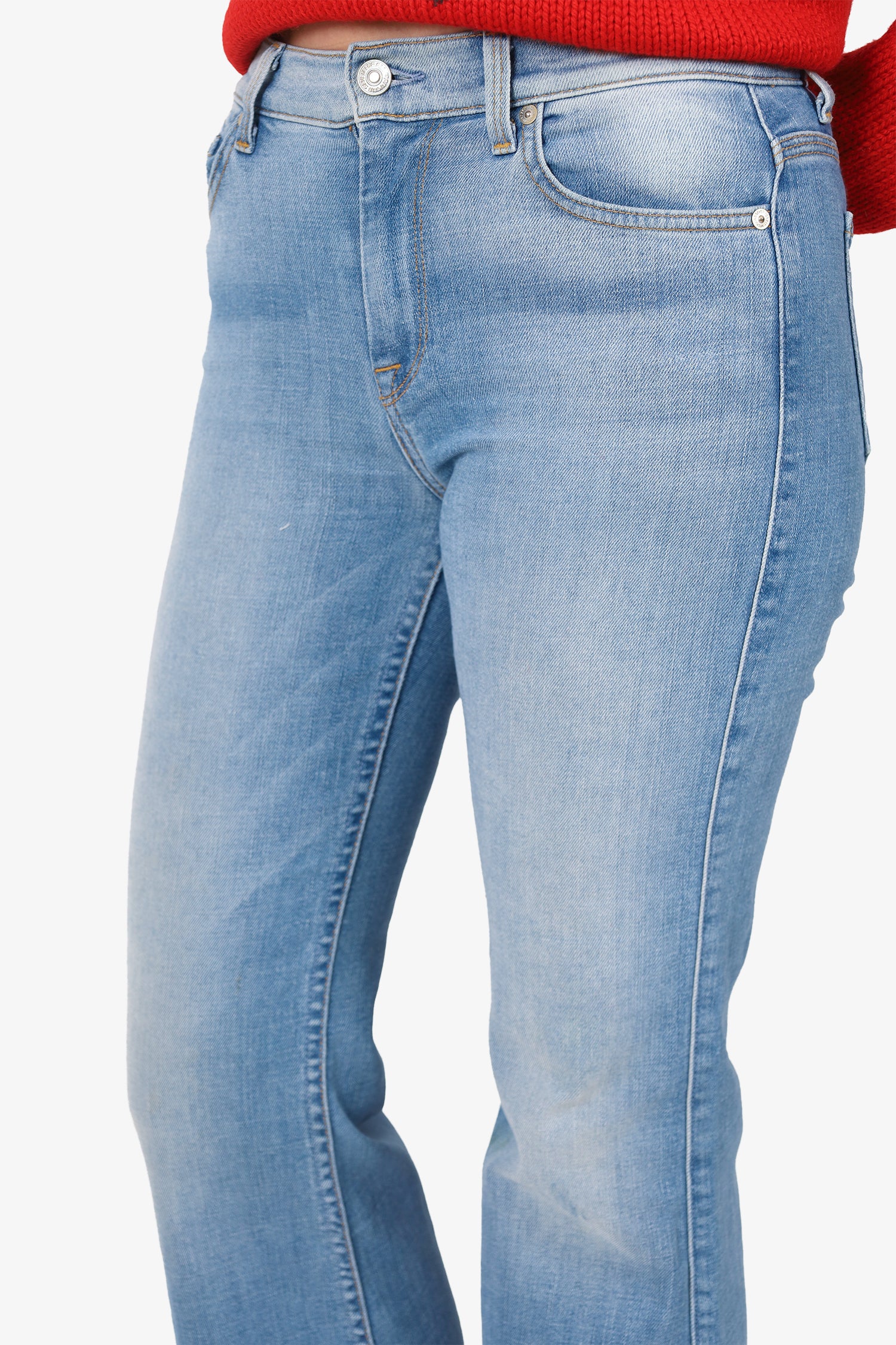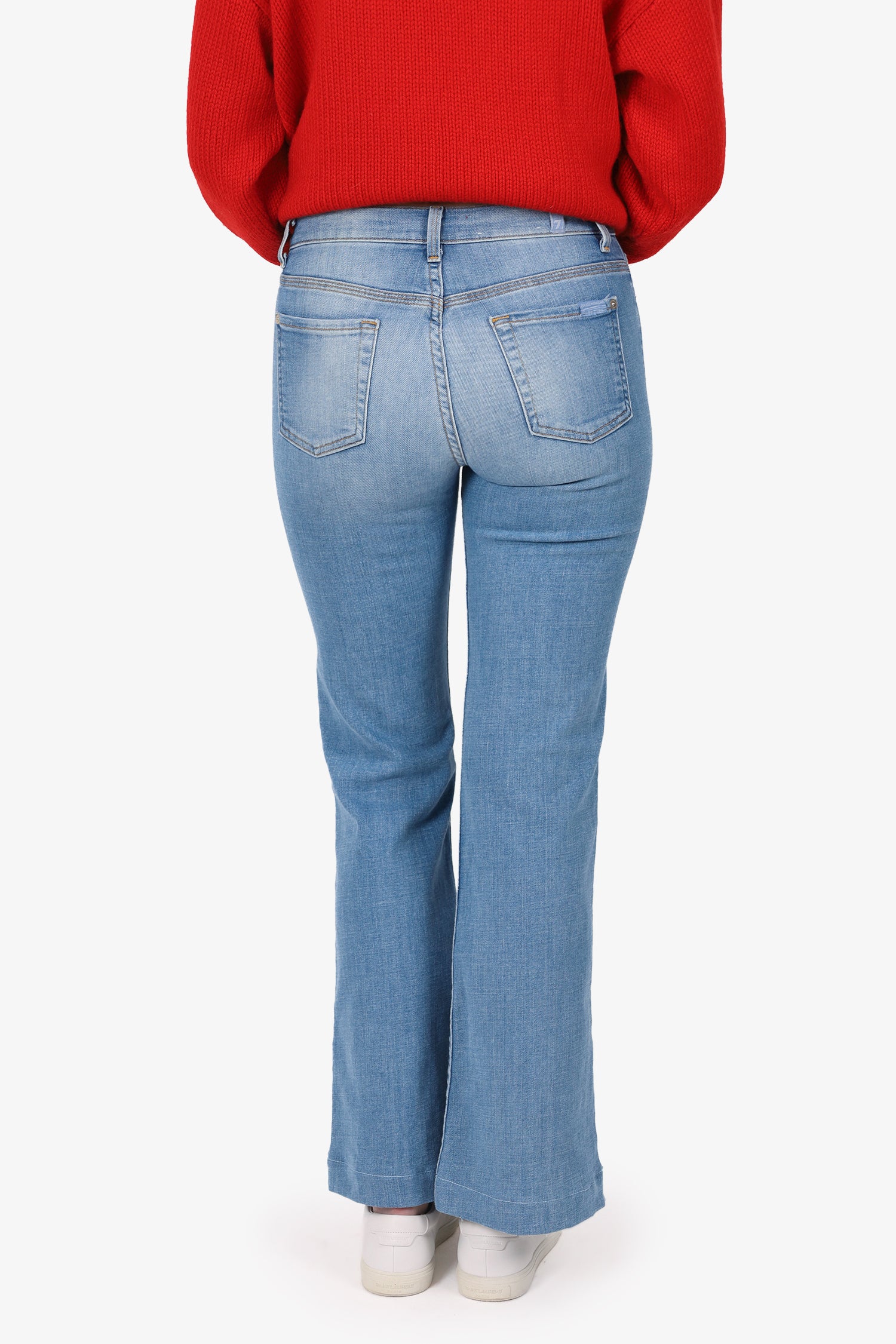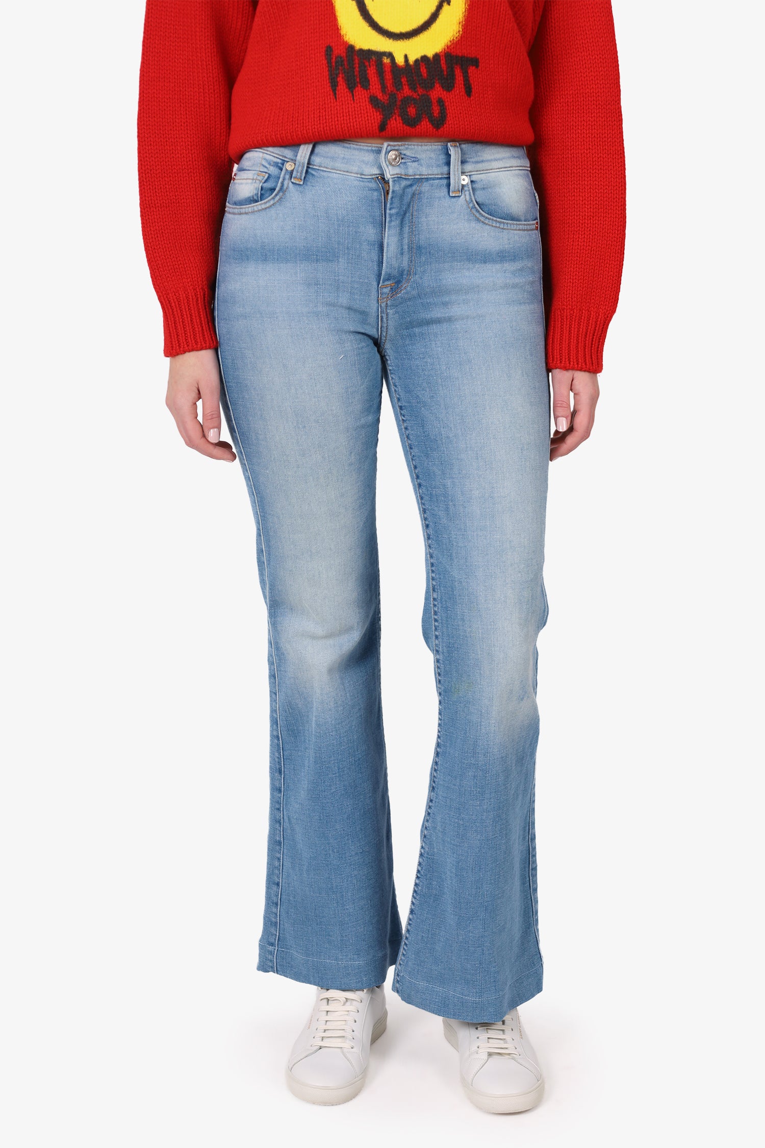 Refresh availability7 For All Mankind Blue Wide Leg Jeans. Slip on. Front zip with button-up closure. Waistband belt-loops. 5 exterior pockets; 2 front slip, 1 mini compartment, and 2 rear slip. Brass and silver-tone hardware. Contrast and tonal stitching.