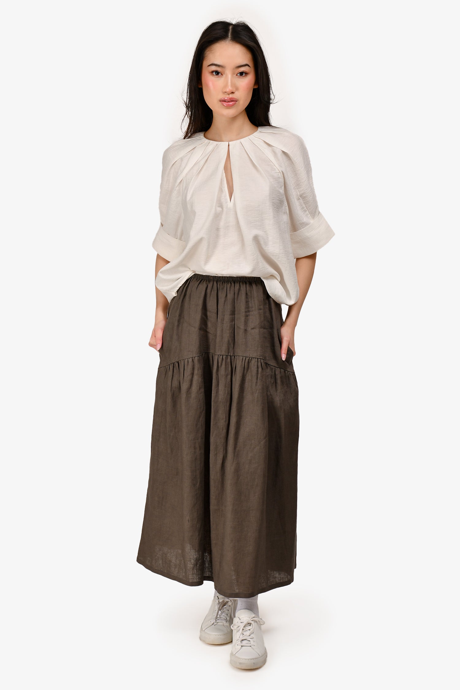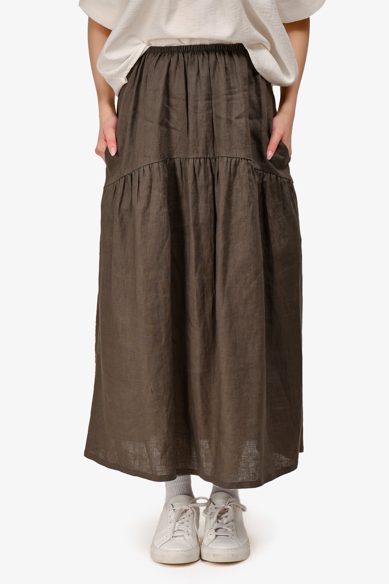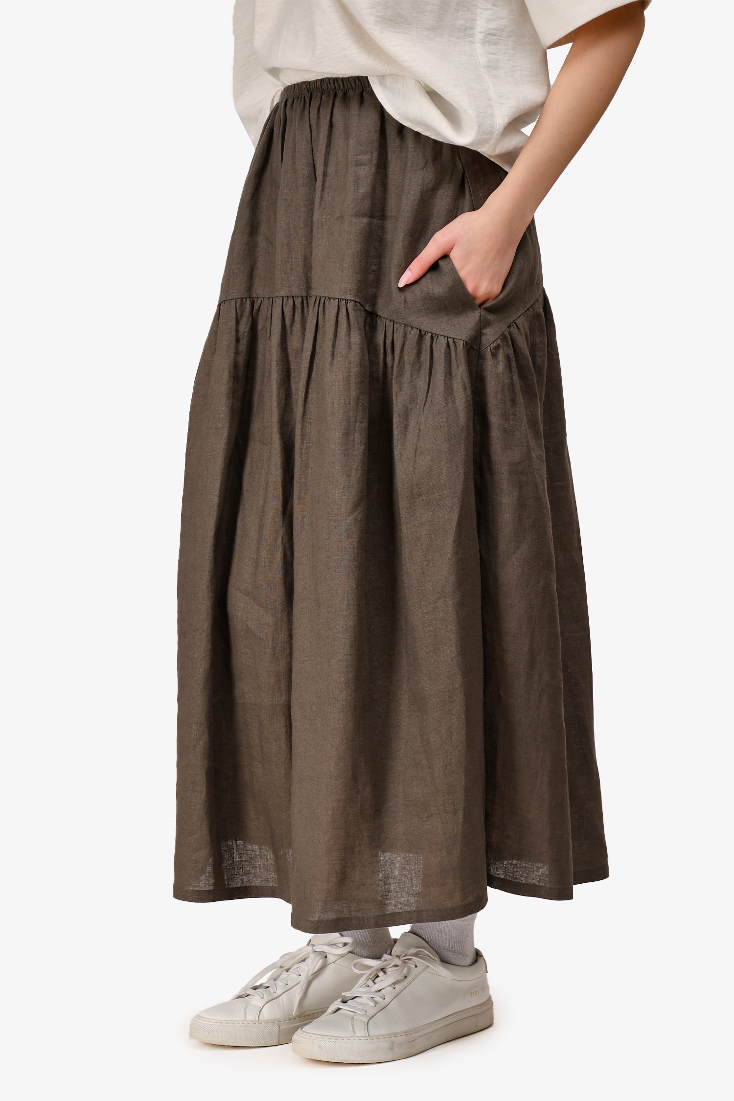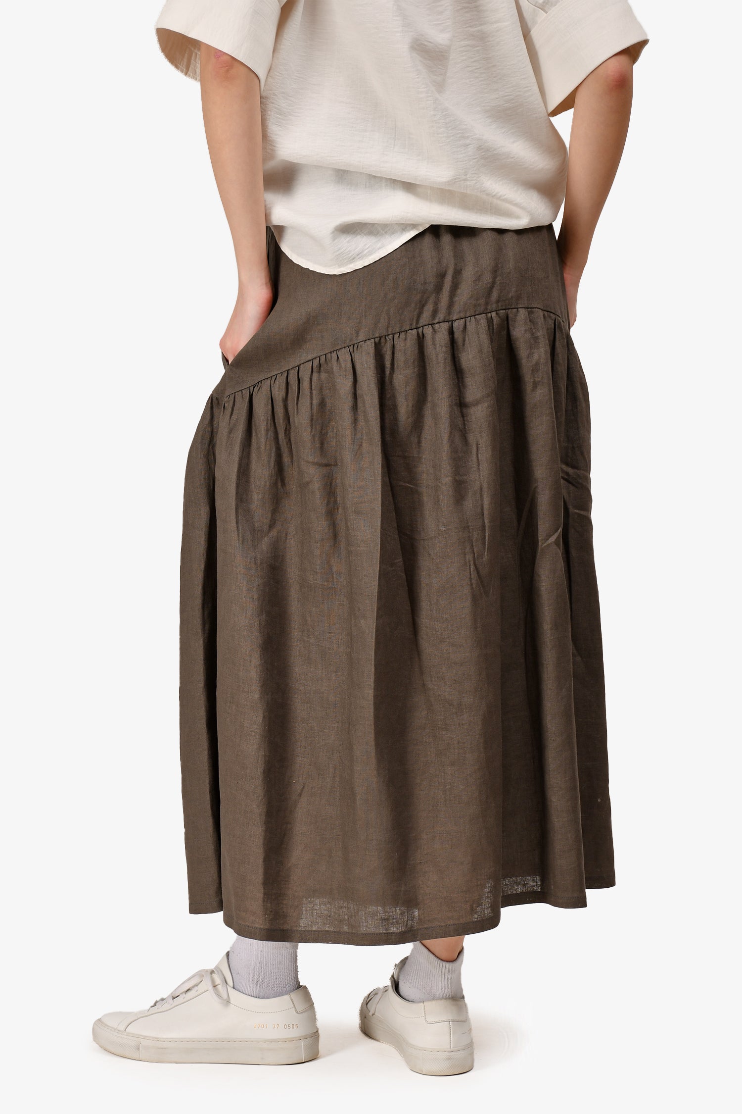 Refresh availabilityA Bronze Age Brown Linen A Line Skirt. Two front pockets. Ruches at the waist. Tonal stitching.