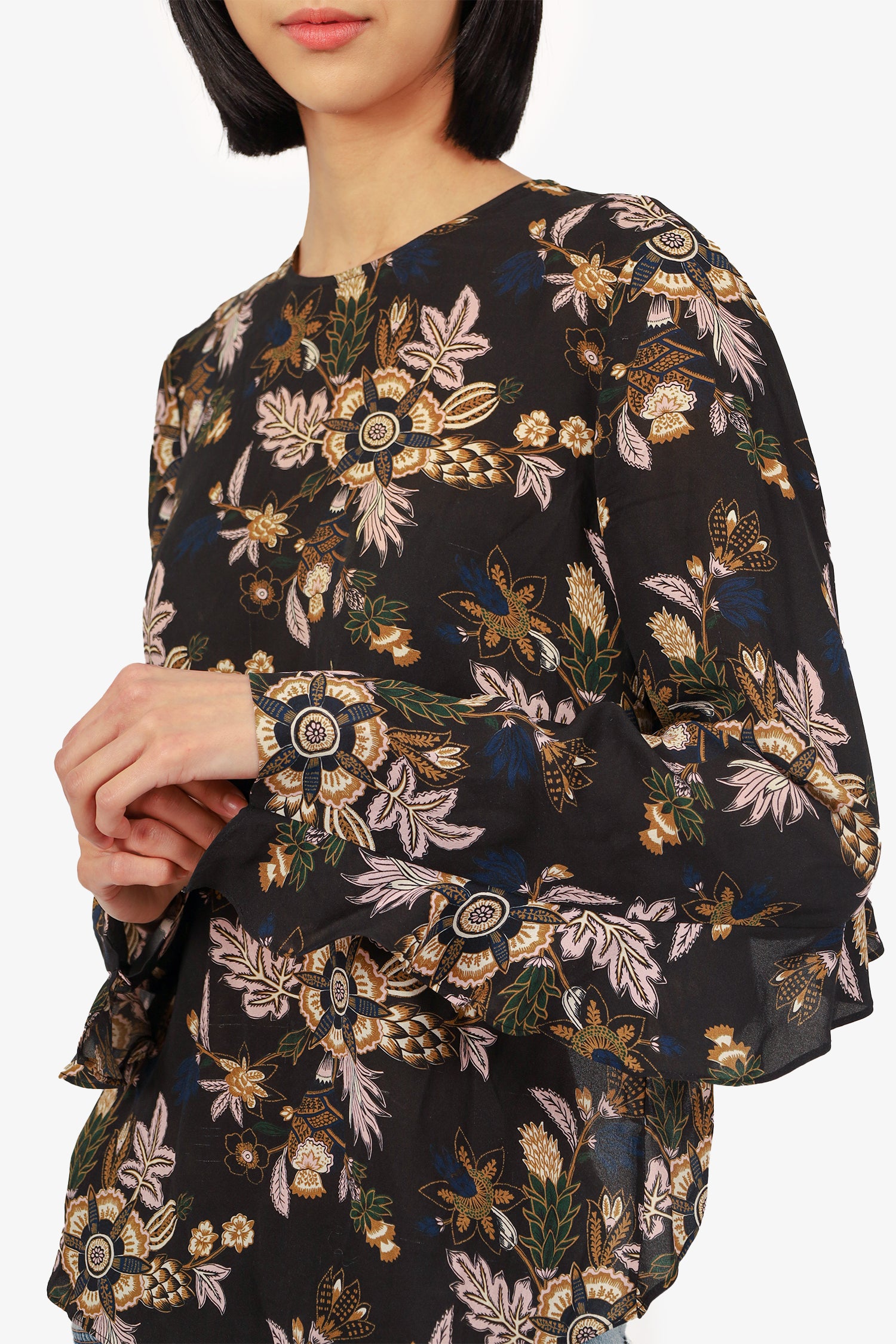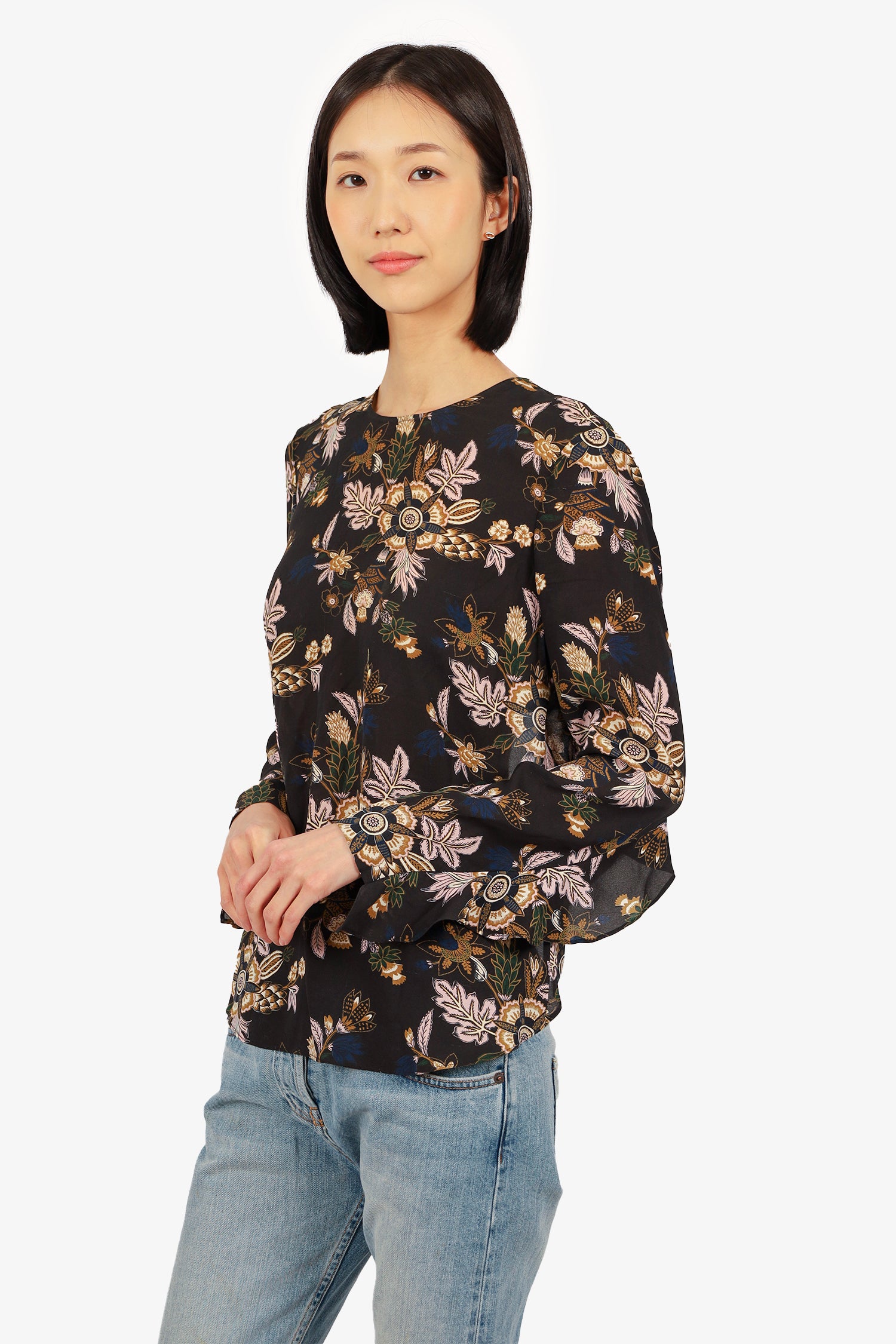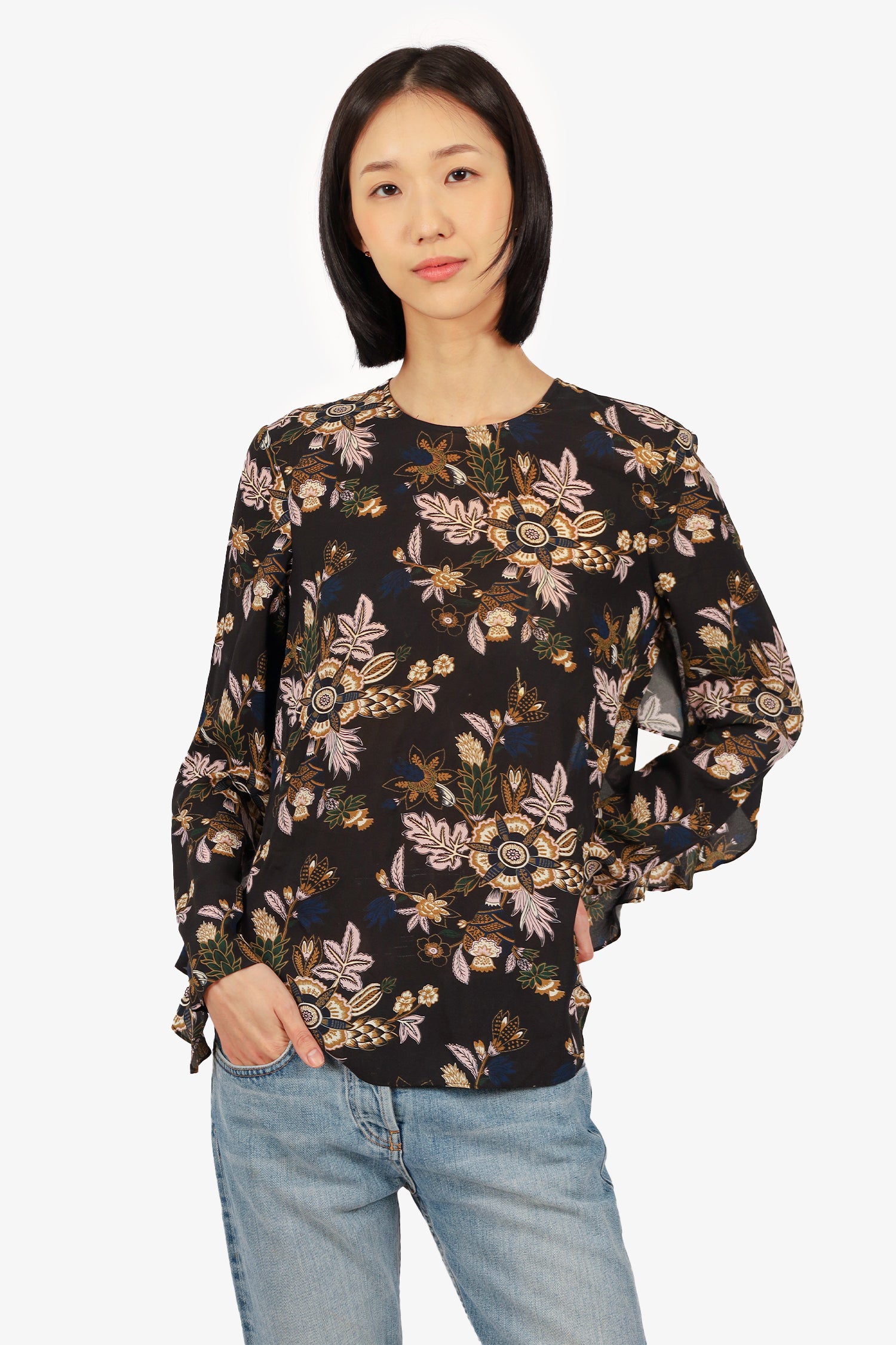 Refresh availabilityA.L.C Black Floral Open Back Long Sleeve Top. Round neckline. Rear hook closure. Tonal stitching.