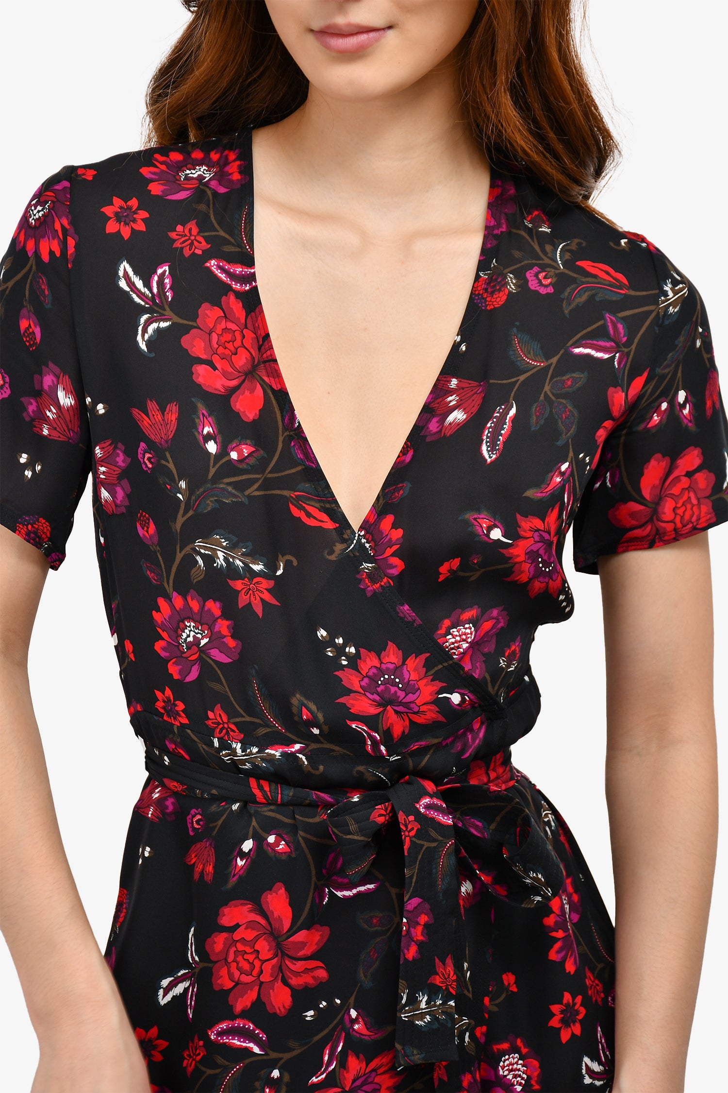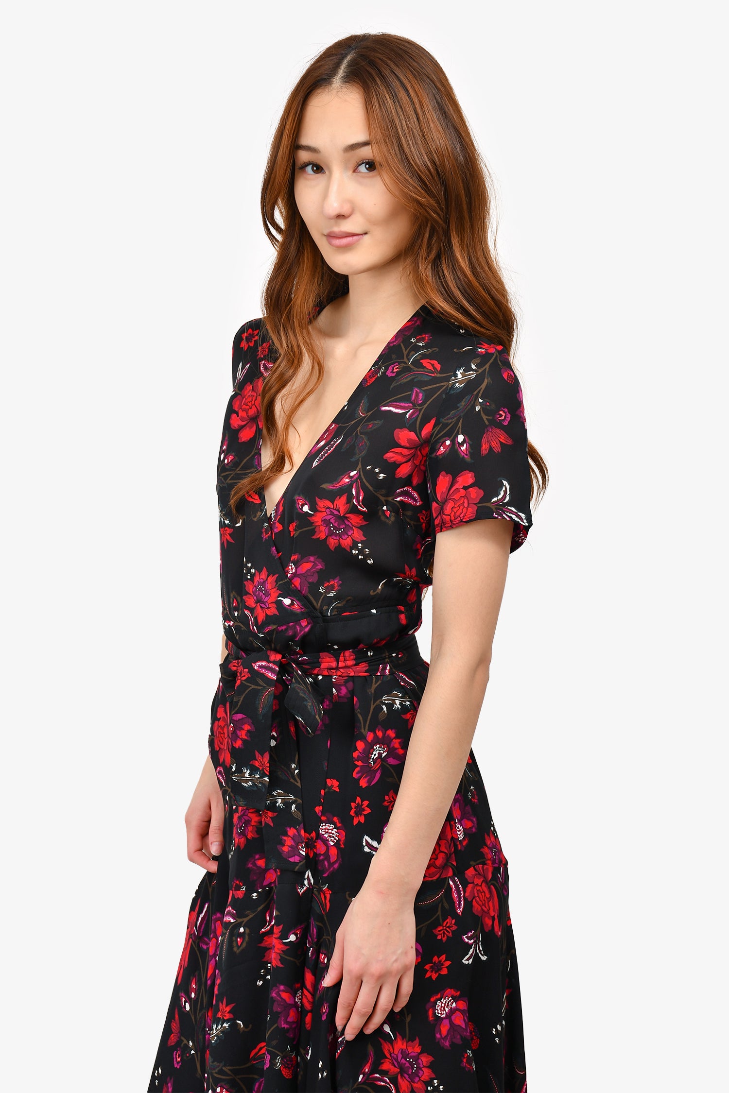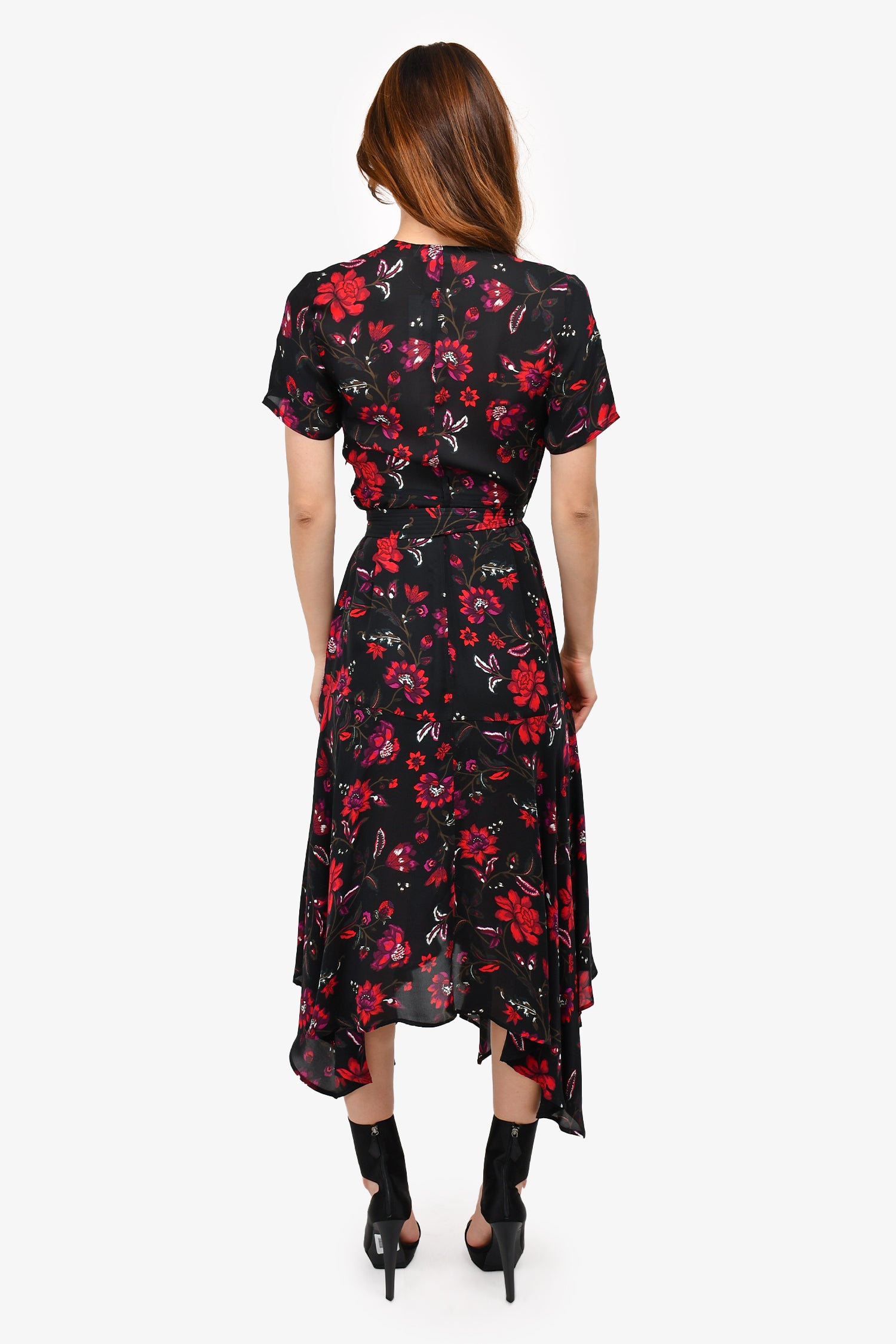Refresh availabilityA.L.C. Black/Red Floral Silk Wrap Midi Dress. V neck. Tonal stitching.
